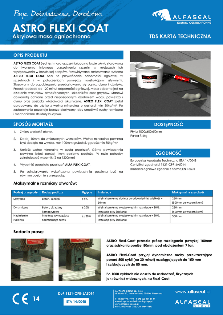 . OPIS PRODUKTU ASTRO FLEXI COAT Seal jest masą uszczelniającą na bazie akrylu stosowaną do tworzenia liniowego uszczelnienia szczelin w miejscach ich występowania w konstrukcji stropów. Przewidywane zastosowanie systemu ASTRO FLEXI COAT Seal to przywrócenie odporności ogniowej w szczelinach i w połączeniach pomiędzy konstrukcjami sztywnymi. Stosowany do zapobiegania przedostawaniu się ognia, dymu i dźwięku. Produkt posiada do 120 minut odporności ogniowej. Masa odporna jest na działanie warunków atmosferycznych, szkodników oraz grzybów. Stanowi doskonałą ochronę przed niepożądanym działaniem wody, powietrza i dymu oraz posiada właściwości akustyczne. ASTRO FLEXI COAT został opracowany do użytku z wełną mineralną o gęstości min 80kg/m3. Po zastosowaniu pozostaje bardzo elastyczny, aby umożliwić ruchy termiczne i mechaniczne struktury budynku. . SPOSÓB MONTAŻU DOSTĘPNOŚĆ Płyta 1000x600x50mm Farba 7,4kg 1. Zmierz wielkość otworu 2. Dodaj 10mm do zmierzonych wymiarów. Wełna mineralna powinna być docięta na wymiar, min 100mm grubości, gęstość min 80kg/m3 3. Umieść wełnę mineralną w pustą przestrzeń. Górna powierzchnia powinna leżeć poniżej 1mm poziomu podłoża. W razie potrzeby zainstalować wspornik (2 na 1200mm) 4. Wypełnić pozostałą przestrzeń ALFA FLEXI COAT. 5. Po zainstalowaniu wykończona powierzchnia powinna być na równym poziomie z przegrodą. ZGODNOŚĆ Europejska Aprobata Techniczna ETA 14/0048 Certyfikat zgodności 1121-CPR-JA5014 Badania ogniowe zgodnie z normą EN 13501 Maksymalne rozmiary otworów: Rodzaj przegrody Rodzaj podłoża Ugięcie Instalacja Maksymalna szerokość Statyczna Beton, kamień ± 5% Wełna kamienna docięta do odpowiedniej wielkość + 10mm 250mm (500mm ze wspornikiem) Dynamiczna Beton, okładziny kompozytowe Inne typy wymagające nadmiernego ruchu ± 20% Wełna kamienna o odpowiednim rozmiarze + 20% , instalacja przy ściskaniu Wełna kamienna o odpowiednim rozmiarze + 20%, instalacja przy ściskaniu. 250mm (500mm ze wspornikiem) Nadmiernie ruchliwa ≥± 20% 500mm Badania prasą: ASTRO Flexi-Coat przeszło próbę rozciągania powyżej 100mm oraz ściskania poniżej 80mm, pod obciążeniem 7 ton. ASTRO Flexi-Coat przyjął dynamiczne ruchy przekraczające ponad 500 cykli (na 30 minut) rozciągających do 150 mm i ściskających do 80 mm. Po 1000 cyklach nie doszło do uszkodzeń, fizycznych jak również widocznych, na Flexi-Coat.