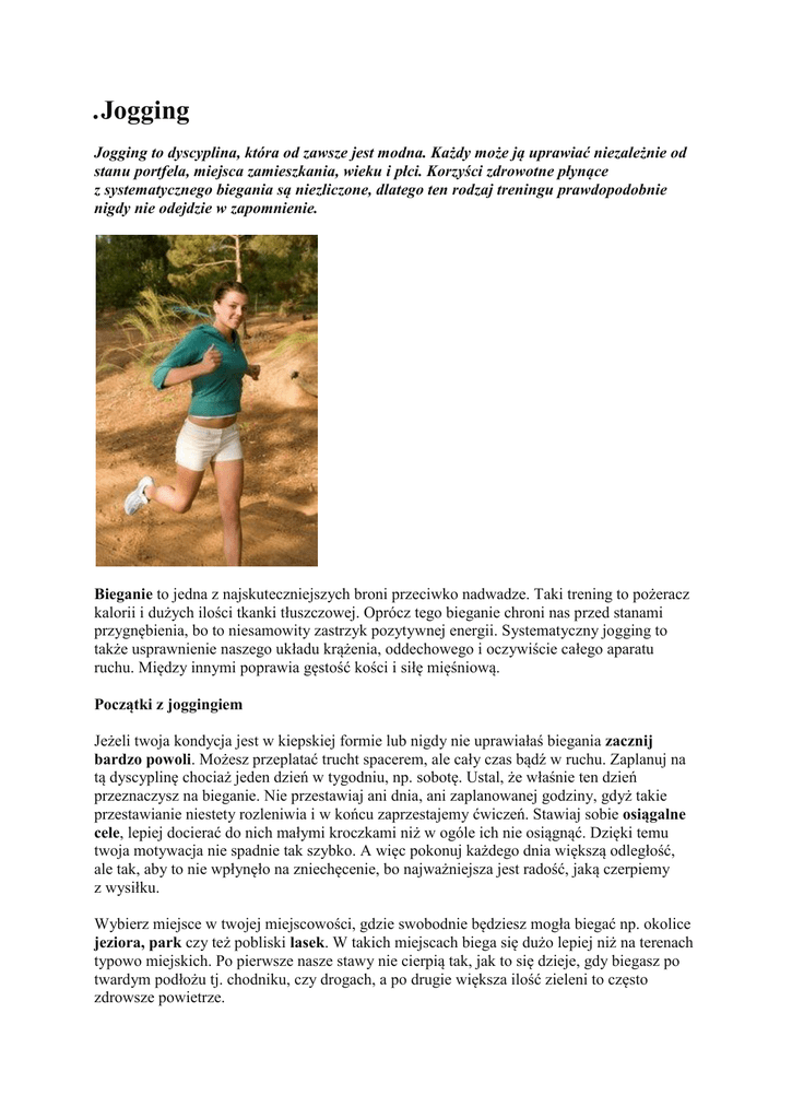 .Jogging Jogging to dyscyplina, która od zawsze jest modna. Każdy może ją uprawiać niezależnie od stanu portfela, miejsca zamieszkania, wieku i płci. Korzyści zdrowotne płynące z systematycznego biegania są niezliczone, dlatego ten rodzaj treningu prawdopodobnie nigdy nie odejdzie w zapomnienie. Bieganie to jedna z najskuteczniejszych broni przeciwko nadwadze. Taki trening to pożeracz kalorii i dużych ilości tkanki tłuszczowej. Oprócz tego bieganie chroni nas przed stanami przygnębienia, bo to niesamowity zastrzyk pozytywnej energii. Systematyczny jogging to także usprawnienie naszego układu krążenia, oddechowego i oczywiście całego aparatu ruchu. Między innymi poprawia gęstość kości i siłę mięśniową. Początki z joggingiem Jeżeli twoja kondycja jest w kiepskiej formie lub nigdy nie uprawiałaś biegania zacznij bardzo powoli. Możesz przeplatać trucht spacerem, ale cały czas bądź w ruchu. Zaplanuj na tą dyscyplinę chociaż jeden dzień w tygodniu, np. sobotę. Ustal, że właśnie ten dzień przeznaczysz na bieganie. Nie przestawiaj ani dnia, ani zaplanowanej godziny, gdyż takie przestawianie niestety rozleniwia i w końcu zaprzestajemy ćwiczeń. Stawiaj sobie osiągalne cele, lepiej docierać do nich małymi kroczkami niż w ogóle ich nie osiągnąć. Dzięki temu twoja motywacja nie spadnie tak szybko. A więc pokonuj każdego dnia większą odległość, ale tak, aby to nie wpłynęło na zniechęcenie, bo najważniejsza jest radość, jaką czerpiemy z wysiłku. Wybierz miejsce w twojej miejscowości, gdzie swobodnie będziesz mogła biegać np. okolice jeziora, park czy też pobliski lasek. W takich miejscach biega się dużo lepiej niż na terenach typowo miejskich. Po pierwsze nasze stawy nie cierpią tak, jak to się dzieje, gdy biegasz po twardym podłożu tj. chodniku, czy drogach, a po drugie większa ilość zieleni to często zdrowsze powietrze. Każda sesja treningowa powinna rozpoczynać się od przynajmniej 10 minutowej rozgrzewki i ćwiczeń rozciągających mięśnie. Natomiast na zakończenie treningu polecam zwolnienie biegu lub krótki spacer oraz także ćwiczenia rozciągające, szczególnie mięśnie nóg. Podczas biegu trzymaj tułów prosty, ramiona rozluźnij i swobodnie je wprowadź w ruch. Cały czas oddychaj rytmicznie, nigdy nie wstrzymuj oddechu. Pamiętaj, aby przed rozpoczęciem uprawiania systematycznego joggingu, zaopatrzyć się w dobre buty sportowe. To niezwykle ważne, gdyż sport ten naraża nasze stawy (szczególnie kolanowe) na obciążenia. Takie buty powinny amortyzować wstrząsy i być dostosowane do biegania. Systematyczne bieganie poprawia nie tylko naszą sylwetkę i pracę wspomnianych wyżej układów. Ten sport ma świetny wpływ także na naszą urodę. Skóra jest lepiej ukrwiona i dotleniona, wygładza się i wyraźnie poprawia się jej stan. Systematyczne bieganie sprawia, że piękniejemy w naturalny sposób, a cały nasz organizm jest pobudzony i zdrowszy.
