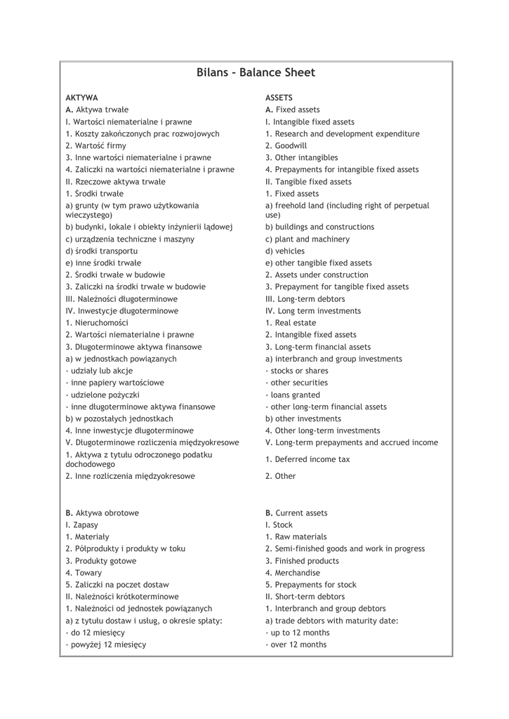 Bilans - Balance Sheet AKTYWA A. Aktywa trwałe I. Wartości niematerialne i prawne 1. Koszty zakończonych prac rozwojowych 2. Wartość firmy 3. Inne wartości niematerialne i prawne 4. Zaliczki na wartości niematerialne i prawne II. Rzeczowe aktywa trwałe 1. Środki trwałe a) grunty (w tym prawo użytkowania wieczystego) b) budynki, lokale i obiekty inżynierii lądowej c) urządzenia techniczne i maszyny d) środki transportu e) inne środki trwałe 2. Środki trwałe w budowie 3. Zaliczki na środki trwałe w budowie III. Należności długoterminowe IV. Inwestycje długoterminowe 1. Nieruchomości 2. Wartości niematerialne i prawne 3. Długoterminowe aktywa finansowe a) w jednostkach powiązanych - udziały lub akcje - inne papiery wartościowe - udzielone pożyczki - inne długoterminowe aktywa finansowe b) w pozostałych jednostkach 4. Inne inwestycje długoterminowe V. Długoterminowe rozliczenia międzyokresowe 1. Aktywa z tytułu odroczonego podatku dochodowego 2. Inne rozliczenia międzyokresowe ASSETS A. Fixed assets I. Intangible fixed assets 1. Research and development expenditure 2. Goodwill 3. Other intangibles 4. Prepayments for intangible fixed assets II. Tangible fixed assets 1. Fixed assets a) freehold land (including right of perpetual use) b) buildings and constructions c) plant and machinery d) vehicles e) other tangible fixed assets 2. Assets under construction 3. Prepayment for tangible fixed assets III. Long-term debtors IV. Long term investments 1. Real estate 2. Intangible fixed assets 3. Long-term financial assets a) interbranch and group investments - stocks or shares - other securities - loans granted - other long-term financial assets b) other investments 4. Other long-term investments V. Long-term prepayments and accrued income B. Aktywa obrotowe I. Zapasy 1. Materiały 2. Półprodukty i produkty w toku 3. Produkty gotowe 4. Towary 5. Zaliczki na poczet dostaw II. Należności krótkoterminowe 1. Należności od jednostek powiązanych a) z tytułu dostaw i usług, o okresie spłaty: - do 12 miesięcy - powyżej 12 miesięcy B. Current assets I. Stock 1. Raw materials 2. Semi-finished goods and work in progress 3. Finished products 4. Merchandise 5. Prepayments for stock II. Short-term debtors 1. Interbranch and group debtors a) trade debtors with maturity date: - up to 12 months - over 12 months 1. Deferred income tax 2. Other b) inne 2. Należności od pozostałych jednostek a) z tytułu dostaw i usług b) z tytułu podatków, dotacji, ceł, ubezpieczeń społecznych i zdrowotnych c) inne d) dochodzone na drodze sądowej III. Inwestycje krótkoterminowe 1. Krótkoterminowe aktywa finansowe a) w jednostkach powiązanych b) w pozostałych jednostkach c) środki pieniężne i inne aktywa pieniężne - środki pieniężne w kasie i na rachunku - inne środki pieniężne - inne aktywa pieniężne 2. Inne inwestycje krótkoterminowe IV. Krótkoterminowe rozliczenia międzyokresowe Suma b) other 2. Other short-term debtors a) trade debtors PASYWA A. Kapitał (fundusz) własny I. Kapitał (fundusz) podstawowy II. Należne w płaty na kapitał podstawowy III. Udziały (akcje) własne IV. Kapitał (fundusz) zapasowy V. Kapital (fundusz) z aktualizacji wyceny VI. Pozostałe kapitały (fundusze) rezerwowe LIABILITIES a. Equity I. Share capital II. Outstanding share capital contributions III. Own shares (stocks) IV. Capital reserves V. Revaluation reserve VI. Other reserve capital VII. Accumulated profit (loss) from previous years VIII. Profit (loss) after taxation IX. Appropriation of the current financial year result B. Creditors and provisions for creditors I. Provisions for creditors VII. Zysk (strata) z lat ubiegłych VIII. Zysk (strata) netto IX. Odpisy z zysku netto w ciągu roku obrotowego B. Zobowiązania i rezerwy na zobowiązania I. Rezerwy na zobowiązania 1. Rezerwa z tytułu odroczonego podatku dochodowego 2. Rezerwa na świadczenia emerytalne i podobne - długoterminowa - krókoterminowa 3. Pozostałe rezerwy II. Zobowiązania długoterminowe III. Zobowiązania krótkoterminowe 1. Wobec jednostek powiązanych a) z tytułu dostaw i usług, o okresie wymagalności: - do 12 miesięcy - powyżej 12 miesięcy b) inne 2. Wobec pozostałych jednostek b) taxation, subsidy and social security debtors c) other debtors d) debtors subject to court proceedings III. Short-term investments 1. Short-term financial assets a) in interbranch and group entities b) other investments c) cash and cash equivalents - cash at hand and at bank - other cash and cash equivalents - other financial assets 2. Other short-term investments IV. Short-term prepayments and accrued income Total 1. Deferred income tax provision 2. Retirement benefit and similar provision - long-term - short-term 3. Other provisions II. Long-term creditors III. Short term creditors 1. Interbranch and group creditors a) trade creditors with maturity date: - up to 12 months - over 12 months b) other 2. Other creditors a) kredyty i pożyczki b) z tytułu emisji dłużnych papierów wartościowych c) inne zobowiązania finansowe d) z tytułu dostaw i usług e) zaliczki otrzymane na poczet dostaw f) zobowiązania wekslowe g) z tytułu podatków, ceł, ubezpieczeń i innych świadczeń h) z tytułu wynagrodzeń i) inne 3. Fundusze specjalne IV. Rozliczenia międzyokresowe 1. Ujemne wartości firmy 2. Inne rozliczenia międzyokresowe - długoterminowe - krótkoterminowe Suma a) credits and loan b) bonds c) other financial creditors d) trade creditors e) advance payments received f) bills of exchange payable g) taxation, customs duty, social security creditors h) payroll creditors i) other 3. Special funds IV. Accruals and deferred income 1. Negative goodwill 2. Other - long-term - short-term Total