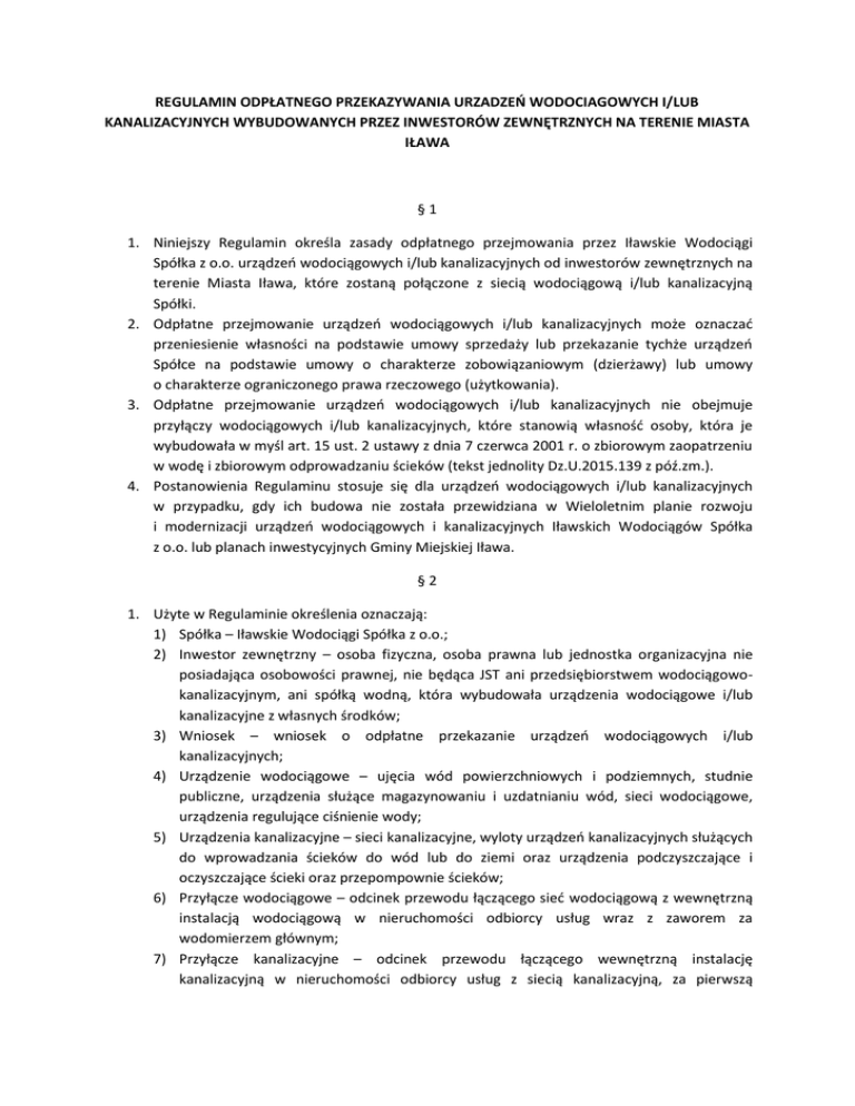 REGULAMIN ODPŁATNEGO PRZEKAZYWANIA URZADZEŃ WODOCIAGOWYCH I/LUB KANALIZACYJNYCH WYBUDOWANYCH PRZEZ INWESTORÓW ZEWNĘTRZNYCH NA TERENIE MIASTA IŁAWA §1 1. Niniejszy Regulamin określa zasady odpłatnego przejmowania przez Iławskie Wodociągi Spółka z o.o. urządzeń wodociągowych i/lub kanalizacyjnych od inwestorów zewnętrznych na terenie Miasta Iława, które zostaną połączone z siecią wodociągową i/lub kanalizacyjną Spółki. 2. Odpłatne przejmowanie urządzeń wodociągowych i/lub kanalizacyjnych może oznaczać przeniesienie własności na podstawie umowy sprzedaży lub przekazanie tychże urządzeń Spółce na podstawie umowy o charakterze zobowiązaniowym (dzierżawy) lub umowy o charakterze ograniczonego prawa rzeczowego (użytkowania). 3. Odpłatne przejmowanie urządzeń wodociągowych i/lub kanalizacyjnych nie obejmuje przyłączy wodociągowych i/lub kanalizacyjnych, które stanowią własność osoby, która je wybudowała w myśl art. 15 ust. 2 ustawy z dnia 7 czerwca 2001 r. o zbiorowym zaopatrzeniu w wodę i zbiorowym odprowadzaniu ścieków (tekst jednolity Dz.U.2015.139 z póź.zm.). 4. Postanowienia Regulaminu stosuje się dla urządzeń wodociągowych i/lub kanalizacyjnych w przypadku, gdy ich budowa nie została przewidziana w Wieloletnim planie rozwoju i modernizacji urządzeń wodociągowych i kanalizacyjnych Iławskich Wodociągów Spółka z o.o. lub planach inwestycyjnych Gminy Miejskiej Iława. §2 1. Użyte w Regulaminie określenia oznaczają: 1) Spółka – Iławskie Wodociągi Spółka z o.o.; 2) Inwestor zewnętrzny – osoba fizyczna, osoba prawna lub jednostka organizacyjna nie posiadająca osobowości prawnej, nie będąca JST ani przedsiębiorstwem wodociągowokanalizacyjnym, ani spółką wodną, która wybudowała urządzenia wodociągowe i/lub kanalizacyjne z własnych środków; 3) Wniosek – wniosek o odpłatne przekazanie urządzeń wodociągowych i/lub kanalizacyjnych; 4) Urządzenie wodociągowe – ujęcia wód powierzchniowych i podziemnych, studnie publiczne, urządzenia służące magazynowaniu i uzdatnianiu wód, sieci wodociągowe, urządzenia regulujące ciśnienie wody; 5) Urządzenia kanalizacyjne – sieci kanalizacyjne, wyloty urządzeń kanalizacyjnych służących do wprowadzania ścieków do wód lub do ziemi oraz urządzenia podczyszczające i oczyszczające ścieki oraz przepompownie ścieków; 6) Przyłącze wodociągowe – odcinek przewodu łączącego sieć wodociągową z wewnętrzną instalacją wodociągową w nieruchomości odbiorcy usług wraz z zaworem za wodomierzem głównym; 7) Przyłącze kanalizacyjne – odcinek przewodu łączącego wewnętrzną instalację kanalizacyjną w nieruchomości odbiorcy usług z siecią kanalizacyjną, za pierwszą studzienką, licząc od strony budynku, a w przypadku jej braku do granicy nieruchomości gruntowej; 8) Odpłatne przekazanie urządzeń wodociągowych i/lub kanalizacyjnych – zawarcie umowy cywilnoprawnej, w wyniku której Spółka nabywa tytuł własności lub tytuł do korzystania i czerpania pożytków z urządzeń wodociągowych i/lub kanalizacyjnych; 9) Umowa odpłatnego przekazania – umowa odpłatnego przekazania urządzeń wodociągowych i/lub kanalizacyjnych, zawarta pomiędzy Spółką a inwestorem zewnętrznym, której wzór stanowi załącznik do niniejszego Regulaminu; 10) Służebność przesyłu – jest służebnością pozwalającą na umożliwienie prawnego regulowania dostępu do cudzych nieruchomości, na której posadowione są urządzenia o których mowa w art. 49 § 1 Kodeksu cywilnego (są to urządzenia służące do doprowadzania lub odprowadzania płynów, pary, gazu, energii elektrycznej oraz inne urządzenia podobne), przedsiębiorca przesyłowy może korzystać z nieruchomości, na której posadowione są urządzenia przesyłowe w zakresie niezbędnym dla zapewnienia prawidłowego funkcjonowania tychże urządzeń. ZASADY NABYWANIA ISTNIEJĄCYCH URZĄDZEŃ WODOCIĄGOWYCH I/LUB KANALIZACYJNYCH §3 1. Procedurę odpłatnego przekazania urządzeń wodociągowych i/lub kanalizacyjnych inicjuje inwestor zewnętrzny, składając pisemny wniosek w siedzibie Spółki. 2. Jeżeli urządzenie stanowi współwłasność kilku podmiotów, podmioty te składają jeden wniosek do którego załączają pełnomocnictwo wskazujące osobę, która będzie je reprezentować w postępowaniu i zawrze w ich imieniu umowę odpłatnego przekazania. Wniosek podpisują w takiej sytuacji wszyscy współwłaściciele albo pełnomocnik. 3. Wszelkich informacji dotyczących zasad składania wniosków i procedury ich rozpatrywania udzielać będą upoważnieni przedstawiciele Spółki. 4. Do wniosku należy załączyć dokumenty i oświadczenia, które jednoznacznie wskazują, iż inwestor zewnętrzny ma prawo rozporządzać urządzeniem (jest jego właścicielem), poniósł koszty budowy urządzenia oraz dokumenty świadczące o wybudowaniu urządzenia zgodnie z prawem, wydanymi warunkami technicznymi przyłączenia, projektem oraz zasadami sztuki budowlanej, a także oddaniu go do użytkowania zgodnie z prawem. Wykaz dokumentów, które należy załączyć do wniosku, stanowi lista załączników do wniosku. 5. Spółka może wezwać inwestora zewnętrznego do uzupełnienia brakujących dokumentów i danych lub o dostarczenie innych nie wskazanych we wniosku do 14 dni roboczych od dnia wpływu wniosku. 6. Wniosek inwestora zewnętrznego, który wybudował urządzenia wodociągowe i/lub kanalizacyjne nie posiada wymaganych dokumentów, będzie rozpatrywany indywidualnie po przedłożeniu przez inwestora zewnętrznego opinii rzeczoznawcy co do spełnionych warunków technicznych, określonych w odrębnych przepisach. 7. Wszelkie koszty związane z pozyskaniem niezbędnych dokumentów i oświadczeń wskazanych w ust. 4 ponosi wnioskodawca. §4 1. Wnioski w sprawie odpłatnego przekazania będą rozpatrywane w kolejności wpływu do siedziby Spółki. W