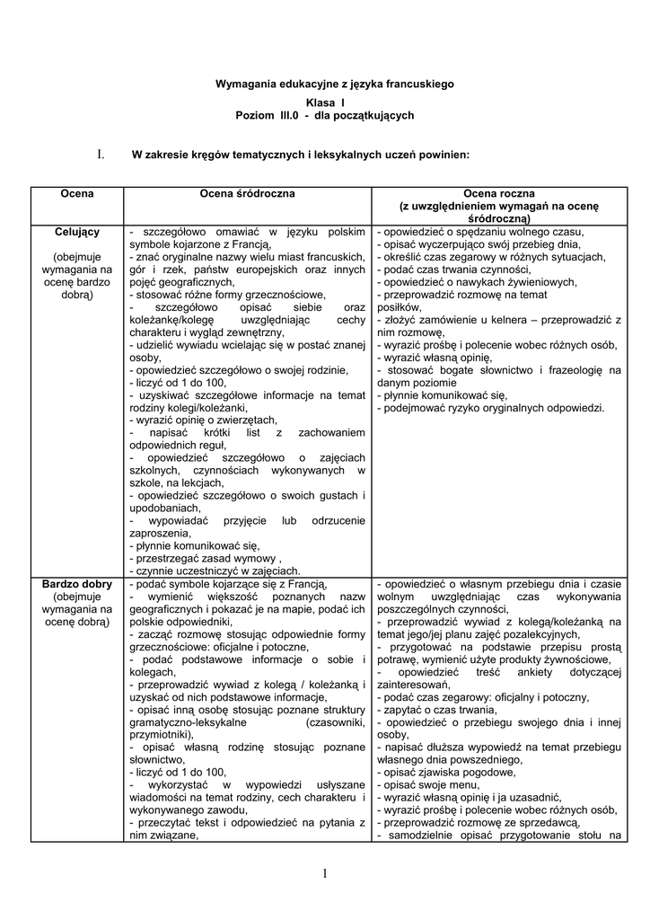 Wymagania edukacyjne z języka francuskiego Klasa I Poziom III.0 - dla początkujących I. W zakresie kręgów tematycznych i leksykalnych uczeń powinien: Ocena Ocena śródroczna Celujący - szczegółowo omawiać w języku polskim symbole kojarzone z Francją, - znać oryginalne nazwy wielu miast francuskich, gór i rzek, państw europejskich oraz innych pojęć geograficznych, - stosować różne formy grzecznościowe, szczegółowo opisać siebie oraz koleżankę/kolegę uwzględniając cechy charakteru i wygląd zewnętrzny, - udzielić wywiadu wcielając się w postać znanej osoby, - opowiedzieć szczegółowo o swojej rodzinie, - liczyć od 1 do 100, - uzyskiwać szczegółowe informacje na temat rodziny kolegi/koleżanki, - wyrazić opinię o zwierzętach, napisać krótki list z zachowaniem odpowiednich reguł, - opowiedzieć szczegółowo o zajęciach szkolnych, czynnościach wykonywanych w szkole, na lekcjach, - opowiedzieć szczegółowo o swoich gustach i upodobaniach, - wypowiadać przyjęcie lub odrzucenie zaproszenia, - płynnie komunikować się, - przestrzegać zasad wymowy , - czynnie uczestniczyć w zajęciach. - podać symbole kojarzące się z Francją, - wymienić większość poznanych nazw geograficznych i pokazać je na mapie, podać ich polskie odpowiedniki, - zacząć rozmowę stosując odpowiednie formy grzecznościowe: oficjalne i potoczne, - podać podstawowe informacje o sobie i kolegach, - przeprowadzić wywiad z kolegą / koleżanką i uzyskać od nich podstawowe informacje, - opisać inną osobę stosując poznane struktury gramatyczno-leksykalne (czasowniki, przymiotniki), - opisać własną rodzinę stosując poznane słownictwo, - liczyć od 1 do 100, - wykorzystać w wypowiedzi usłyszane wiadomości na temat rodziny, cech charakteru i wykonywanego zawodu, - przeczytać tekst i odpowiedzieć na pytania z nim związane, (obejmuje wymagania na ocenę bardzo dobrą) Bardzo dobry (obejmuje wymagania na ocenę dobrą) 1 Ocena roczna (z uwzględnieniem wymagań na ocenę śródroczną) - opowiedzieć o spędzaniu wolnego czasu, - opisać wyczerpująco swój przebieg dnia, - określić czas zegarowy w różnych sytuacjach, - podać czas trwania czynności, - opowiedzieć o nawykach żywieniowych, - przeprowadzić rozmowę na temat posiłków, - złożyć zamówienie u kelnera – przeprowadzić z nim rozmowę, - wyrazić prośbę i polecenie wobec różnych osób, - wyrazić własną opinię, - stosować bogate słownictwo i frazeologię na danym poziomie - płynnie komunikować się, - podejmować ryzyko oryginalnych odpowiedzi. - opowiedzieć o własnym przebiegu dnia i czasie wolnym uwzględniając czas wykonywania poszczególnych czynności, - przeprowadzić wywiad z kolegą/koleżanką na temat jego/jej planu zajęć pozalekcyjnych, - przygotować na podstawie przepisu prostą potrawę, wymienić użyte produkty żywnościowe, opowiedzieć treść ankiety dotyczącej zainteresowań, - podać czas zegarowy: oficjalny i potoczny, - zapytać o czas trwania, - opowiedzieć o przebiegu swojego dnia i innej osoby, - napisać dłuższa wypowiedź na temat przebiegu własnego dnia powszedniego, - opisać zjawiska pogodowe, - opisać swoje menu, - wyrazić własną opinię i ja uzasadnić, - wyrazić prośbę i polecenie wobec różnych osób, - przeprowadzić rozmowę ze sprzedawcą, - samodzielnie opisać przygotowanie stołu na Dobry (obejmuje wymagania na ocenę dostateczną) Dostateczny (obejmuje wymagania na ocenę dopuszczającą) - opowiedzieć o ulubionych zwierzętach, wykorzystując słownictwo dotyczące zwierząt domowych, - napisać list z zastosowaniem przyjętych reguł, stosując również słownictwo dotyczące rodziny i zainteresowań, - bez problemów posługiwać się nazwami przedmiotów szkolnych oraz wykorzystać je w krótkich dialogach, - wypowiadać bez zarzutu przyjęcie lub odrzucenie propozycji, - dokładnie opowiedzieć o swoim planie lekcji oraz planie kolegi/koleżanki i czynnościach wykonywanych na lekcjach, - bez problemów przeczytać tekst dotyczący szkoły i opowiedzieć go, - wykazać się bardzo dobrą znajomością słownictwa, - wypowiadać się poprawnie, bez większych błędów w wymowie i intonacji przestrzegając szyku zdania francuskiego. - wymienić wybrane symbole kojarzące się z Francją, - wymienić wybrane nazwy geograficzne i pokazać je na mapie oraz podać ich polskie odpowiedniki, - dobierać odpowiednie formy powitania i pożegnania stosownie do sytuacji, - podać podstawowe informacje o sobie, - ułożyć proste zdania z zastosowaniem poznanych struktur gramatyczno-leksykalnych, - wymienić usłyszane rzeczowniki i przymiotniki służące do opisywania innych osób, - liczyć od 1 do 100, - z niewielką pomocą nauczyciela przeczytać i przetłumaczyć tekst o rodzinie oraz stworzyć tekst o własnej rodzinie, - wymienić nazwy zwierząt domowych i podać krótki opis jednego z nich, - przeczytać ogłoszenie oraz napisać list z niewielka pomocą nauczyciela z użyciem określonych reguł i zwrotów, - wyrazić z niewielką pomocą nauczyciela przyjęcie i odrzucenie propozycji, - wymienić czynności szkolne, wykonywane na lekcjach, - stosować zwroty i wyrażenia służące do przekazania odpowiednich informacji. - poprawnie wymienić wybrane symbole kojarzące się z Francją, - wymienić wybrane nazwy geograficzne i pokazać je na mapie, - nazywać i poprawnie tłumaczyć formy powitań i pożegnań, - z pomocą nauczyciela podać podstawowe informacje o sobie, - przeczytać i przetłumaczyć wywiad, - zrozumieć słownictwo dotyczące opisywania osób, - zrozumieć usłyszane rzeczowniki i przymiotniki 2 prywatkę, - opracować ankietę dotyczącą upodobań kulinarnych, - wykazać się bardzo dobrą znajomością słownictwa, - wypowiadać się poprawnie, bez znaczących błędów w wymowie i intonacji. - opowiedzieć o typowych czynnościach w czasie wolnym, - opowiedzieć o własnym prze