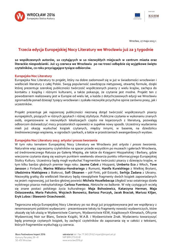 Wrocław, 27 maja 2015 r. Trzecia edycja Europejskiej Nocy Literatury we Wrocławiu już za 3 tygodnie 10 współczesnych autorów, 10 czytających w 10 niezwykłych miejscach w centrum miasta oraz literackie niespodzianki. Już 13 czerwca we Wrocławiu po raz trzeci odbędzie się wyjątkowe święto czytelników, co roku przyciągające tysiące odbiorców. Europejska Noc Literatury Europejska Noc Literatury to projekt, który na dobre zadomowił się w już w świadomości wrocławian i wielbicieli literatury z całej Polski. Swoją popularność zawdzięcza nietypowej, otwartej formule, dzięki której prezentuje szerokiej publiczności twórczość współczesnych pisarzy z wielu krajów, zachęca do kontaktu z książką i różnymi kulturami, a także pokazuje, że czytanie jest modne. Projekt ten z powodzeniem realizowany jest w Europie od wielu lat, a każda z dotychczasowych edycji we Wrocławiu zgromadziła ponad dziesięć tysięcy wrocławian i zyskała niezwykle przychylne opinie zarówno prasy, jak i uczestników. Projekt prezentuje jak najszerszej publiczności nieznaną dotąd twórczość współczesnych pisarzy europejskich, piszących w różnych językach i różnej stylistyce. Publiczne czytania w wykonaniu znanych osób, organizowane w niezwykłych lokalizacjach często nie kojarzonych z literaturą, pozwalają odbiorcom doświadczyć mocy prozatorskich opowieści w zupełnie nowy sposób. Uczestnicy wydarzenia mieli już okazję wysłuchać książek czytanych, między innymi, w basenie, na dziedzińcu średniowiecznego więzienia, w ogrodach i parkach, a także w przestrzeniach awangardowych wystaw. Europejska Noc Literatury 2015: artysta i proces tworzenia W tym roku tematem Europejskiej Nocy Literatury we Wrocławiu jest artysta i proces tworzenia. Naturalnie więc zapraszamy czytelników na spacer przede wszystkim po muzeach i galeriach Wrocławia, od średniowiecznego Ratusza po Galerię Miejską, ale także do Księgarni Hiszpańskiej i Barbary, gdzie wieczorne czytania staną się ważnym punktem weekendu otwarcia punktu informacyjnego Europejskiej Stolicy Kultury. Uczestnicy będą mogli wysłuchać fragmentów twórczości pisarzy z dziesięciu krajów, w tym kilku bardzo głośnych premier tego roku: Jaume Cabré z Hiszpanii, Umberto Eco z Włoch, Tove Jansson z Finlandii, Marina Mălaicu-Hondrariego z Rumunii, Hanifa Kureishiego z Wielkiej Brytanii, Uładzimira Niaklajewa z Białorusi, Sofi Oksanen – pół Finki, pół Estonki, Serhija Żadana z Ukrainy. Niezwykłą gratką dla wielbicieli literatury będą niewątpliwie fragmenty dwóch książek zapowiadanych na jesień: najnowszej, już bardzo głośnej powieści Michela Houellebecqa Uległość oraz ostatniego dzieła wybitnego pisarza meksykańskiego Carlosa Fuentesa, Nietzsche na balkonie. W rolę czytających wcielą się znane postaci polskiego życia kulturalnego: Maja Bohosiewicz, Katarzyna Herman, Maja Ostaszewska, Maria Pakulnis, Wojciech Bonowicz, Bartosz Porczyk, Jacek Braciak, Mariusz Kiljan, Eryk Lubos i Sławomir Orzechowski. Tegoroczna edycja Europejskiej Nocy Literatury po raz drugi już przygotowywana jest we współpracy z renomowanymi polskimi wydawcami - prezentowane teksty to fragmenty nowości wydawniczych, które ukazały się lub ukażą w Wydawnictwie Czarnym, Wydawnictwie KEW, Książkowych Klimatach, Oficynie Wydawniczej Noir sur Blanc, Świecie Książki, W.A.B. i Wydawnictwie Znak. Wydarzeniu towarzyszyć będą promocje czytanych książek, by zachęcić czytelników do zapoznania się w całości z tekstami, których fragmentów wysłuchają 13 czerwca. Europejska Noc Literatury we Wrocławiu, stanowiąca element programu Europejskiej Stolicy Kultury, cały czas rozszerza swoją formułę, by zachęcić nowych odbiorców do kontaktu z żywym słowem. Dlatego w tym roku, oprócz bogatego programu wydarzeń dla dzieci, na który złożą się warsztaty i wrocławska premiera nowego spektaklu Teatru Uszytego z Krakowa, przygotowaliśmy dwie literackie niespodzianki. Przed czytaniami zapraszamy na spotkanie z gościem specjalnym, wybitną polską reporterką i pisarką Hanną Krall, która opowie o swojej pracy i najnowszych książkach, a fragmenty jej twórczości przeczyta Maja Ostaszewska. Natomiast późnym wieczorem na dziedzińcu Arsenału Miejskiego odbędzie się koncert zespołu Świetliki, który z powodzeniem łączy muzykę z literaturą. 13 czerwca będzie więc niezwykłym literackim świętem Wrocławia! Szczegóły już 25 maja na stronie: www.wroclaw2016.pl/enl Program Czytania we wszystkich miejscach rozpoczną się w tym samym czasie i będą się odbywały co pół godziny przez piętnaście minut. Dzięki temu każdy uczestnik będzie miał szansę wysłuchać wszystkich dziesięciu tekstów. Godziny czytań: 18.00 18.30 19.00 19.30 20.00 20.30 21.00 21.30 22.00 22.30 Umberto Eco Temat na pierwszą stronę | Włochy czyta Maria Pakulnis Muzeum Architektury we Wrocławiu, ul. Bernardyńska 5* Michel Houellebecq Uległość | Francja czyta Jacek Braciak BWA Wrocław |Galeria Awangarda, ul. Wita Stwosza 32* Uładzimir Niaklajeu Automat z wodą gazowaną z syropem lub bez | Białoruś czyta Wojciech Bonowicz Dziedziniec Instytutu Historii Sztuki | Uniwersytet Wrocławski, ul. Szewska 36 * Sofi Oksanen Gdy zniknęły gołębie | Finlandia/Estonia czyta Maja Ostaszewska Aula Leopoldina, pl. Uniwersytecki 1 Jaume Cabré Jaśnie Pan| Hiszpania czyta Sławomir Orzechowski Przejście Żelaźnicze* Serhij Żadan Mezopotamia| Ukraina czyta Eryk Lubos Stary Ratusz | Muzeum Miejskie Wrocławia, Rynek-Ratusz Marin Mălaicu-Hondrari Bliskość | Rumunia czyta Mariusz Kiljan Barbara: infopunkt, kawiarnia, kultura, ul. Świdnicka 8b* Hanif Kureishi Ostatnie słowo| Wielka Brytania czyta Katarzyna Herman Centrum Sztuki WRO, ul. Widok 7* Carlos Fuentes Nietzsche na balkonie | Meksyk czyta Bartosz Porczyk Księgarnia Hiszpańska Elite, ul. Szajnochy 5 [znaczek wózka inw