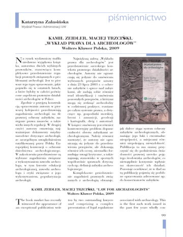 Katarzyna Zalasińska piśmiennictwo Wydział Prawa i Administracji UW KAMIL ZEIDLER, MACIEJ TRZCIŃSKI, „WYKŁAD PRAWA DLA ARCHEOLOGÓW” Wolters Kluwer Polska, 2009 a rynek wydawniczy trafiła niedawno wyjątkowa książka, autorstwa dwóch wybitnych prawników, stanowiąca kompleksowe przedstawienie regulacji prawnych związanych z problemami archeologii. Jest to pierwsze tego typu opracowanie, jakie pojawiło się w ostatnich latach, a które byłoby w całości poświęcone aspektom prawnym działalności archeologów w Polsce. Zgodnie z przyjętą konstrukcją opracowania autorzy w pierwszej kolejności przedstawiają zagadnienia archeologii na tle prawnej ochrony zabytków, następnie prawa muzeów, a także wielu innych regulacji. W drugiej części autorzy omawiają najważniejsze dokumenty międzynarodowe dotyczące archeologii, ze szczególnym uwzględnieniem ratyfikowanej przez Polskę Europejskiej konwencji o ochronie dziedzictwa archeologicznego. W zakończeniu przedstawione są wybrane zagadnienia związane z wykonywaniem zawodu archeologa, w tym kwestie edukacji archeologicznej, zawodu archeologa i etyki związane z jego wykonywaniem, popularyzacja archeologii. N Największą zaletą „Wykładu prawa dla archeologów” jest przedstawienie szerokiego kontekstu prawnego działalności archeologów. Autorzy nie ograniczają się jedynie do omówienia wybranych przepisów ustawy z dnia 23 lipca 2003 r. o ochronie zabytków i opiece nad zabytkami, ale zadają sobie również trud identyfikacji i omówienia pozostałych przepisów, z którymi mogą się zetknąć archeolodzy w codziennej praktyce, rozsiane po całym systemie prawa, a dotyczące np. gospodarki morskiej, broni i amunicji, geodezji i kartografii, dróg i autostrad. W książce omówiony jest również kontrowersyjny problem dopuszczalności obrotu zabytkami archeologicznymi. Należy również zauważyć, że autorzy nie ograniczają się jedynie do przedstawienia przepisów, ale dokonują również ich oceny, nierzadko formułując uwagi krytyczne, a także zajmują stanowisko w spornych współcześnie sprawach dotyczących np. definicji zabytku archeologicznego. Kompleksowe przedstawienie zagadnień prawnych związanych z archeologią obrazuje, jak dalece sięga system ochrony zabytków archeologicznych, obnażając jego luki i ewentualne niespójności, a miejscami również niepokojącą niewydolność. Publikacja ta ma szansę przyczynić się do podniesienia świadomości prawnej szeroko pojętego środowiska archeologów, co niewątpliwie korzystnie wpłynie na skuteczność ich działań. Pozostaje oczekiwać, że w ślad za tą publikację pojawią się podobne opracowania adresowane np. do konserwatorów zabytków. KAMIL ZEIDLER, MACIEJ TRZCIŃSKI, “LAW FOR ARCHAEOLOGISTS” Wolters Kluwer Polska, 2009 he book market has recently witnessed the appearance of an exceptional publication writ- T ten by two outstanding lawyers and comprising a complex presentation of legal regulations associated with archaeology. This is the first such work issued in the past few years wholly con- 99 cerned with the legal aspects of the activity of archaeologists in P o l a n d . In accordance with the accepted construction of the book its authors first discussed archaeology against the backdrop of the legal protection of historical monuments, laws concerning museums as well as numerous other regulations. The second part of the publication focuses on the most prominent international documents pertaining to archaeology, with particular attention paid to the European convention on the protection of the archaeological heritage, signed by Poland. The book ends with an examination of selected problems associated with the profession of an archaeologist, including training, ethics and the populari- sation of archaeology. The greatest asset of ”Wykład prawa dla archeologów” is its depiction of an extensive legal context. The authors did not limit themselves to selected regulations of the statute of 23 July 2003 on the protection of historical monuments but also identified all other regulations which archaeologists could encounter in their daily work, scattered throughout the entire domain of law and relating to, i.a. maritime economy, arms and ammunition, cartography, as well as roads and highways. The book also delves into the controversial question of the turnover involving archaeological monuments. Let us note that the authors did not merely list the regulations but also proposed their own assessments, often formulating critical comments and their own stand on such contemporary controversial issues as the definition of the archaeological monument. The complex outline of legal problems concerning archaeology portrays the range of the system of the protection of monuments, disclosing its gaps and eventual lack of cohesion and, at times, also a disturbing lack of effectiveness. The reviewed publication may contribute to improving the legal awareness of the widely comprehended milieu of archaeologists and indubitably enhance the outcome of their activity. Hopefully, the titular book will be followed by similar studies addressed to, e.g. conservators of monuments. INFORMACJA O PRENUMERACIE Prenumeratę „Ochrony Zabytków” można zamówić za pośrednictwem: y 1. RUCH SA Informacji o warunkach prenumeraty i sposobie zamawiania udziela „RUCH” SA Oddział Krajowej Dystrybucji Prasy, 01-248 Warszawa, ul. Jana Kazimierza 31/33; tel. (0 22) 532 87 31, 532 88 20, 532 88 16, fax (0 22) 532 87 32; www.ruch.pol.pl, [email protected] y 2. Firma AMOS 01-785 Warszawa, ul. Broniewskiego 8a; tel. (0 22) 639 73 67; [email protected] y 3. GARMOND PRESS SA 01-106 Warszawa, ul. Nakielska 3; tel./fax (0 22) 836 69 21; [email protected] y 4. INMEDIO Sp. z o.o. 90-446 Łódź, ul. Kościuszki 132; tel./fax (0 42) 636 44 47; [email protected] y 5. KOLPORTER SA 05-080 Izabelin, Mościska, ul. Bakaliowa 3; tel. (0 22) 355 05 65(66), fax (0