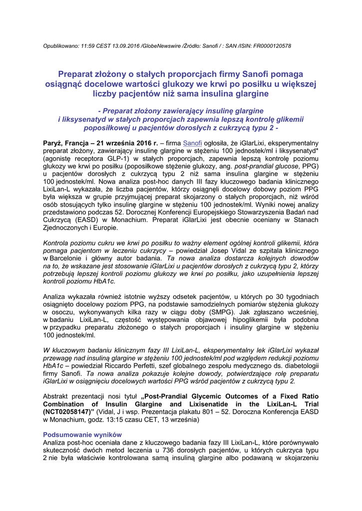 Opublikowano: 11:59 CEST 13.09.2016 /GlobeNewswire /Źródło: Sanofi / : SAN /ISIN: FR0000120578 Preparat złożony o stałych proporcjach firmy Sanofi pomaga osiągnąć docelowe wartości glukozy we krwi po posiłku u większej liczby pacjentów niż sama insulina glargine - Preparat złożony zawierający insulinę glargine i liksysenatyd w stałych proporcjach zapewnia lepszą kontrolę glikemii poposiłkowej u pacjentów dorosłych z cukrzycą typu 2 Paryż, Francja – 21 września 2016 r. – firma Sanofi ogłosiła, że iGlarLixi, eksperymentalny preparat złożony, zawierający insulinę glargine w stężeniu 100 jednostek/ml i liksysenatyd* (agonistę receptora GLP-1) w stałych proporcjach, zapewnia lepszą kontrolę poziomu glukozy we krwi po posiłku (poposiłkowe stężenie glukozy, ang. post-prandial glucose, PPG) u pacjentów dorosłych z cukrzycą typu 2 niż sama insulina glargine w stężeniu 100 jednostek/ml. Nowa analiza post-hoc danych III fazy kluczowego badania klinicznego LixiLan-L wykazała, że liczba pacjentów, którzy osiągnęli docelowy dobowy poziom PPG była większa w grupie przyjmującej preparat skojarzony o stałych proporcjach, niż wśród osób stosujących tylko insulinę glargine w stężeniu 100 jednostek/ml. Wyniki nowej analizy przedstawiono podczas 52. Dorocznej Konferencji Europejskiego Stowarzyszenia Badań nad Cukrzycą (EASD) w Monachium. Preparat iGlarLixi jest obecnie oceniany w Stanach Zjednoczonych i Europie. Kontrola poziomu cukru we krwi po posiłku to ważny element ogólnej kontroli glikemii, która pomaga pacjentom w leczeniu cukrzycy – powiedział Josep Vidal ze szpitala klinicznego w Barcelonie i główny autor badania. Ta nowa analiza dostarcza kolejnych dowodów na to, że wskazane jest stosowanie iGlarLixi u pacjentów dorosłych z cukrzycą typu 2, którzy potrzebują lepszej kontroli poziomu glukozy we krwi po posiłku, jako uzupełnienia lepszej kontroli poziomu HbA1c. Analiza wykazała również istotnie wyższy odsetek pacjentów, u których po 30 tygodniach osiągnięto docelowy poziom PPG, na podstawie samodzielnych pomiarów stężenia glukozy w osoczu, wykonywanych kilka razy w ciągu doby (SMPG). Jak zgłaszano wcześniej, w badaniu LixiLan-L, częstość występowania objawowej hipoglikemii była podobna w przypadku preparatu złożonego o stałych proporcjach i insuliny glargine w stężeniu 100 jednostek/ml. W kluczowym badaniu klinicznym fazy III LixiLan-L, eksperymentalny lek iGlarLixi wykazał przewagę nad insuliną glargine w stężeniu 100 jednostek/ml pod względem redukcji poziomu HbA1c – powiedział Riccardo Perfetti, szef globalnego zespołu medycznego ds. diabetologii firmy Sanofi. Ta nowa analiza pokazuje kolejne dowody, potwierdzające rolę preparatu iGlarLixi w osiągnięciu docelowych wartości PPG wśród pacjentów z cukrzycą typu 2. Abstrakt prezentacji nosi tytuł „Post-Prandial Glycemic Outcomes of a Fixed Ratio Combination of Insulin Glargine and Lixisenatide in the LixiLan-L Trial (NCT02058147)” (Vidal, J i wsp. Prezentacja plakatu 801 – 52. Doroczna Konferencja EASD w Monachium, godz. 13:15 czasu CET, 13 września) Podsumowanie wyników Analiza post-hoc oceniała dane z kluczowego badania fazy III LixiLan-L, które porównywało skuteczność dwóch metod leczenia u 736 dorosłych pacjentów, u których cukrzyca typu 2 nie była właściwie kontrolowana samą insuliną glargine albo podawaną w skojarzeniu z jednym lub dwoma doustnymi środkami przeciwcukrzycowymi. Pierwszorzędowym punktem końcowym badania LixiLan-L było istotne statystycznie obniżenie poziomu HbA1c (średni poziom glukozy we krwi w okresie ostatnich trzech miesięcy) w porównaniu ze stosowaniem insuliny glargine w stężeniu 100 jednostek/ml; te wyniki zostały zaprezentowane podczas 76. Sesji Naukowej Amerykańskiego Towarzystwa Diabetologicznego w 2016 roku. W grupie 677 uczestników włączonych do analizy post-hoc, w próbie obciążenia standardowym posiłkiem podczas oceny wyjściowej i w 30 tygodniu, preparat skojarzony o stałych proporcjach zapewniał lepszą kontrolę poziomu PPG, niż insulina glargine w stężeniu 100 jednostek/ml. Odsetek pacjentów osiągających poziom PPG ≤7,8 mmol/l w 30 tygodniu, był wyższy w grupie leczonej preparatem skojarzonym o stałych proporcjach, niż wśród osób stosujących insulinę glargine w stężeniu 100 jednostek/ml po 30 minutach (różnica: 16,4% [41,4% w porównaniu z 25%], p<0,0001), po jednej godzinie (różnica: 22,4% [30,7% w porównaniu z 8,3%], p<0,0001) i po dwóch godzinach (różnica: 28,2% [33,6% w porównaniu z 5,4%], p<0,0001) od standardowego płynnego posiłku. Preparat skojarzony o stałych proporcjach zapewniał również lepszą kontrolę poziomu PPG, niż insulina glargine w stężeniu 100 jednostek/ml w grupie 592 uczestników, włączonych do analizy post-hoc danych z 7-punktowego samodzielnego pomiaru stężenia glukozy w osoczu (SMPG) podczas oceny wyjściowej i w 30 tygodniu. Tu również większa liczba pacjentów osiągnęła docelowe wartości PPG po każdym posiłku w ciągu doby. Odsetek pacjentów osiągających poziom PPG ≤7,8 mmol/l w 7-punktowym samodzielnym pomiarze stężenia glukozy w osoczu w 30 tygodniu, był wyższy w grupie leczonej preparatem skojarzonym o stałych proporcjach, niż wśród osób stosujących insulinę glargine w stężeniu 100 jednostek/ml o godzinie 10:00 rano (różnica: 32,5% [61,2% w porównaniu z 28,7%], p<0,0001), o 15:00 (różnica: 16,5% [41,1% w porównaniu z 24,6%], p<0,0001) i o 22:00 (różnica: 12,2% [45,9% w porównaniu z 33,7%], p=0,005). Jak zgłaszano wcześniej w badaniu LixiLan-L, częstość występowania udokumentowanych (≤ 70 mg/dl /3,9 mmol/l) objawów hipoglikemii była podobna w przypadku preparatu złożonego o stałych proporcjach (40% pacjentów; 3,0 zdarzenia/rok) i insuliny glargine w stężeniu 100 jednostek/ml (42,5% pacjentów; 4,2 zdarzenia/rok). W p