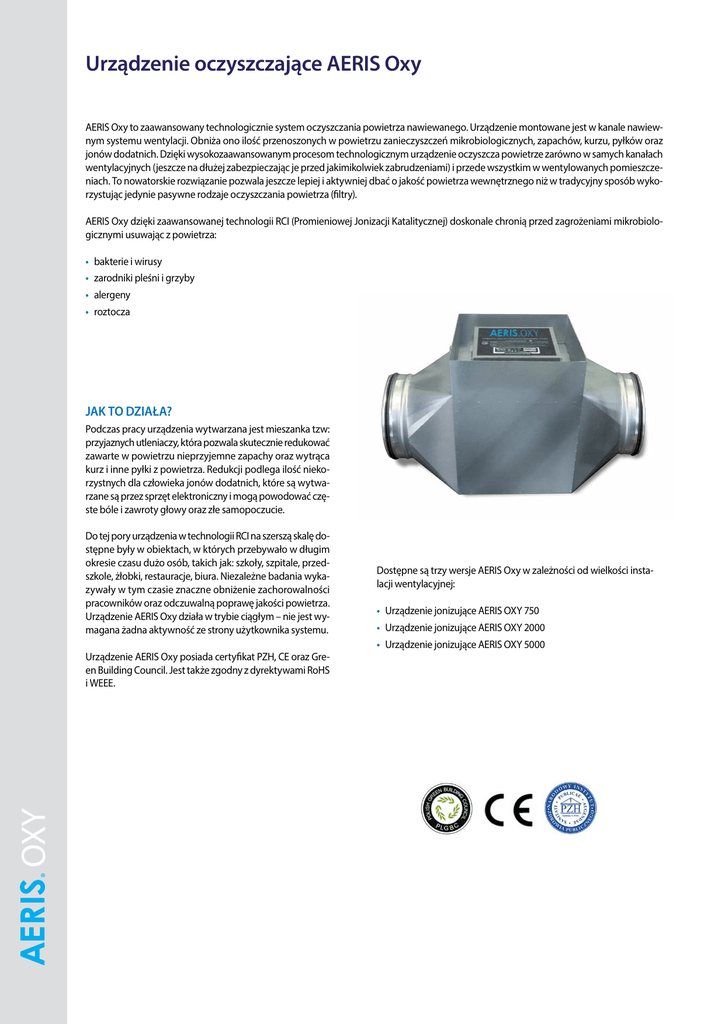 Urządzenie oczyszczające AERIS Oxy AERIS Oxy to zaawansowany technologicznie system oczyszczania powietrza nawiewanego. Urządzenie montowane jest w kanale nawiewnym systemu wentylacji. Obniża ono ilość przenoszonych w powietrzu zanieczyszczeń mikrobiologicznych, zapachów, kurzu, pyłków oraz jonów dodatnich. Dzięki wysokozaawansowanym procesom technologicznym urządzenie oczyszcza powietrze zarówno w samych kanałach wentylacyjnych (jeszcze na dłużej zabezpieczając je przed jakimikolwiek zabrudzeniami) i przede wszystkim w wentylowanych pomieszczeniach. To nowatorskie rozwiązanie pozwala jeszcze lepiej i aktywniej dbać o jakość powietrza wewnętrznego niż w tradycyjny sposób wykorzystując jedynie pasywne rodzaje oczyszczania powietrza (filtry). AERIS Oxy dzięki zaawansowanej technologii RCI (Promieniowej Jonizacji Katalitycznej) doskonale chronią przed zagrożeniami mikrobiologicznymi usuwając z powietrza: • bakterie i wirusy • zarodniki pleśni i grzyby • alergeny • roztocza Jak to działa? Podczas pracy urządzenia wytwarzana jest mieszanka tzw: przyjaznych utleniaczy, która pozwala skutecznie redukować zawarte w powietrzu nieprzyjemne zapachy oraz wytrąca kurz i inne pyłki z powietrza. Redukcji podlega ilość niekorzystnych dla człowieka jonów dodatnich, które są wytwarzane są przez sprzęt elektroniczny i mogą powodować częste bóle i zawroty głowy oraz złe samopoczucie. Do tej pory urządzenia w technologii RCI na szerszą skalę dostępne były w obiektach, w których przebywało w długim okresie czasu dużo osób, takich jak: szkoły, szpitale, przedszkole, żłobki, restauracje, biura. Niezależne badania wykazywały w tym czasie znaczne obniżenie zachorowalności pracowników oraz odczuwalną poprawę jakości powietrza. Urządzenie AERIS Oxy działa w trybie ciągłym – nie jest wymagana żadna aktywność ze strony użytkownika systemu. OXY Urządzenie AERIS Oxy posiada certyfikat PZH, CE oraz Green Building Council. Jest także zgodny z dyrektywami RoHS i WEEE. Dostępne są trzy wersje AERIS Oxy w zależności od wielkości instalacji wentylacyjnej: • Urządzenie jonizujące AERIS OXY 750 • Urządzenie jonizujące AERIS OXY 2000 • Urządzenie jonizujące AERIS OXY 5000
