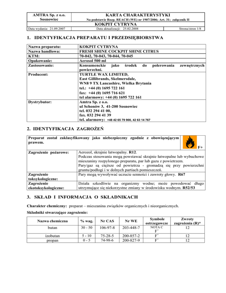 AMTRA Sp. z o.o. Sosnowiec KARTA CHARAKTERYSTYKI Na podstawie Rozp. REACH (WE) nr 1907/2006; Art. 31; załącznik II KOKPIT CYTRYNA Data wydania: 21.09.2007 Data aktualizacji: 25.02.2008 Strona/stron 1/8 1. IDENTYFIKACJA PREPARATU I PRZEDSIĘBIORSTWA Nazwa preparatu: Nazwa handlowa: KTM: Opakowanie: Zastosowanie: Producent: Dystrybutor: KOKPIT CYTRYNA FRESH SHINE COCKPIT SHINE CITRUS 70-042, 70-043, 70-044, 70-045 Aerosol 500 ml Konsumenckie jako środek do polerowania powierzchni. TURTLE WAX LIMITED, East Gillibrands, Skelmersdale, WN8 9 TX Lancashire, Wielka Brytania tel.: +44 (0) 1695 722 161 fax: +44 (0) 1695 716 621 tel alarmowy: +44 (0) 1695 722 161 Amtra Sp. z o.o. ul Schonów 3, 41-200 Sosnowiec tel. 032 294 41 00, fax. 032 294 41 39 tel. alarmowy: +48 42 65 79 900, 42 63 14 767 zewnętrznych 2. IDENTYFIKACJA ZAGROśEŃ Preparat został zaklasyfikowany jako niebezpieczny zgodnie z obowiązującym prawem. F+ ZagroŜenie poŜarowe: ZagroŜenie toksykologiczne: ZagroŜenie ekotoksykologiczne: Aerozol, skrajnie łatwopalny. R12. Podczas stosowania mogą powstawać skrajnie łatwopalne lub wybuchowe mieszaniny rozpylonego preparatu, par lub gazu z powietrzem. Pary/gaz są cięŜsze od powietrza - gromadzą się przy powierzchni gruntu/podłogi i w dolnych partiach pomieszczeń. Pary mogą wywoływać uczucie senności i zawroty głowy. R67 Działa szkodliwie na organizmy wodne; moŜe powodować długo utrzymujące się niekorzystne zmiany w środowisku wodnym. R52/53 3. SKŁAD I INFORMACJA O SKŁADNIKACH Charakter chemiczny: preparat – mieszanina związków organicznych i nieorganicznych. Składniki stwarzające zagroŜenie: Nazwa chemiczna % wag. Nr CAS Nr WE Symbole ostrzegawcze butan 30 - 50 106-97-8 203-448-7 NOTA C izobutan propan 5 - 10 0-5 75-28-5 74-98-6 200-857-2 200-827-9 F+ F+ F+ Zwroty zagroŜenia (R)* 12 12 12 AMTRA Sp. z o.o. Sosnowiec KARTA CHARAKTERYSTYKI Na podstawie Rozp. REACH (WE) nr 1907/2006; Art. 31; załącznik II KOKPIT CYTRYNA Data wydania: 21.09.2007 Data aktualizacji: 25.02.2008 Strona/stron 2/8 Benzyna lekka obrabiana wodorem (ropa naftowa); Niskowrząca frakcja naftowa obrabiana wodorem Gatunek I. (zawiera <0,1 % benzenu) 5 - 15 64742-49-0 265-151-9 NOTA H, NOTA P F, Xi 11-38-51/53-6667 propan-2-ol 0-5 67-63-0 200-661-7 F, Xi 11-36-67 Objaśnienie: T+= bardzo toksyczny, T= toksyczny, C= Ŝrący, Xn= szkodliwy, Xi= draŜniący, E= wybuchowy, O= utleniający, F+= skrajnie łatwo palny, F= wysoce łatwo palny, N= niebezpieczny dla środowiska *Pełne znaczenie zwrotów zagroŜenia R ujęto w punkcie 16 Uwaga: Zwroty R odnoszą się do substancji 100 % a nie do jej stęŜenia w preparacie. 4. PIERWSZA POMOC Następstwa wdychania: • W przypadku wystąpienia takiej potrzeby - wykonać sztuczne oddychanie lub w razie potrzeby podać tlen - najlepiej jeśli tego dokona osoba przeszkolona. • Zapewnić pomoc lekarską. Następstwa połknięcia: • Mało prawdopodobne, lecz jeŜeli zaistnieje, w pierwszej kolejności skontaktować się z lekarzem lub centrum toksykologicznego. Nie wywoływać wymiotów. ZagroŜenie zachłyśnięciem się. • Do chwili przetransportowania do szpitala choremu zapewnić spokój, leŜenie i ciepło. Kontakt z oczami: • Przemyć zanieczyszczone oczy większą ilością letniej wody przez 15-20 minut, przy wywiniętych powiekach. Przykryć oczy opatrunkiem. • Zapewnić pomoc okulisty. Kontakt ze skóra: • Zdjąć zanieczyszczone ubranie i buty. Oczyścić mechanicznie zanieczyszczoną skórę, przemyć duŜą ilością wody a następnie wodą z łagodnym mydłem. • W przypadku gdy podraŜnienie skóry nie przemija (spray usuwa tłuszcz), skonsultować się z lekarzem dermatologiem. 5. POSTĘPOWANIE W PRZYPADKU POśARU ZagroŜenia poŜarowe: Środki gaśnicze: Środki gaśnicze, które nie są uŜywane ze względów bezpieczeństwa: Gaszenie poŜaru: Preparat skrajnie łatwopalny. R 12 Aerozol pod ciśnieniem. Pary z powietrzem tworzą mieszaniny wybuchowe. W wyniku działania podwyŜszonej temperatury pojemniki mogą ulec gwałtownemu rozszczelnieniu z wydzieleniem palnych gazów i aerozoli. Produktami spalania jest para wodna i tlenki węgla. • ditlenek węgla (CO2), • proszek gaśniczy, • rozproszona woda. Nie stosować zwartych strumieni wody na powierzchnię palącego się aerozolu. Mały poŜar gasić gaśnicą śniegową (CO2) lub proszkową (ABC lub BC), duŜy poŜar gasić pianą odporną na alkohol lub rozproszonymi prądami wody. Pojemniki naraŜone na działania ognia lub wysokiej temperatury chłodzić wodą i w miarę moŜliwości usunąć z zagroŜonego obszaru. DuŜy poŜar zwalczać z zabezpieczonych stanowisk. AMTRA Sp. z o.o. Sosnowiec KARTA CHARAKTERYSTYKI Na podstawie Rozp. REACH (WE) nr 1907/2006; Art. 31; załącznik II KOKPIT CYTRYNA Data wydania: 21.09.2007 Sprzęt ochronny straŜaków: Data aktualizacji: 25.02.2008 Strona/stron 3/8 Aparaty izolujące drogi oddechowe. Eksplozymetr. Stanowiska ochronne. 6. POSTĘPOWANIE W PRZYPADKU NIEZAMIERZONEGO UWOLNIENIA DO ŚRODOWISKA Środki ochrony indywidualnej: Metody oczyszczenia: Środki ostroŜności w odniesieniu do środowiska: Ubrania ochronneze zwartej tkaniny, rękawice z tworzywa odpornego na działanie węglowodorów, buty z tworzywa nitrylowego, okulary ochronne w szczelnej obudowie, ochrony dróg oddechowych (filtr cząsteczkowy oznaczony kolorem białym i symbolem P2 oraz filtr par oznaczony kolorem brązowym i literą A). Usunąć wszelkie potencjalne źródła zapłonu, zabezpieczyć uszkodzone opakowania, zebraną ze środowiska ciecz umieścić w opakowaniu zastępczym i skierować do zniszczenia. Zabezpieczyć studzienki ściekowe. W przypadku skaŜenia wód powiadomić odpowiednie władze. 7. POSTĘPOWANIE Z PREPARATEM I JEGO MAGAZYNOWANIE Wprowadzić zraszanie rozproszoną wodą, tam, gdzie występuje moŜliwość pojawienia się wybuchowych stęŜeń gazów, par lub aerozoli pochodzących z preparatu. Podczas wszelkich, wykonywanyc