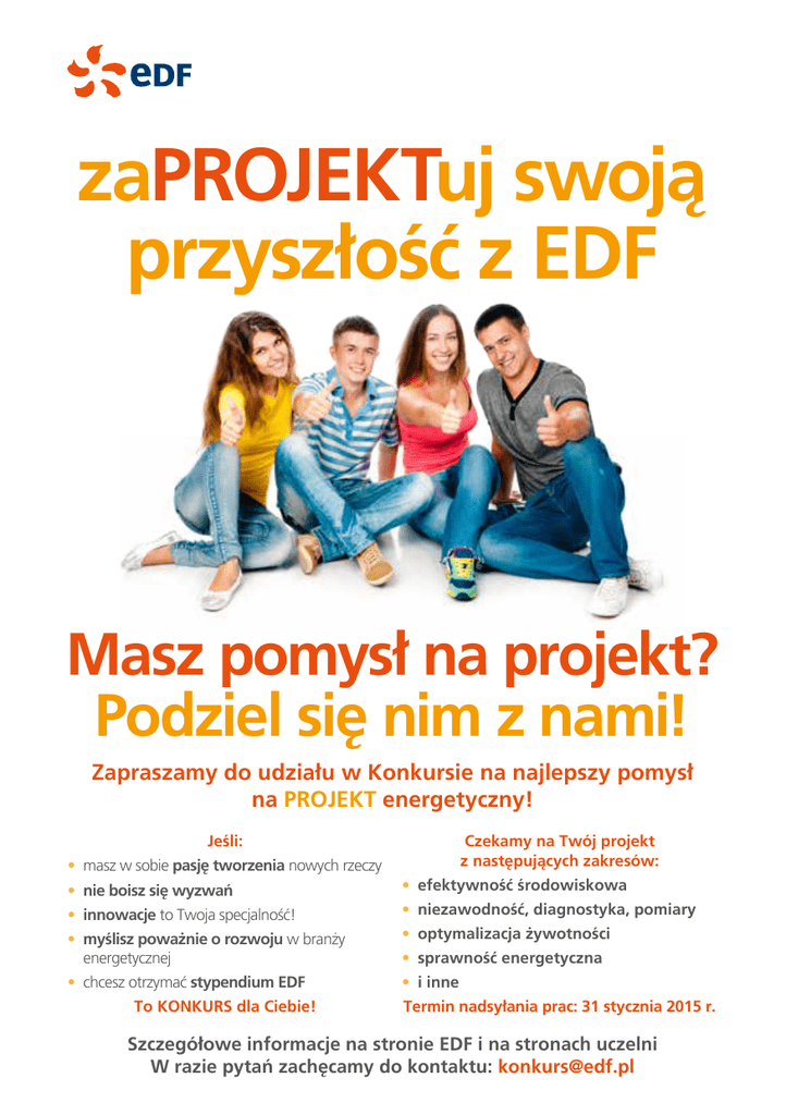 zaPROJEKTuj swoją przyszłość z EDF Masz pomysł na projekt? Podziel się nim z nami! Zapraszamy do udziału w Konkursie na najlepszy pomysł na PROJEKT energetyczny! Czekamy na Twój projekt z następujących zakresów: Jeśli: • masz w sobie pasję tworzenia nowych rzeczy • nie boisz się wyzwań • efektywność środowiskowa • innowacje to Twoja specjalność! • niezawodność, diagnostyka, pomiary • myślisz poważnie o rozwoju w branży energetycznej • optymalizacja żywotności • chcesz otrzymać stypendium EDF • i inne To KONKURS dla Ciebie! • sprawność energetyczna Termin nadsyłania prac: 31 stycznia 2015 r. Szczegółowe informacje na stronie EDF i na stronach uczelni W razie pytań zachęcamy do kontaktu: [email protected]