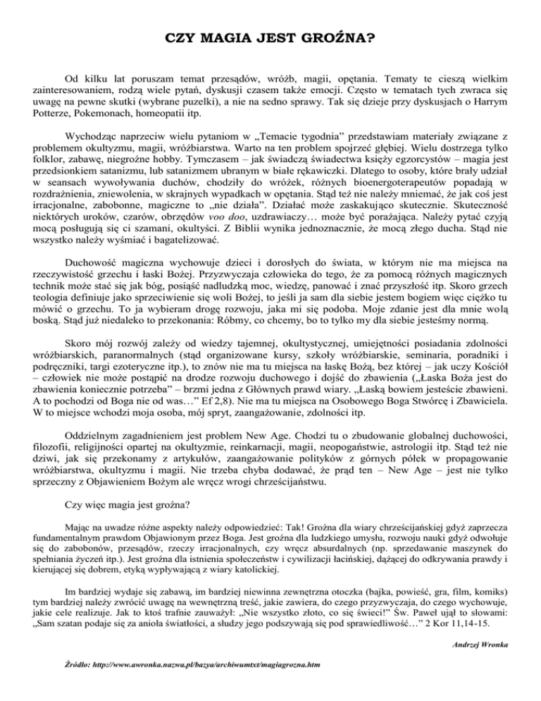 CZY MAGIA JEST GROŹNA? Od kilku lat poruszam temat przesądów, wróżb, magii, opętania. Tematy te cieszą wielkim zainteresowaniem, rodzą wiele pytań, dyskusji czasem także emocji. Często w tematach tych zwraca się uwagę na pewne skutki (wybrane puzelki), a nie na sedno sprawy. Tak się dzieje przy dyskusjach o Harrym Potterze, Pokemonach, homeopatii itp. Wychodząc naprzeciw wielu pytaniom w „Temacie tygodnia” przedstawiam materiały związane z problemem okultyzmu, magii, wróżbiarstwa. Warto na ten problem spojrzeć głębiej. Wielu dostrzega tylko folklor, zabawę, niegroźne hobby. Tymczasem – jak świadczą świadectwa księży egzorcystów – magia jest przedsionkiem satanizmu, lub satanizmem ubranym w białe rękawiczki. Dlatego to osoby, które brały udział w seansach wywoływania duchów, chodziły do wróżek, różnych bioenergoterapeutów popadają w rozdrażnienia, zniewolenia, w skrajnych wypadkach w opętania. Stąd też nie należy mniemać, że jak coś jest irracjonalne, zabobonne, magiczne to „nie działa”. Działać może zaskakująco skutecznie. Skuteczność niektórych uroków, czarów, obrzędów voo doo, uzdrawiaczy… może być porażająca. Należy pytać czyją mocą posługują się ci szamani, okultyści. Z Biblii wynika jednoznacznie, że mocą złego ducha. Stąd nie wszystko należy wyśmiać i bagatelizować. Duchowość magiczna wychowuje dzieci i dorosłych do świata, w którym nie ma miejsca na rzeczywistość grzechu i łaski Bożej. Przyzwyczaja człowieka do tego, że za pomocą różnych magicznych technik może stać się jak bóg, posiąść nadludzką moc, wiedzę, panować i znać przyszłość itp. Skoro grzech teologia definiuje jako sprzeciwienie się woli Bożej, to jeśli ja sam dla siebie jestem bogiem więc ciężko tu mówić o grzechu. To ja wybieram drogę rozwoju, jaka mi się podoba. Moje zdanie jest dla mnie wolą boską. Stąd już niedaleko to przekonania: Róbmy, co chcemy, bo to tylko my dla siebie jesteśmy normą. Skoro mój rozwój zależy od wiedzy tajemnej, okultystycznej, umiejętności posiadania zdolności wróżbiarskich, paranormalnych (stąd organizowane kursy, szkoły wróżbiarskie, seminaria, poradniki i podręczniki, targi ezoteryczne itp.), to znów nie ma tu miejsca na łaskę Bożą, bez której – jak uczy Kościół – człowiek nie może postąpić na drodze rozwoju duchowego i dojść do zbawienia („Łaska Boża jest do zbawienia koniecznie potrzeba” – brzmi jedna z Głównych prawd wiary. „Łaską bowiem jesteście zbawieni. A to pochodzi od Boga nie od was…” Ef 2,8). Nie ma tu miejsca na Osobowego Boga Stwórcę i Zbawiciela. W to miejsce wchodzi moja osoba, mój spryt, zaangażowanie, zdolności itp. Oddzielnym zagadnieniem jest problem New Age. Chodzi tu o zbudowanie globalnej duchowości, filozofii, religijności opartej na okultyzmie, reinkarnacji, magii, neopogaństwie, astrologii itp. Stąd też nie dziwi, jak się przekonamy z artykułów, zaangażowanie polityków z górnych półek w propagowanie wróżbiarstwa, okultyzmu i magii. Nie trzeba chyba dodawać, że prąd ten – New Age – jest nie tylko sprzeczny z Objawieniem Bożym ale wręcz wrogi chrześcijaństwu. Czy więc magia jest groźna? Mając na uwadze różne aspekty należy odpowiedzieć: Tak! Groźna dla wiary chrześcijańskiej gdyż zaprzecza fundamentalnym prawdom Objawionym przez Boga. Jest groźna dla ludzkiego umysłu, rozwoju nauki gdyż odwołuje się do zabobonów, przesądów, rzeczy irracjonalnych, czy wręcz absurdalnych (np. sprzedawanie maszynek do spełniania życzeń itp.). Jest groźna dla istnienia społeczeństw i cywilizacji łacińskiej, dążącej do odkrywania prawdy i kierującej się dobrem, etyką wypływającą z wiary katolickiej. Im bardziej wydaje się zabawą, im bardziej niewinna zewnętrzna otoczka (bajka, powieść, gra, film, komiks) tym bardziej należy zwrócić uwagę na wewnętrzną treść, jakie zawiera, do czego przyzwyczaja, do czego wychowuje, jakie cele realizuje. Jak to ktoś trafnie zauważył: „Nie wszystko złoto, co się świeci!” Św. Paweł ujął to słowami: „Sam szatan podaje się za anioła światłości, a słudzy jego podszywają się pod sprawiedliwość…” 2 Kor 11,14-15. Andrzej Wronka Źródło: http://www.awronka.nazwa.pl/bazya/archiwumtxt/magiagrozna.htm