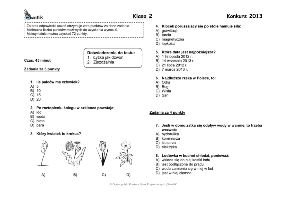 Klasa 2 Za brak odpowiedzi uczeń otrzymuje zero punktów za dane zadanie. Minimalna liczba punktów możliwych do uzyskania wynosi 0. Maksymalnie można uzyskać 72 punkty. Doświadczenia do testu: 1. Łyżka jak dzwon 2. Zjeżdżalnia Czas: 45 minut Zadania za 3 punkty 1. A) B) C) D) Ile palców ma człowiek? 5 10 15 20 2. A) B) C) D) Po roztopieniu śniegu w szklance powstaje: lód woda błoto para B) C) 4. A) B) C) D) Klocek poruszający się po stole hamuje siła: grawitacji tarcia magnetyczna lepkości 5. A) B) C) D) Która data jest najpóźniejsza? 1 listopada 2012 r. 14 września 2013 r. 21 lipca 2012 r. 7 marca 2013 r. 6. A) B) C) D) Najdłuższa rzeka w Polsce, to: Odra Bug Wisła San Zadania za 4 punkty 7. Jeśli w domu zatka się odpływ wody w wannie, to trzeba wezwać: A) hydraulika B) kominiarza C) ślusarza D) elektryka 3. Który kwiatek to krokus? A) Konkurs 2013 D) 8. A) B) C) D) Lodówka w kuchni chłodzi, ponieważ: wkłada się do niej kostki lodu jest podłączona do prądu woda zamienia się w niej w lód jest w niej ciemno © Ogólnopolski Konkurs Nauk Przyrodniczych „Świetlik” Klasa 2 9. Rozwiąż rebus: Konkurs 2013 12. Kiedy i po co ubieramy się „na cebulkę”? A) Gdy pada deszcz – po to, żeby nie zmoknąć. B) Gdy jest gorąco – po to, żeby się nie przegrzać. C) Gdy słońce mocno świeci – po to, żeby nie mieć poparzeń. D) Gdy jest zimno – po to, żeby nie zmarznąć. Zadania za 5 punktów 13. Przeczytaj uważnie tekst dotyczący świetlików. „Świetliki, zwane robaczkami świętojańskimi, są chrząszczami. Samiec ma ok. 1 cm długości i jest uskrzydlony, a samica osiąga długość do 2 cm i nie jest uskrzydlona.” Wyraz ten oznacza: A) szeroki balkon B) miejsce cięcia drewna C) osobę na wycieczce D) najwyższe góry w Polsce Która informacja jest nieprawdziwa? A) Świetliki są chrząszczami. B) Samce świetlików mają skrzydła. C) Samice świetlików mogą latać. D) Samce świetlików są mniejsze od samic. 10. W miejskiej oczyszczalni: A) pierze się ubrania B) rozdziela się śmieci i odzyskuje metal, szkło i plastik C) usuwa się brud ze ścieków i otrzymuje czystą wodę D) składuje się wszystkie śmieci z okolicy 11. Kiedy Filip wchodził do biblioteki, zegarek na jego ręce wskazywał godzinę 14:10. W tej samej chwili na ścianie przy wejściu Filip zobaczył zegar: A) B) C) 14. Przypomnij sobie doświadczenie z łyżką. Należało w nim rozhuśtać łyżkę zawieszoną na dwóch nitkach i uderzać nią o brzeg stołu. Kiedy się to robiło, a nitki były przyłożone do uszu, to: A) nic nie było słychać B) było słychać więcej dźwięków niż bez przykładania nitek do uszu C) było słychać mniej dźwięków niż bez przykładania nitek do uszu D) było słychać tyle samo dżwięków, co wtedy, gdy nitki nie były przyłożone do uszu D) © Ogólnopolski Konkurs Nauk Przyrodniczych „Świetlik” Klasa 2 15. Odczytaj szyfr i odgadnij rozwiązanie. Konkurs 2013 17. Przez cały tydzień Karolina robiła notatki pogody i zapisywała je w tabeli. Alfabet: E I R A D N T W Z J Szyfr: Które zdanie jest prawdziwe? A) Woda w kałużach zamarzała codziennie. B) Najcieplej było we wtorek i środę, a największe zachmurzenie było w drugiej połowie tygodnia. C) Najcieplej było w niedzielę, a największe zachmurzenie było w pierwszej połowie tygodnia. D) Najcieplej było w sobotę i w niedzielę, a najwięcej opadów było tuż przed weekendem (czytaj: łikendem) Rozwiązanie: A) płuco B) serce C) żołądek D) nerka 16. Michał miał wymienić w drewnianej zabawce nieco zardzewiałe śruby. Okazało się, że w domu nie ma nowych śrub, ale są odpowiednie gwoździe. Michał naprawił zabawkę. Jakich narzędzi musiał użyć? A) nożyczek i młotka B) nożyczek i śrubokręta C) śrubokręta i młotka D) młotka i magnesu © Ogólnopolski Konkurs Nauk Przyrodniczych „Świetlik” Klasa 2 Konkurs 2013 18. Każdy obrazek został podzielony na kolumny z numerkami. Znajdź 5 szczegółów, którymi różnią się te dwa obrazki. Odczytaj numery kolumn, w których znajdują się te szczegóły i otocz je kółeczkami w tabelce pod obrazkami. Przeczytaj po kolei od lewej do prawej litery pod kółeczkami w tabelce. W ten sposób utworzysz wyraz z pięciu liter. Znajdź w odpowiedziach, co on oznacza. 1 2 3 4 5 6 7 8 9 10 11 12 13 14 15 K M B W A E G N M A U N S T O Wyraz utworzony w tabelce oznacza: A) grząski, wilgotny teren B) jedną z planet C) gęstą ciecz z wulkanu D) żółty owoc © Ogólnopolski Konkurs Nauk Przyrodniczych „Świetlik”