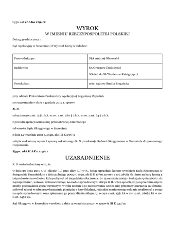 Sygn. akt II AKa 219/12 WYROK W IMIENIU RZECZYPOSPOLITEJ POLSKIEJ Dnia 5 grudnia 2012 r. Sąd Apelacyjny w Szczecinie, II Wydział Karny w składzie: Przewodniczący: SSA Andrzej Olszewski Sędziowie: SA Grzegorz Chojnowski SO del. do SA Waldemar Katzig (spr.) Protokolant: sekr. sądowy Emilia Biegańska przy udziale Prokuratora Prokuratury Apelacyjnej Bogusławy Zapaśnik po rozpoznaniu w dniu 5 grudnia 2012 r. sprawy K. S. oskarżonego z art. 13 § 1 k.k. w zw. z art. 280 § 2 k.k. w zw. z art. 64 § 2 k.k. z powodu apelacji wniesionej przez obrońcę oskarżonego od wyroku Sądu Okręgowego w Szczecinie z dnia 14 września 2012 r., sygn. akt III K 237/11 uchyla zaskarżony wyrok i sprawę oskarżonego K. S. przekazuje Sądowi Okręgowemu w Szczecinie do ponownego rozpoznania. Sygn. akt II AKa 219/12 UZASADNIENIE K. S. został oskarżony o to, że: w dniu 29 lipca 2011 r. w sklepie (...) przy ulicy (...) w P., będąc uprzednio karany wyrokiem Sądu Rejonowego w Stargardzie Szczecińskim z dnia 24 lutego 2005 r., sygn. akt II K 17/05 za czyn z art. 280§1 kk i inne na karę łączną 4 lat pozbawienia wolności, którą odbywał od 29 października 2004 r. do 13 września 2005 r. i od 23 sierpnia 2007 r. do 24 maja 2010 r., usiłował dokonać rozboju na osobie sprzedawczyni sklepu B. R. w ten sposób, że po uprzednim użyciu groźby pozbawienia życia trzymanym w ręku nożem i po zastosowaniu wobec niej przemocy szarpania za ubranie, usiłował zabrać w celu przywłaszczenia pieniądze z kasy fiskalnej, jednakże zamierzonego celu nie zrealizował z uwagi na opór sprzedawczyni oraz spłoszenie go przez klienta sklepu, tj. o czyn z art. 13§1 kk w zw. z art. 280§2 kk w zw. z art. 64§2 kk. Sąd Okręgowy w Szczecinie wyrokiem z dnia 14 września 2012 r. w sprawie III K 237/11: I. uznał oskarżonego K. S. za winnego tego, że w dniu 29 lipca 2011 r. w P., w sklepie przy ul. (...), będąc uprzednio karany wyrokiem Sądu Rejonowego w Stargardzie Szczecińskim z dnia 24.02.2005 r., sygn. akt II K 17/05, za przestępstwo z art. 197§1 i 2 kk w zb. z art. 157§1 kk w zb. z art. 280§1 kk w zw. z art. 11§2 kk w zw. z art. 64§1 kk na karę 4 lat pozbawienia wolności, przy czym kara ta została objęta karą łączną 4 lat pozbawienia wolności, którą odbywał od 28.10.2004 r. do 13.09.2005 r. i od 23.08.2007 r. do 24.05.2010 r., usiłował dokonać rozboju na sprzedawczyni B. R. w ten sposób, że trzymając w ręku nóż groził jej pozbawieniem życia oraz użył przemocy poprzez szarpanie jej za odzież i usiłował zabrać w celu przywłaszczenia pieniądze z kasy fiskalnej, jednak zamierzonego celu nie zrealizował z uwagi na opór B. R. i nadejście innej osoby, tj. popełnienia czynu z art. 13§1 kk w zw. z art. 280§2 kk w zw. z art. 64§2 kk i za to przestępstwo na podstawie art. 14§1 kk w zw. z art. 280§2 kk w zw. z art. 64§2 kk skazał go na karę 4 (czterech) lat pozbawienia wolności; II. na podstawie art. 63§1 kk na poczet wymierzonej oskarżonemu kary pozbawienia wolności zaliczył okres tymczasowego aresztowania oskarżonego od 22.08.2011r.; III. na podstawie art. 44§2 kk orzekł przepadek noża z drewnianą rękojeścią; IV. na podstawie art. 230§2 kk zwrócił K. S. buty sportowe marki (...); V. na podstawie art. 624§1 kpk zwolnił oskarżonego od zapłaty na rzecz Skarbu Państwa kosztów sądowych. Wyrok zaskarżył obrońca oskarżonego K. S.. Apelujący wyrokowi zarzucił obrazę przepisów postępowania mających wpływ na treść zaskarżonego wyroku, a to: I. art. 366§1 kpk, art. 167 kpk, art. 170§1 pkt 2 kpk – poprzez zaniechanie wyjaśnienia istotnej okoliczności w sprawie dotyczącej ustalenia cech wyglądu oraz tożsamości mężczyzny o pseudonimie (...) oraz oddalenia wniosków dowodowych obrońcy o przesłuchanie J. A. oraz A. O., zmierzających do ustalenia tych okoliczności, pomimo, iż jeden z naocznych świadków zdarzenia rozpoznał w sprawcy usiłowania rozboju mężczyznę o pseudonimie (...), a nadto w toku rozprawy oskarżony wskazywał na w/w świadków, których przesłuchanie na rozprawie mogło posłużyć ustaleniom tożsamości tego mężczyzny, a przynajmniej potwierdzić lub wykluczyć, czy mężczyzna o pseudonimie (...) jest podobny i w jakim stopniu do oskarżonego, II. art. 7 kpk oraz 5§2 kpk poprzez: a) dowolną ocenę dowodu w postaci opinii traseologicznej, polegającą na wyciągnięciu z treści opinii, jedynie wniosków na niekorzyść oskarżonego, podczas gdy opinia traseologiczna w swych wnioskach nie jest jednoznaczna i nie pozwala kategorycznie ustalić, czy ślady traseologiczne zabezpieczone na miejscu przestępstwa pochodziły od obuwia należącego do oskarżonego, b) nierozstrzygnięcie na korzyść oskarżonego nie dającej się usunąć przez Sąd I instancji wątpliwości, co do wiarygodności zeznań pokrzywdzonej B. R. w zakresie możliwości dostrzeżenia braków w uzębieniu w trakcie rozboju, III. art. 366§1 kpk, 368 kpk, 170§3 kpk i art. 201 kpk – poprzez jedynie częściowe rozpoznanie wniosku dowodowego obrońcy złożonego na rozprawie w dniu 12.04.2012 r. o przeprowadzenie dowodu z opinii biegłego sądowego, a tym samym nieuwzględnienie pozostałej części wniosku bez wydania stosowanego postanowienia w tym zakresie, w konsekwencji zaniechanie dążenia do uzyskania pełnej opinii z zakresu teleinformatyki, pozwalającej na ustalenie możliwości lokalizacyjnych karty sim oskarżonego, IV. art. 170§1 pkt 3 i 5 kpk – poprzez oddalenie wniosku dowodowego obrońcy o przeprowadzenie uzupełniającej opinii biegłego z zakresu teleinformatyki, podczas gdy sporządzona przez biegłego opinia była niepełna i nie dawała odpowiedzi na zakreślone w postanowieniu dowodowym pytanie, a jedynie zawierającej pouczenie o sposobie przeprowadzania pomiarów i obliczeń, które winy być dokonane przez biegłego, a nie przez Sąd, V. art. 193§1 kpk, art. 366§1 kpk i art. 167 kpk – po