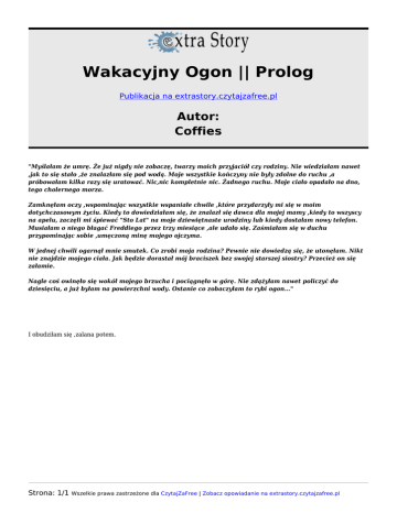 Wakacyjny Ogon || Prolog Publikacja na extrastory.czytajzafree.pl Autor: Coffies "Myślałam że umrę. Że już nigdy nie zobaczę, twarzy moich przyjaciół czy rodziny. Nie wiedziałam nawet ,jak to się stało ,że znalazłam się pod wodą. Moje wszystkie kończyny nie były zdolne do ruchu ,a próbowałam kilka razy się uratować. Nic,nic kompletnie nic. Żadnego ruchu. Moje ciało opadało na dno, tego cholernego morza. Zamknęłam oczy ,wspominając wszystkie wspaniałe chwile ,które przydarzyły mi się w moim dotychczasowym życiu. Kiedy to dowiedziałam się, że znalazł się dawca dla mojej mamy ,kiedy to wszyscy na apelu, zaczęli mi śpiewać "Sto Lat" na moje dziewiętnaste urodziny lub kiedy dostałam nowy telefon. Musiałam o niego błagać Freddiego przez trzy miesiące ,ale udało się. Zaśmiałam się w duchu przypominając sobie ,umęczoną minę mojego ojczyma. W jednej chwili ogarnął mnie smutek. Co zrobi moja rodzina? Pewnie nie dowiedzą się, że utonęłam. Nikt nie znajdzie mojego ciała. Jak będzie dorastał mój braciszek bez swojej starszej siostry? Przecież on się załamie. Nagle coś owinęło się wokół mojego brzucha i pociągnęło w górę. Nie zdążyłam nawet policzyć do dziesięciu, a już byłam na powierzchni wody. Ostanie co zobaczyłam to rybi ogon..." I obudziłam się ,zalana potem. Strona: 1/1 Wszelkie prawa zastrzeżone dla CzytajZaFree | Zobacz opowiadanie na extrastory.czytajzafree.pl