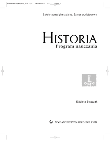 HIS-krawczyk-prog_STR tyt 29/08/2007 09:21 Page 1 Szko∏y ponadgimnazjalne. Zakres podstawowy El˝bieta Straszak WYDAWNICTWO SZKOLNE PWN Projekt strony tytu∏owej Rados∏aw Krawczyk Redaktor Beata Biƒko Redaktor techniczny El˝bieta Czechak Program dopuszczony do u˝ytku szkolnego przez ministra w∏aÊciwego do spraw oÊwiaty i wychowania i wpisany do wykazu programów szkolnych do kszta∏cenia ogólnego do nauczania historii (w zakresie podstawowym) na poziomie liceum ogólnokszta∏càcego, liceum profilowanego i technikum na podstawie recenzji rzeczoznawców: prof. dr. hab. Stanis∏awa Litaka – z rekomendacji Katolickiego Uniwersytetu Lubelskiego, dr. Wita Górczyƒskiego – z rekomendacji Polskiego Towarzystwa Historycznego. Numer dopuszczenia: DKOS-5002-68/07 Copyright © by Wydawnictwo Szkolne PWN Sp. z o.o. Warszawa 2007 ISBN 978-83-7446-195-5 Spis treÊci Ogólna charakterystyka programu . . . . . . . . . . . . . . . . . . . . . . . . . . . . . . 5 Cele edukacyjne . . . . . . . . . . . . . . . . . . . . . . . . . . . . . . . . . . . . . . . . . . 8 TreÊci nauczania . . . . . . . . . . . . . . . . . . . . . . . . . . . . . . . . . . . . . . . . . 11 Procedury osiàgania celów . . . . . . . . . . . . . . . . . . . . . . . . . . . . . . . . . . . 22 Przewidywane osiàgni´cia uczniów . . . . . . . . . . . . . . . . . . . . . . . . . . . . . 24 Kontrola i ocena osiàgni´ç ucznia . . . . . . . . . . . . . . . . . . . . . . . . . . . . . . 28 Ogólna charakterystyka programu Program nauczania historii w zakresie podstawowym jest przeznaczony dla szkó∏ ponadgimnazjalnych i zosta∏ przygotowany z myÊlà o trzytomowym podr´czniku Historia. Podr´cznik dla kl. I–III szkó∏ ponadgimnazjalnych, zakres podstawowy. Program jest tak skonstruowany, aby w klasie III mo˝na by∏o zajàç si´ historià najnowszà, na którà zwykle brakuje czasu, oraz powtórzeniami do matury. Program zawiera treÊci od czasów najdawniejszych do wydarzeƒ najnowszych, czyli do poczàtków XXI wieku, przy czym zagadnienia dotyczàce okresu po 1990 r. zosta∏y potraktowane skrótowo, jako nale˝àce równie˝ do zakresu wiedzy o spo∏eczeƒstwie. Uk∏ad treÊci programowych jest nast´pujàcy: – w klasie I – materia∏ od czasów najdawniejszych do po∏owy XVII wieku (wojna trzydziestoletnia oraz pierwsi Wazowie na tronie Polski); – w klasie II – materia∏ do poczàtków drugiej wojny Êwiatowej; – w klasie III – materia∏ do prze∏omu 1989 roku – przemian ustrojowych w Europie Ârodkowo-Wschodniej i wyborów 1990 r. w Polsce, oraz potraktowane w sposób skrótowy zagadnienia z lat ostatnich. Cezura koƒcowa materia∏u klasy I i II jest spowodowana przydzia∏em godzin na ten przedmiot w zakresie podstawowym, który zwykle wynosi w klasie I i II 2 godziny tygodniowo, a w klasie III – 1 godzina (cykl trzyletni to 5 godzin tygodniowo). Poza tym, co wynika z badaƒ, a tak˝e z wyników egzaminu maturalnego, uczniowie bardzo dobrze znajà treÊci programowe odnoszàce si´ do dziejów od staro˝ytnoÊci po wiek XIX. Im bardziej treÊci historyczne zbli˝ajà si´ do wspó∏czesnoÊci, tym wi´kszà luk´ wiedzy postrzega si´ wÊród uczniów. Dzieje si´ tak dlatego, ˝e wczeÊniejsze dzieje uczniowie omawiajà nawet trzykrotnie (szko∏a podstawowa, gimnazjum, szko∏a ponadgimnazjalna), natomiast na przekazanie wiedzy z historii najnowszej najcz´Êciej brakuje czasu, gdy˝ sà to treÊci, które przeznacza si´ do omówienia w II semestrze klasy VI, III gimnazjum lub III liceum, gdy szko∏y koncentrujà si´ na egzaminach koƒcowych. Aby zapobiec powstawaniu takiej luki w znajomoÊci dziejów najnowszych, zdecydowano si´ zmieniç cezury czasowe zagadnieƒ historycznych przeznaczonych do omówienia w kolejnych klasach. Program zosta∏ opracowany zgodnie z Rozporzàdzeniem Ministra Edukacji Narodowej i Sportu z dnia 26 lutego 2002 r. w sprawie podstawy programowej wychowania przedszkolnego oraz kszta∏cenia ogólnego w poszczególnych typach szkó∏ i Rozporzàdzeniem z dnia 6 listopada 2003 r. zmieniajàcym to rozporzàdzenie, a tak˝e z Rozporzàdzeniem z dnia 10 kwietnia 2003 r. w sprawie standardów wymagaƒ egzaminacyjnych. Copyright © by Wydawnictwo Szkolne PWN 5 Zawarte w programie cele i treÊci nauczania uwzgl´dniajà równie˝ zagadnienia z podstawy programowej nast´pujàcych Êcie˝ek edukacyjnych: edukacji regionalnej, edukacji europejskiej, edukacji filozoficznej, edukacji ekologicznej oraz edukacji czytelniczej i medialnej. Dzi´ki temu mo˝liwe jest pe∏niejsze opanowanie wiedzy i umiej´tnoÊci przewidzianych w standardach wymagaƒ egzaminacyjnych. TreÊci programowe zosta∏y u∏o˝one w uj´ciu chronologiczno-zagadnieniowym, z podzia∏em na pi´ç g∏ównych epok, od Êredniowiecza z wyodr´bnieniem dziejów powszechnych i historii Polski. Zosta∏o to podyktowane kilkuletnim doÊwiadczeniem pracy w zreformowanym, trzyletnim liceum. Nauczyciel w szko∏ach ponadgimnazjalnych podejmuje prac´ w klasie I z m∏odzie˝à o bardzo ró˝nym poziomie wiedzy historycznej i wymaganych umiej´tnoÊci. Z tego wzgl´du ∏atwiej jest mu pracowaç z uczniami w sposób znany im z gimnazjum, tj. przez chronologiczne omawianie dziejów ludzkoÊci. Zagadnienia programowe obejmujà nie tylko histori´ politycznà, ale w du˝ej mierze dotyczà problematyki spo∏eczno-gospodarczej i kulturalnej. Dzi´ki temu uczniowie poznajà dzieje w szerokim uj´ciu cywilizacyjnym, ∏atwiej dostrzegajà specyfik´ ró˝nych epok, uÊwiadamiajà sobie ró˝nice w sposobie ˝ycia, myÊlenia i wizji Êwiata ˝yjàcych wówczas ludzi. Pozwala to kszta∏towaç postawy zrozumienia i tolerancji wobec odmiennych kultur, obyczajów i przekonaƒ. Cz´Êç tematów w programie ma charakter przekrojowy, by umo˝liwiç uczniom zapoznanie si´ tak˝e z uj´ciem problemowym, pozwalajàcym spojrzeç na minionà przesz∏oÊç z innej perspektywy i lepiej jà zrozumieç. Na nauczycie