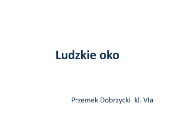 Ludzkie oko Przemek Dobrzycki kl. VIa Cel doświadczenia • Sprawdzenie jak i jaki obraz powstaje we wnętrzu naszego oka ? Hipoteza • Obraz we wnętrzu naszego oka jest odwrócony i dopiero w mózgu zostaje przetwarzany, dlatego oglądany przez nas świat jest taki jak w rzeczywistości (widziane rzeczy ,,nie stoją na głowie’’). Materiały • kieliszek do wina lub inne jak najbardziej kuliste naczynie z bezbarwnego szkła • czarny karton papieru lub tekturę A5 • świeczkę • zapałki • białą kartkę A4 • plastelinę • ołówek • wodę • linijkę • stół lub biurko Obserwacje • Zbudowałem model ludzkiego oka. Czarna kartka zastąpiła źrenicę, soczewka to kieliszek z wodą a siatkówka to karta białego papieru. Na białej kartce można było zauważyć wyraźny lecz odwrócony obraz kieliszka i świeczki. Zdjęcia z doświadczenia Wnioski • Obraz we wnętrzu oka widziany jest tak jak na białej kartce czyli odwrócony. • W oku na siatkówce powstaje obraz odwrócony