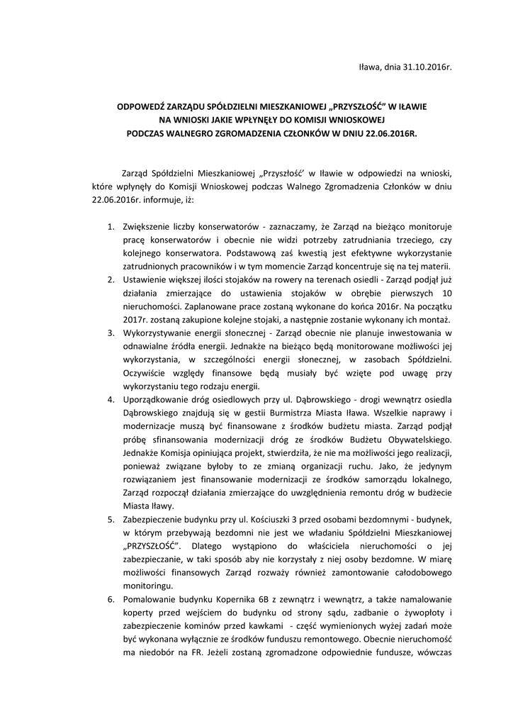 Iława, dnia 31.10.2016r. ODPOWEDŹ ZARZĄDU SPÓŁDZIELNI MIESZKANIOWEJ „PRZYSZŁOŚĆ” W IŁAWIE NA WNIOSKI JAKIE WPŁYNĘŁY DO KOMISJI WNIOSKOWEJ PODCZAS WALNEGRO ZGROMADZENIA CZŁONKÓW W DNIU 22.06.2016R. Zarząd Spółdzielni Mieszkaniowej „Przyszłość’ w Iławie w odpowiedzi na wnioski, które wpłynęły do Komisji Wnioskowej podczas Walnego Zgromadzenia Członków w dniu 22.06.2016r. informuje, iż: 1. Zwiększenie liczby konserwatorów - zaznaczamy, że Zarząd na bieżąco monitoruje pracę konserwatorów i obecnie nie widzi potrzeby zatrudniania trzeciego, czy kolejnego konserwatora. Podstawową zaś kwestią jest efektywne wykorzystanie zatrudnionych pracowników i w tym momencie Zarząd koncentruje się na tej materii. 2. Ustawienie większej ilości stojaków na rowery na terenach osiedli - Zarząd podjął już działania zmierzające do ustawienia stojaków w obrębie pierwszych 10 nieruchomości. Zaplanowane prace zostaną wykonane do końca 2016r. Na początku 2017r. zostaną zakupione kolejne stojaki, a następnie zostanie wykonany ich montaż. 3. Wykorzystywanie energii słonecznej - Zarząd obecnie nie planuje inwestowania w odnawialne źródła energii. Jednakże na bieżąco będą monitorowane możliwości jej wykorzystania, w szczególności energii słonecznej, w zasobach Spółdzielni. Oczywiście względy finansowe będą musiały być wzięte pod uwagę przy wykorzystaniu tego rodzaju energii. 4. Uporządkowanie dróg osiedlowych przy ul. Dąbrowskiego - drogi wewnątrz osiedla Dąbrowskiego znajdują się w gestii Burmistrza Miasta Iława. Wszelkie naprawy i modernizacje muszą być finansowane z środków budżetu miasta. Zarząd podjął próbę sfinansowania modernizacji dróg ze środków Budżetu Obywatelskiego. Jednakże Komisja opiniująca projekt, stwierdziła, że nie ma możliwości jego realizacji, ponieważ związane byłoby to ze zmianą organizacji ruchu. Jako, że jedynym rozwiązaniem jest finansowanie modernizacji ze środków samorządu lokalnego, Zarząd rozpoczął działania zmierzające do uwzględnienia remontu dróg w budżecie Miasta Iławy. 5. Zabezpieczenie budynku przy ul. Kościuszki 3 przed osobami bezdomnymi - budynek, w którym przebywają bezdomni nie jest we władaniu Spółdzielni Mieszkaniowej „PRZYSZŁOŚĆ”. Dlatego wystąpiono do właściciela nieruchomości o jej zabezpieczanie, w taki sposób aby nie korzystały z niej osoby bezdomne. W miarę możliwości finansowych Zarząd rozważy również zamontowanie całodobowego monitoringu. 6. Pomalowanie budynku Kopernika 6B z zewnątrz i wewnątrz, a także namalowanie koperty przed wejściem do budynku od strony sądu, zadbanie o żywopłoty i zabezpieczenie kominów przed kawkami - część wymienionych wyżej zadań może być wykonana wyłącznie ze środków funduszu remontowego. Obecnie nieruchomość ma niedobór na FR. Jeżeli zostaną zgromadzone odpowiednie fundusze, wówczas prace wymienione wyżej będą ujęte w planie remontów. Zadania nie wymagające środków FR będą wykonywane sukcesywnie. 7. Zwrócenie uwagi na jakość sprzątania na osiedlu Dąbrowskiego oraz w budynku Kopernika 6B - firmy sprzątające przedkładają comiesięczny harmonogram sprzątania wg którego jest kontrolowana jakość świadczonych usług. Ponadto przeprowadzono rozmowy odnośnie kształtu współpracy z firmami sprzątającymi, tak aby możliwe było podniesienie jakości świadczonych przez nie usług. 8. Zorganizowanie spotkania z mieszkańcami budynku Kopernika 3 oraz dzielnicowym – Zarząd już rozmawiał z częścią mieszkańców. W czasie spotkania rozmawiano na temat problemów związanych z nieruchomością. Termin spotkania ze wszystkimi mieszkańcami jest przewidziany na koniec miesiąca listopada 2016. /Zarząd Spółdzielni/