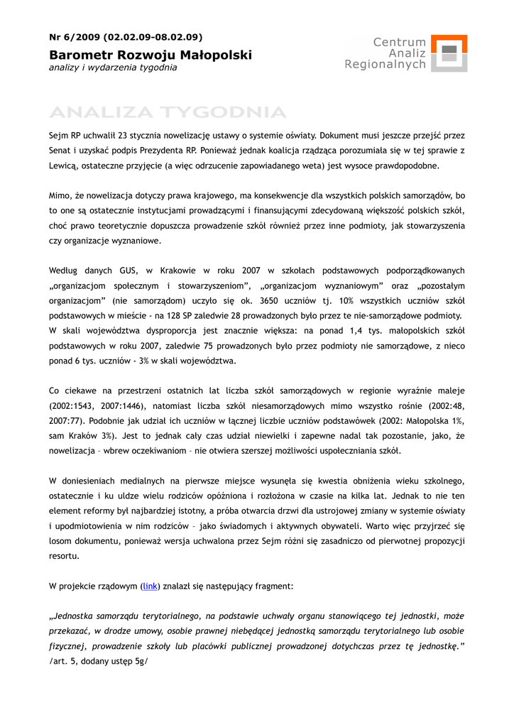 Nr 6/2009 (02.02.09-08.02.09) Barometr Rozwoju Małopolski analizy i wydarzenia tygodnia ANALIZA TYGODNIA Sejm RP uchwalił 23 stycznia nowelizację ustawy o systemie oświaty. Dokument musi jeszcze przejść przez Senat i uzyskać podpis Prezydenta RP. Ponieważ jednak koalicja rządząca porozumiała się w tej sprawie z Lewicą, ostateczne przyjęcie (a więc odrzucenie zapowiadanego weta) jest wysoce prawdopodobne. Mimo, że nowelizacja dotyczy prawa krajowego, ma konsekwencje dla wszystkich polskich samorządów, bo to one są ostatecznie instytucjami prowadzącymi i finansującymi zdecydowaną większość polskich szkół, choć prawo teoretycznie dopuszcza prowadzenie szkół również przez inne podmioty, jak stowarzyszenia czy organizacje wyznaniowe. Według danych GUS, w Krakowie w roku 2007 w szkołach podstawowych podporządkowanych „organizacjom społecznym i stowarzyszeniom”, „organizacjom wyznaniowym” oraz „pozostałym organizacjom” (nie samorządom) uczyło się ok. 3650 uczniów tj. 10% wszystkich uczniów szkół podstawowych w mieście - na 128 SP zaledwie 28 prowadzonych było przez te nie-samorządowe podmioty. W skali województwa dysproporcja jest znacznie większa: na ponad 1,4 tys. małopolskich szkół podstawowych w roku 2007, zaledwie 75 prowadzonych było przez podmioty nie samorządowe, z nieco ponad 6 tys. uczniów - 3% w skali województwa. Co ciekawe na przestrzeni ostatnich lat liczba szkół samorządowych w regionie wyraźnie maleje (2002:1543, 2007:1446), natomiast liczba szkół niesamorządowych mimo wszystko rośnie (2002:48, 2007:77). Podobnie jak udział ich uczniów w łącznej liczbie uczniów podstawówek (2002: Małopolska 1%, sam Kraków 3%). Jest to jednak cały czas udział niewielki i zapewne nadal tak pozostanie, jako, że nowelizacja – wbrew oczekiwaniom – nie otwiera szerszej możliwości uspołeczniania szkół. W doniesieniach medialnych na pierwsze miejsce wysunęła się kwestia obniżenia wieku szkolnego, ostatecznie i ku uldze wielu rodziców opóźniona i rozłożona w czasie na kilka lat. Jednak to nie ten element reformy był najbardziej istotny, a próba otwarcia drzwi dla ustrojowej zmiany w systemie oświaty i upodmiotowienia w nim rodziców – jako świadomych i aktywnych obywateli. Warto więc przyjrzeć się losom dokumentu, ponieważ wersja uchwalona przez Sejm różni się zasadniczo od pierwotnej propozycji resortu. W projekcie rządowym (link) znalazł się następujący fragment: „Jednostka samorządu terytorialnego, na podstawie uchwały organu stanowiącego tej jednostki, może przekazać, w drodze umowy, osobie prawnej niebędącej jednostką samorządu terytorialnego lub osobie fizycznej, prowadzenie szkoły lub placówki publicznej prowadzonej dotychczas przez tę jednostkę.” /art. 5, dodany ustęp 5g/ Nr 6/2009 (02.02.09-08.02.09) Barometr Rozwoju Małopolski analizy i wydarzenia tygodnia Zmiana ta była oczekiwana przez wiele samorządów w Polsce. Dawała bowiem możliwość wprowadzenia do szkół nowego, zmotywowanego aktora (np. stowarzyszenia rodziców czy fundacji), ponoszącego realną odpowiedzialność za finanse placówki. Oczekiwany skutek: bardziej racjonalne – a więc i oszczędne – zarządzanie szkołami. Uwolnione środki można by przeznaczyć np. na bardziej elastyczny, motywacyjny system wynagrodzeń, zawieszeniu uległa by bowiem część zapisów „Karty Nauczyciela”. Zyskaliby więc: rodzice (większy wpływ na szkołę ich dzieci), samorządy (odciążenie administracji i oszczędności), a także dobrzy nauczyciele (potencjalnie wyższe pensje). Dzieci, co najważniejsze, zyskałyby lepszą, bardziej przyjazną szkołę. Należy podkreślić, że placówki utrzymywałyby obowiązkowo status publiczny, a więc nauka w nich byłaby w dalszym ciągu bezpłatna. Setki podobnych przekształceń, dot. głównie zagrożonych likwidacją małych szkół wiejskich, udało się przeprowadzić np. przy udziale Federacji Inicjatyw Oświatowych. Ale nie tylko: wybrane samorządy w Polsce „uspołeczniły” dużą część swoich szkół niezależnie od ich wielkości, godne polecenia jest tu np. success story gminy Jarocin. Do tej pory operacja była bardzo skomplikowana formalnie, wymagała w praktyce likwidacji placówki i powołania na jej miejsce nowej. To generowało dodatkowe koszty, co w sytuacji szukania oszczędności jest paradoksem. Dlatego pomysły resortu edukacji były w tym punkcie zgodne z rekomendacjami zespołu ekspertów edukacyjnych CAR (tutaj). Niestety, te dobre praktyki nie zostaną upowszechnione. W konsekwencji m.in. lobbingu Związku Nauczycielstwa Polskiego, ministerstwo wycofało się ze swojej propozycji, zaś stosowny ustęp zyskał następujące brzmienie (pełna ustawa tutaj): „Jednostka samorządu terytorialnego, będąca organem prowadzącym szkołę liczącą nie więcej niż 70 uczniów, na podstawie uchwały organu stanowiącego tej jednostki oraz po uzyskaniu pozytywnej opinii kuratora oświaty, może przekazać, w drodze umowy, osobie prawnej niebędącej jednostką samorządu terytorialnego lub osobie fizycznej prowadzenie tej szkoły.” Możliwość uspołecznienia została więc ograniczona do szkół nie tyle małych, co mikroskopijnych, a dodatkowo wymaga zgody kuratora. Oznacza to de facto zaniechanie potencjalnie największej reformy polskiej edukacji po 1989 roku. Jest to fatalna wiadomość dla samorządów i wszystkich rodziców w Polsce. Arcyparadoksem jest fakt, że ułatwiono procedurę likwidacji szkoły: wymagana jest jedynie opinia, a nie zgoda kuratora oświaty (jak wynikało z dotychczas obowiązujących zapisów ustawy). Efekt będzie taki, że szkoły nierentowne (na wsi, ale nie tylko) liczące więcej niż 70 uczniów będzie samorządom znacznie łatwiej zlikwidować, niż ocalić przy udziale rodziców i nauczycieli. Ścieżka uspołecznienia nie jest dzięki temu całkiem zamknięta, ale droższa i bar