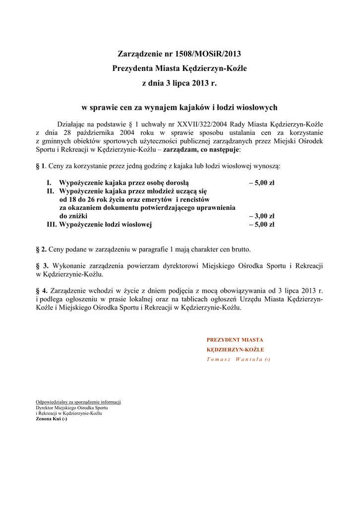 Zarządzenie nr 1508/MOSiR/2013 Prezydenta Miasta Kędzierzyn-Koźle z dnia 3 lipca 2013 r. w sprawie cen za wynajem kajaków i łodzi wiosłowych Działając na podstawie § 1 uchwały nr XXVII/322/2004 Rady Miasta Kędzierzyn-Koźle z dnia 28 października 2004 roku w sprawie sposobu ustalania cen za korzystanie z gminnych obiektów sportowych użyteczności publicznej zarządzanych przez Miejski Ośrodek Sportu i Rekreacji w Kędzierzynie-Koźlu – zarządzam, co następuje: § 1. Ceny za korzystanie przez jedną godzinę z kajaka lub łodzi wiosłowej wynoszą: I. Wypożyczenie kajaka przez osobę dorosłą II. Wypożyczenie kajaka przez młodzież uczącą się od 18 do 26 rok życia oraz emerytów i rencistów za okazaniem dokumentu potwierdzającego uprawnienia do zniżki III. Wypożyczenie łodzi wiosłowej – 5,00 zł – 3,00 zł – 5,00 zł § 2. Ceny podane w zarządzeniu w paragrafie 1 mają charakter cen brutto. § 3. Wykonanie zarządzenia powierzam dyrektorowi Miejskiego Ośrodka Sportu i Rekreacji w Kędzierzynie-Koźlu. § 4. Zarządzenie wchodzi w życie z dniem podjęcia z mocą obowiązywania od 3 lipca 2013 r. i podlega ogłoszeniu w prasie lokalnej oraz na tablicach ogłoszeń Urzędu Miasta KędzierzynKoźle i Miejskiego Ośrodka Sportu i Rekreacji w Kędzierzynie-Koźlu. PREZYDENT MIASTA KĘDZIERZYN-KOŹLE T o m a s z W a n t u ł a (-) Odpowiedzialny za sporządzenie informacji Dyrektor Miejskiego Ośrodka Sportu i Rekreacji w Kędzierzynie-Koźlu Zenona Kuś (-)