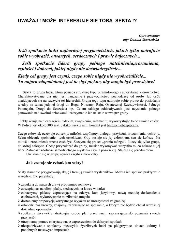 UWAŻAJ ! MOŻE INTERESUJE SIĘ TOBĄ SEKTA !? Opracowanie: mgr Danuta Skarżeńska Jeśli spotkacie ludzi najbardziej przyjacielskich, jakich tylko potraficie sobie wyobrazić, otwartych, serdecznych i prawie bajecznych... Jeśli spotkacie lidera grupy pełnego natchnienia,zrozumienia, czułości i dobroci, jakiej nigdy nie doświadczyliście... Kiedy cel grupy jest czymś, czego sobie nigdy nie wyobrażaliście... To najprawdopodobniej jest to zbyt piękne, aby mogło być prawdziwe! Sekta to grupa ludzi, która posiada strukturę typu piramidowego i autorytarne kierownictwo. Charakterystyczne dla niej jest nauczanie i przewodnictwo pochodzące od osoby lub osób znajdujących się na szczycie tej hierarchii. Grupa tego typu uzurpuje sobie prawo do posiadania wiedzy na temat jedynej drogi do Boga, Nirwany, Raju, Ostatecznej Rzeczywistości, Pełnego Potencjału, Drogi do Szczęścia itp. Celem takiego oddziaływania jest uzyskanie pełnego panowania nad swoimi członkami i zatrzymanie ich na stałe wewnątrz grupy. Sekty żerują na nieszczęściu ludzkim, zwątpieniu, załamaniu, wykorzystując to do swoich celów. W Polsce jest około 300 sekt. Jakikolwiek z nimi kontakt jest bardzo niebezpieczny. Czego człowiek oczekuje od sekty: miłości, wspólnoty, dialogu, przyjaźni, zrozumienia, ochrony. Sekta obiecuje spełnienie tych oczekiwań. Gdy zostaje się jej członkiem, sen się kończy. Na miłość i zrozumienie trzeba zasłużyć. Zaczyna się proces „prania mózgu”. Liczy się tylko grupa, do której należysz. Chcąc przynależeć do grupy, musisz wykonywać wszystko to, co nakaże ci jej lider. Zatracasz zdolność samodzielnego myślenia i życia poza sektą. Stajesz się przedmiotem. Uwikłanie się w grupę wynika często z niewiedzy. Jak zostaje się członkiem sekty? Sekty starannie przygotowują akcję i trenują swoich wysłanników. Można ich spotkać praktycznie wszędzie. Oto przykłady: zapukają do naszych drzwi proponując rozmowę zaczepią nas na ulicy, plaży, siedzących na ławce w parku zobaczymy plakaty zapraszające na odczyt, kurs językowy, nową metodę doskonalenia osobowości, wykorzystanie możliwości umysłu dostaniemy propozycję korzystnego wyjazdu na uroczystości za granicę odwiedzi nas krewny, znajomy, zapraszając na spotkanie, o którym nie będzie chciał wcześniej dokładnie opowiadać spotkamy niezwykle atrakcyjną osobę płci przeciwnej, zapraszającą do poznania swoich przyjaciół otrzymamy pomoc charytatywną z zaproszeniem do dalszych spotkań niespodziewanie spotkamy niezwykle życzliwych ludzi na pielgrzymce, dniach kultury i podobnych masowych imprezach przeczytamy w gazecie entuzjastyczny artykuł o super technikach poprawy funkcjonowania mózgu sławny aktor opowie w telewizji o swoich ekscytujących doświadczeniach z nową religią nasz rozmówca na sieci internetowej będzie miał ekstra propozycję Jak rozpoznać sektę? Rekrutacja do sekt odbywa się w sposób coraz bardziej dyskretny i zawoalowany. Stephen Hassan w swej książce „Psychomanipulacja w sektach” proponuje zadać kilka pytań, dzięki którym można pozbyć się rekrutujących: 1. Czy próbujesz mnie namówić, bym wstąpił do jakiejś organizacji? Jak długo sam do niej należysz? Jeżeli mamy do czynienia z próbą werbunku, odpowiedzi będą niejasne, mało precyzyjne. 2. Czy możesz podać mi nazwę innych organizacji związanych z grupą? Jeśli rekrutujący powie, że nic nie wie na ten temat, poproś go, aby się dowiedział. Następnego dnia zadzwoń i spytaj, co zdołał ustalić. 3. Jakie są przekonania grupy, do której należysz? Każda uczciwa organizacja może przedstawić w skrócie swe główne założenia. Sekty często nie chcą tego robić. Jeżeli zorientujesz się, że przedstawiono ci wypaczoną wersję, pełną nieścisłości – odejdź. Żadna legalna organizacja nie pomaga ludziom, okłamując ich. 4. Czego oczekuje się od kogoś, kto wstępuje do organizacji? Masz prawo do uzasadnionych podejrzeń, jeśli rekrutujący unika odpowiedzi bądź próbuje ci tłumaczyć, że grupa nie będzie miała wobec ciebie żadnych oczekiwań, gdy do niej wstąpisz 5. Czy są ludzi, którzy mają zastrzeżenia wobec twojej grupy? A jeśli ją krytykują, to za co? Bardzo często można usłyszeć: „Och, niektórzy ludzie uważają nas za sektę i myślą, że zrobiono nam pranie mózgu. Czy ja wyglądam na kogoś, kto przeszedł pranie mózgu? 6. Jakie uczucia budzą w tobie byli członkowie twojej organizacji? Czy za utrzymywanie kontaktu z byłymi członkami mogą cię spotkać nieprzyjemności ze strony grupy? W sektach nie akceptuje się odejścia bez względu na powód. Doświadczony rekrutujący może powiedzieć: „Pewnie, kilku moich przyjaciół odeszło.” Jeśli będziesz drążył ten temat, przekonasz się, że kłamie. 7. Co w postępowaniu grupy i przywódcy najmniej ci odpowiada? Wymień chociaż trzy takie rzeczy. Jeśli uda ci się zaskoczyć rekrutującego takim pytaniem, obserwuj uważnie jego twarz. Źrenice mu się rozszerzą i przez chwilę będzie oszołomiony. W odpowiedzi najprawdopodobniej usłyszysz, że nie ma niczego, czego by nie lubił.. Osoba rekrutująca jak najmniej mówi o grupie, natomiast usiłuje zgromadzić jak najwięcej informacji o kandydacie. Pamiętaj: Nie podawaj zbyt pochopnie swojego adresu, numeru telefonu. Sekty nie rezygnują łatwo. Wielu ludzi poddaje się długotrwałemu naciskowi. Przydatne adresy i telefony : 1. Dominikańskie Centrum Informacji o Sektach i Nowych Ruchach Religijnych 31 – 043 Kraków ul. Dominikańska 3 .tel . 012 / 423-11-81 2. Stowarzyszenie „ Civitas Christiana „ Małopolski Ośrodek Informacji o Sektach i Nowych Ruchach Religijnych 31 – 131 Kraków ul. Garbarska 9 . tel . 012/ 422-21-11 3. Katolickie Centrum Edukacji Młodzieży „ Kana „ 40 – 014 Katowice ul. Szramka 4 tel. 03 2 / 253-04-55 44-240 Żory ul. Garncarska 16a tel . 032 / 435-