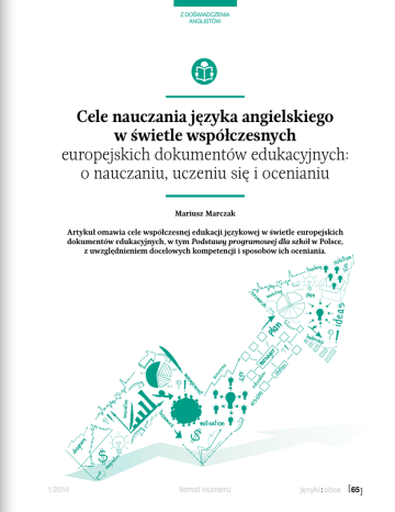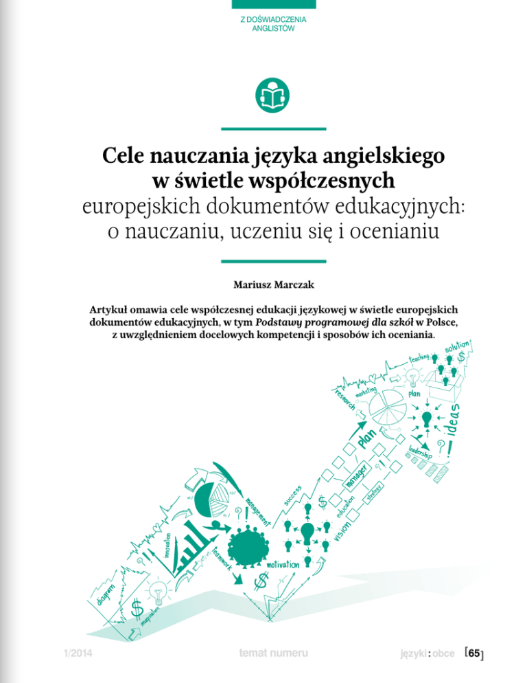 z doświadczenia anglistów Cele nauczania języka angielskiego w świetle współczesnych europejskich dokumentów edukacyjnych: o nauczaniu, uczeniu się i ocenianiu Mariusz Marczak Artykuł omawia cele współczesnej edukacji językowej w świetle europejskich dokumentów edukacyjnych, w tym Podstawy programowej dla szkół w Polsce, z uwzględnieniem docelowych kompetencji i sposobów ich oceniania. 1/2014 temat numeru [ 65 ] z doświadczenia anglistów Kontekst europejski: CEFR i kompetencje kluczowe Dwa kluczowe dokumenty, które w dużej mierze kształtują politykę edukacyjną w krajach europejskich, to: Europejski system opisu kształcenia językowego: uczenie się, nauczanie, ocenianie (The Common European Framework of Reference for Languages: learning, teaching, assessment (Council of Europe 2001) i Zalecenie Parlamentu Europejskiego i Rady Unii Europejskiej z dnia 18 grudnia 2006 r. w sprawie kompetencji kluczowych w procesie uczenia się przez całe życie (Parlament Europejski 2006/962/WE). Europejski system opisu kształcenia językowego: uczenie się, nauczanie, ocenianie (Council of Europe 2001; Rada Europy 2003), opracowany przez Radę Europy, stanowi wspólny punkt odniesienia dla specjalistów z krajów europejskich zaangażowanych w opracowywanie podstaw programowych, programów nauczania i materiałów dydaktycznych oraz określanie standardów wymagań egzaminacyjnych. Jego celem jest ujednolicenie celów i treści nauczania oraz kryteriów oceniania stosowanych w europejskiej edukacji językowej. Jednocześnie dokument ma ułatwiać transfer i rozpoznawalność kwalifikacji językowych w Europie, jak również wspomagać współpracę pomiędzy autorami programów nauczania i kursów językowych, osobami zaangażowanymi w kształcenie kadry dydaktycznej oraz nauczycielami z krajów europejskich. Zapisy ESOKJ (Council of Europe 2001) odzwierciedlają aktualnie priorytetowe dla Rady Europy cele kształcenia językowego, które wcześniej wyrażone zostały w Zaleceniu R(82)18 Komitetu Ministrów Rady Europy dla państw członkowskich w sprawie języków nowożytnych: zachowanie europejskiej różnorodności językowej i kulturowej oraz wykorzystanie jej jako platformy porozumienia między narodami europejskimi; jak również wspomaganie komunikacji w obrębie Europy, zwiększenie indywidualnej mobilności Europejczyków oraz przeciwdziałanie uprzedzeniom i dyskryminacji. ESOKJ zawiera szczegółowy opis wielu kompetencji, które należy rozwijać u osób uczących się języków obcych. Kompetencje te opisane zostały w dwóch kategoriach: kompetencje ogólne, w tym: wiedza deklaratywna, umiejętności praktyczne, uwarunkowania osobowościowe i umiejętność uczenia się oraz komunikacyjne kompetencje językowe, obejmujące zbiór kompetencji lingwistycznych, kompetencję socjolingwistyczną i pragmatyczną. [ 66 ] Wśród kompetencji lingwistycznych można wyróżnić kompetencję: leksykalną, gramatyczną, semantyczną, fonologiczną, ortograficzną i ortoepiczną. Kompetencja leksykalna pozwala posługiwać się systemem słownictwa; natomiast gramatyczna pozwala na to samo w zakresie gramatycznych środków językowych. Kompetencja semantyczna umożliwia rozumienie i wyrażanie różnych znaczeń, kompetencja fonologiczna to umiejętność posługiwania się systemem dźwięków na poziomie recepcji i produkcji. Kompetencja ortograficzna dotyczy umiejętności posługiwania się systemem języka pisanego, w celu odczytywania i tworzenia tekstu, a kompetencja ortoepiczna odnosi się do umiejętności właściwego odczytywania tekstu na podstawie jego zapisu graficznego. Kompetencja socjolingwistyczna dotyczy umiejętności używania języka poprawnego nie tyle z punktu widzenia morfo-składniowego, ile uwzględniającego kontekst społeczny, w którym jest stosowany, łącznie z obowiązującymi relacjami i normami społecznymi oraz grzecznościowymi. Rozwinięcie tej kompetencji pozwala użytkownikowi języka dostosować formę i rejestr wypowiedzi oraz warianty języka do społeczno-kulturowych wymogów sytuacji komunikacyjnej. Kompetencja pragmatyczna pozwala zorientować się w zasadach rządzących organizacją i budowaniem przekazu językowego. Wymaga to rozwinięcia kompetencji dyskursywnej, która umożliwia konstruowanie tekstu danego typu, np. opowiadania czy dowcipu, w sposób zgodny z obowiązującą konwencją, a przy tym spójnego językowo i logicznie. Natomiast kompetencja funkcjonalna to znajomość funkcji form językowych, np. relacjonowania, korygowania (funkcje mikro), interpretowania, prezentacji (funkcje makro) oraz umiejętność ich realizowania. Podczas gdy komunikacyjna kompetencja językowa odnosi się ‒ przynajmniej w pewnym stopniu ‒ do zbioru kompetencji tradycyjnie postrzeganych jako składowe procesu nauki języka obcego (patrz: Chomsky 1965; 1980; Hymes 1972), kompetencje ogólne wydają się podkreślać szerszy wymiar edukacji językowej, której rolą jest dziś przygotowanie ucznia do funkcjonowania w dynamicznym, zglobalizowanym, umiędzynarodowionym i międzykulturowym świecie. Przyjrzyjmy się kompetencjom ogólnym nieco bliżej. Komponent wiedzy (w języku francuskim określany jako savoirs) dotyczy tzw. wiedzy deklaratywnej, nabytej empirycznie, tj. poprzez doświadczenie, oraz akademickiej, czyli wyuczonej. Może to być zarówno znajomość praktycznych sposobów postępowania temat numeru 1/2014 z doświadczenia anglistów w życiu codziennym, jak i wiedza teoretyczna. Nabywanie takiej wiedzy jest istotne dla osobistego i językowego rozwoju ucznia, gdyż wchodzi ona w interakcję z wiedzą nabytą uprzednio, jednocześnie ją modyfikując. Można by rzec, że chodzi tu o szeroko rozumianą wiedzę o świecie, która może znacząco wspierać edukację językową jednostki, np. świadomość realiów życia oraz kulturowo uwarunkowanych wartości i przekonań wybranych społeczeństw (wiedza socjokulturowa), 