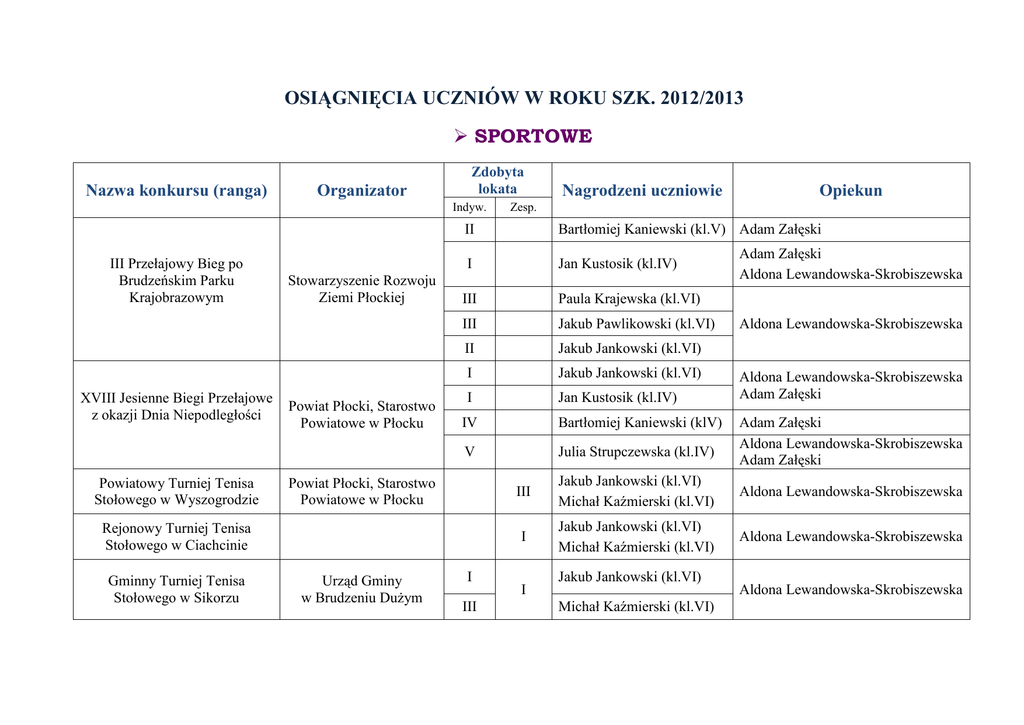 OSIĄGNIĘCIA UCZNIÓW W ROKU SZK. 2012/2013 SPORTOWE Nazwa konkursu (ranga) Organizator Zdobyta lokata Indyw. III Przełajowy Bieg po Brudzeńskim Parku Krajobrazowym XVIII Jesienne Biegi Przełajowe z okazji Dnia Niepodległości Powiatowy Turniej Tenisa Stołowego w Wyszogrodzie Stowarzyszenie Rozwoju Ziemi Płockiej Powiat Płocki, Starostwo Powiatowe w Płocku Bartłomiej Kaniewski (kl.V) Adam Załęski I Jan Kustosik (kl.IV) III Paula Krajewska (kl.VI) III Jakub Pawlikowski (kl.VI) II Jakub Jankowski (kl.VI) I Jakub Jankowski (kl.VI) I Jan Kustosik (kl.IV) IV Bartłomiej Kaniewski (klV) V Julia Strupczewska (kl.IV) Powiat Płocki, Starostwo Powiatowe w Płocku Urząd Gminy w Brudzeniu Dużym Opiekun II Rejonowy Turniej Tenisa Stołowego w Ciachcinie Gminny Turniej Tenisa Stołowego w Sikorzu Nagrodzeni uczniowie Zesp. I III Adam Załęski Aldona Lewandowska-Skrobiszewska Aldona Lewandowska-Skrobiszewska Aldona Lewandowska-Skrobiszewska Adam Załęski Adam Załęski Aldona Lewandowska-Skrobiszewska Adam Załęski III Jakub Jankowski (kl.VI) Michał Kaźmierski (kl.VI) Aldona Lewandowska-Skrobiszewska I Jakub Jankowski (kl.VI) Michał Kaźmierski (kl.VI) Aldona Lewandowska-Skrobiszewska I Jakub Jankowski (kl.VI) Michał Kaźmierski (kl.VI) Aldona Lewandowska-Skrobiszewska Rejonowy Turniej Halowej Piłki Nożnej Chłopców Gminny turniej halowej piłki nożnej chłopców Turniej Rejonowy - piłka siatkowa Stara Biała Turniej rejonowy - piłka siatkowa Drobin Płocka Międzyszkolna Liga Młodzików Badmintona - IV runda Płocka Międzyszkolna Liga Młodzików Badmintona - finał IV Urząd Gminy w Brudzeniu Dużym Urząd Gminy w Starej Białej I Ch.-IV Dz.-IV Chł.-III Dz.-IV Urząd Gminy w Drobinie Międzyszkolna Liga Młodzików Badmintona Dziewczęta i chłopcy V Dziewczęta i chłopcy V,VI Adam Załęski Adam Załęski Aldona Lewandowska-Skrobiszewska Adam Załęski Aldona Lewandowska-Skrobiszewska Adam Załęski Julia Strupczewska (kl.IVa) Adam Załęski chłopcy (kl. V,VI) Aldona Lewandowska-Skrobiszewska Adam Załęski IV I Rejonowy turniej piłki nożnej II Powiatowy turniej piłki nożnej II Mityng lekkoatletyczny - Chalin kl.VI kl.V kl.VI III Gminny turniej piłki nożnej Powiatowe Zawody w czwórboju lekkoatletycznym Turniej Piłki Nożnej o Puchar Wójta Gminy Brudzeń Duży kl.V Powiat Płocki, Starostwo Powiatowe w Płocku Urząd Gminy w Brudzeniu Dużym Ch.-IV Dziewczęta i chłopcy Dz.-V kl. IV,V,VI I I V III chłopcy kl. IV,V,VI Paula Krajewska Ch.-III Patrycja Żochowska Dz.-II Sebastian Skrzyński Aldona Lewandowska-Skrobiszewska Adam Załęski Adam Załęski Aldona Lewandowska-Skrobiszewska Adam Załęski OSIĄGNIĘCIA PRZYRODNICZE Nazwa konkursu (ranga) Organizator Zdobyta lokata Indyw. RCEE w Płocku, Fundusz Lokalny Ziemi Płockiej „Młodzi Razem” Wyr. "Ptaki lasu" - konkurs rejonowy LOP Zarząd Rejonowy LOP w Płocku III III III "Mój las" - etap regionalny XXVI edycji konkursu ogólnopolskiego Zarząd Rejonowy LOP w Płocku Lider Zdrowia Kampanii 2012 Urząd Gminy w Brudzeniu Dużym "Piękno Mazowsza Płockiego" Przyrodniczy konkurs edukacyjny "XXV lat Brudzeńskiego Parku Krajobrazowego" Mazowiecki Zespół Parków Krajobrazowych I Gminny Konkurs Ekologiczny pod hasłem "Gdy trawa płonie" Zespół Szkół w Siecieniu Konkurs Rejonowy LOP "Przyroda - Twój Przyjaciel" XXVI edycja Zarząd Rejonowy LOP w Płocku Zesp. Zuzanna Topolska (kl.IVa) Jakub Grabarczyk (kl.V) Natalia Wrześniewska (kl.VI) Paweł Gronkowski (kl.VI) III Laureat Wyr III III Wyr Wyr III I III Wyr Wyr III Wyr Wyr Wyr Nagrodzeni uczniowie Agata Tober (kl.VI) Aleksandra Balcerowska (kl.VI) Agata Tober (kl.VI) Aleksandra Balcerowska (kl.VI) Agata Szczypińska (kl.IIa) Miłosz Pietrkiewicz (kl.V) Aleksandra Kowalska (kl.V) Jakub Raszka (kl.V) Anna Bornińska (kl.I) Krystian Bentlewski (kl.V) Jakub Grabarczyk (kl.V) Mikołaj Cymerman (kl.VI) Szymon Trojanowski (kl.IVa) Damian Gronkowski (kl.V) Szymon Trojanowski (kl.IVa) Bartosz Wrona (kl.V) Paweł Gronkowski (kl.VI) Opiekun Anna Kostrzewa Anna Kostrzewa Anna Kostrzewa Anna Kostrzewa Anna Kostrzewa Jolanta Pawłowska Anna Kostrzewa Jolanta Piotrowska Anna Kostrzewa Anna Kostrzewa MUZYCZNE Nazwa konkursu (ranga) Organizator Zdobyta lokata Ind. Międzyszkolny Konkurs Kolęd i Pastorałek w Siecieniu XIV edycja Międzyszkolnego Konkursu Piosenki Dziecięcej „Piosenki z dawnych lat” w Sikorzu Zespół Szkół w Siecieniu Zespół Szkolno -Przedszkolny w Sikorzu Nagrodzeni uczniowie Opiekun Zesp. I Hubert Wyczałkowski (kl.I) I Marcjanna Rypińska (kl.VI) II Kinga Rutkowska (kl.VI) II Natalia Walkowiak (kl. IIa) Jolanta Pawłowska III Martyna Sokołowska (IIIa) Małgorzata Malec - Kalwasińska I Natalia Załęska (gr.6-latki) Marianna Sikorska Jolanta Piotrowska Aldona Lewandowska-Skrobiszewska Kacper Olewiński (gr.5-latki) I Gminny Festiwal Tańca „Rytmiczne przedszkolaki” Zespół Szkół w Siecieniu III I Just Sing- festiwal piosenki obcojęzycznej (konkurs międzyszkolny) Gimnazjum w Brudzeniu Dużym I Alicja Grad (gr.5-latki) Alicja Kowalska Adrian Szwech (gr.6-latki) Marianna Sikorska Grupa taneczna 9-osobowa (gr.3-4 latki) Iwona Ziółkowska Marcjanna Rypińska (kl.VI) Aldona Lewandowska-Skrobiszewska PLASTYCZNE Nazwa konkursu (ranga) Organizator Zdobyta lokata Ind. Gminny Konkurs Plastyczny "Przemoc nie rozwiązuje problemów" "Korale jesieni" (konkurs gminny) Gminna Biblioteka Publiczna w Brudzeniu Dużym Gminny konkurs plastyczny „Najpiękniejsza karta wielkanocna” Gminny konkurs plastyczny "Ilustracja do wybranego utworu Juliana Tuwima" Zespół Szkół w Siecieniu Szkoła Podstawowa w Myśliborzycach Zespół SzkolnoPrzedszkolny w Brudzeniu Dużym Opiekun II Mikołaj Cymerman (kl.VI) III Zuzanna Topolska (kl.IV) I II III I III II II I II III I I II II Monika Nawrot (kl.I) Justyna Jaglińska (kl.I) Bartosz Sikorski (kl.I) Ewa Sępiak (kl.IIa) Natalia Walkowiak (kl.IIa) Oliwia Żachowska (kl.IIb) Karolina Szmydt (kl.IIb) Łuc