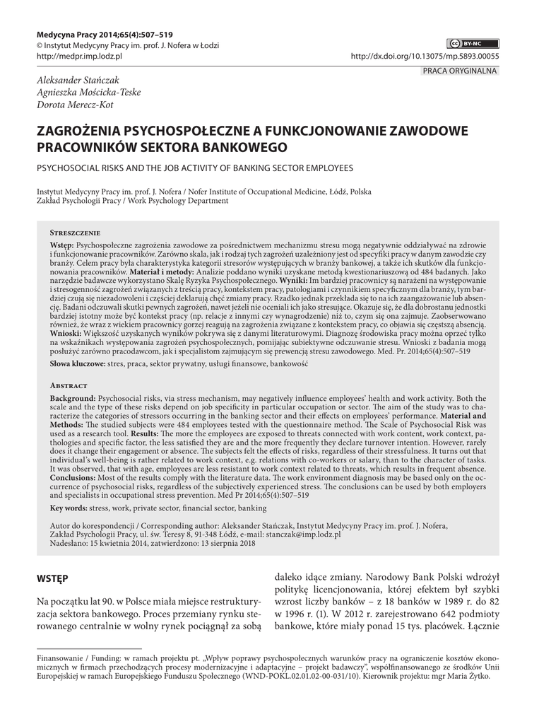 Medycyna Pracy 2014;65(4):507–519 © Instytut Medycyny Pracy im. prof. J. Nofera w Łodzi http://medpr.imp.lodz.pl http://dx.doi.org/10.13075/mp.5893.00055 PRACA ORYGINALNA Aleksander Stańczak Agnieszka Mościcka-Teske Dorota Merecz-Kot ZAGROŻENIA PSYCHOSPOŁECZNE A FUNKCJONOWANIE ZAWODOWE PRACOWNIKÓW SEKTORA BANKOWEGO PSYCHOSOCIAL RISKS AND THE JOB ACTIVITY OF BANKING SECTOR EMPLOYEES Instytut Medycyny Pracy im. prof. J. Nofera / Nofer Institute of Occupational Medicine, Łódź, Polska Zakład Psychologii Pracy / Work Psychology Department Streszczenie Wstęp: Psychospołeczne zagrożenia zawodowe za pośrednictwem mechanizmu stresu mogą negatywnie oddziaływać na zdrowie i funkcjonowanie pracowników. Zarówno skala, jak i rodzaj tych zagrożeń uzależniony jest od specyfiki pracy w danym zawodzie czy branży. Celem pracy była charakterystyka kategorii stresorów występujących w branży bankowej, a także ich skutków dla funkcjonowania pracowników. Materiał i metody: Analizie poddano wyniki uzyskane metodą kwestionariuszową od 484 badanych. Jako narzędzie badawcze wykorzystano Skalę Ryzyka Psychospołecznego. Wyniki: Im bardziej pracownicy są narażeni na występowanie i stresogenność zagrożeń związanych z treścią pracy, kontekstem pracy, patologiami i czynnikiem specyficznym dla branży, tym bardziej czują się niezadowoleni i częściej deklarują chęć zmiany pracy. Rzadko jednak przekłada się to na ich zaangażowanie lub absencję. Badani odczuwali skutki pewnych zagrożeń, nawet jeżeli nie oceniali ich jako stresujące. Okazuje się, że dla dobrostanu jednostki bardziej istotny może być kontekst pracy (np. relacje z innymi czy wynagrodzenie) niż to, czym się ona zajmuje. Zaobserwowano również, że wraz z wiekiem pracownicy gorzej reagują na zagrożenia związane z kontekstem pracy, co objawia się częstszą absencją. Wnioski: Większość uzyskanych wyników pokrywa się z danymi literaturowymi. Diagnozę środowiska pracy można oprzeć tylko na wskaźnikach występowania zagrożeń psychospołecznych, pomijając subiektywne odczuwanie stresu. Wnioski z badania mogą posłużyć zarówno pracodawcom, jak i specjalistom zajmującym się prewencją stresu zawodowego. Med. Pr. 2014;65(4):507–519 Słowa kluczowe: stres, praca, sektor prywatny, usługi finansowe, bankowość Abstract Background: Psychosocial risks, via stress mechanism, may negatively influence employees’ health and work activity. Both the scale and the type of these risks depend on job specificity in particular occupation or sector. The aim of the study was to characterize the categories of stressors occurring in the banking sector and their effects on employees’ performance. Material and Methods: The studied subjects were 484 employees tested with the questionnaire method. The Scale of Psychosocial Risk was used as a research tool. Results: The more the employees are exposed to threats connected with work content, work context, pathologies and specific factor, the less satisfied they are and the more frequently they declare turnover intention. However, rarely does it change their engagement or absence. The subjects felt the effects of risks, regardless of their stressfulness. It turns out that individual’s well-being is rather related to work context, e.g. relations with co-workers or salary, than to the character of tasks. It was observed, that with age, employees are less resistant to work context related to threats, which results in frequent absence. Conclusions: Most of the results comply with the literature data. The work environment diagnosis may be based only on the occurrence of psychosocial risks, regardless of the subjectively experienced stress. The conclusions can be used by both employers and specialists in occupational stress prevention. Med Pr 2014;65(4):507–519 Key words: stress, work, private sector, financial sector, banking Autor do korespondencji / Corresponding author: Aleksander Stańczak, Instytut Medycyny Pracy im. prof. J. Nofera, Zakład Psychologii Pracy, ul. św. Teresy 8, 91-348 Łódź, e-mail: [email protected] Nadesłano: 15 kwietnia 2014, zatwierdzono: 13 sierpnia 2018 WSTĘP Na początku lat 90. w Polsce miała miejsce restrukturyzacja sektora bankowego. Proces przemiany rynku sterowanego centralnie w wolny rynek pociągnął za sobą daleko idące zmiany. Narodowy Bank Polski wdrożył politykę licencjonowania, której efektem był szybki wzrost liczby banków – z 18 banków w 1989 r. do 82 w 1996 r. (1). W 2012 r. zarejestrowano 642 podmioty bankowe, które miały ponad 15 tys. placówek. Łącznie Finansowanie / Funding: w ramach projektu pt. „Wpływ poprawy psychospołecznych warunków pracy na ograniczenie kosztów ekonomicznych w firmach przechodzących procesy modernizacyjne i adaptacyjne – projekt badawczy”, współfinansowanego ze środków Unii Europejskiej w ramach Europejskiego Funduszu Społecznego (WND-POKL.02.01.02-00-031/10). Kierownik projektu: mgr Maria Żytko. 508 A. Stańczak i wsp. w sektorze bankowym zatrudniano ponad 175 tys. pracowników (2), co świadczy o tym, że zjawiska psychospołeczne omawiane w niniejszej pracy dotyczą znacznej grupy pracowniczej. Wzrost konkurencji, wysokie standardy dotyczące obsługi klienta, stały postęp technologiczny, a także tło wciąż odczuwanego kryzysu finansowego z 2008 r. sprawiają, że praca w sektorze bankowym może być szczególnie stresująca w porównaniu z wieloma innymi sektorami rynku pracy. Analiza polskiej literatury w zakresie czynników organizacyjnych wywołujących stres u pracowników nie jest bogata i najczęściej dotyczy grup zawodowych, które z racji charakteru wykonywanej pracy są szczególnie narażone na stres zawodowy. Mowa tu m.in. o straży pożarnej, ratownictwie medycznym, policji, nauczycielach, pielęgniarkach i pracownikach socjalnych. Brakuje wciąż badań analizujących specyfikę pracy w wielu innych potencjalnie stre