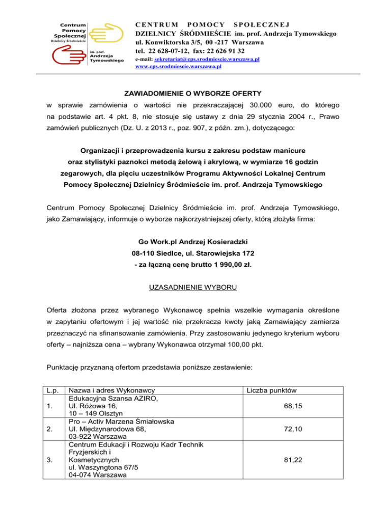CENTRUM POMOCY SPOŁECZNEJ DZIELNICY ŚRÓDMIEŚCIE im. prof. Andrzeja Tymowskiego ul. Konwiktorska 3/5, 00 -217 Warszawa tel. 22 628-07-12, fax: 22 626 91 32 e-mail: [email protected] www.cps.srodmiescie.warszawa.pl ZAWIADOMIENIE O WYBORZE OFERTY w sprawie zamówienia o wartości nie przekraczającej 30.000 euro, do którego na podstawie art. 4 pkt. 8, nie stosuje się ustawy z dnia 29 stycznia 2004 r., Prawo zamówień publicznych (Dz. U. z 2013 r., poz. 907, z późn. zm.), dotyczącego: Organizacji i przeprowadzenia kursu z zakresu podstaw manicure oraz stylistyki paznokci metodą żelową i akrylową, w wymiarze 16 godzin zegarowych, dla pięciu uczestników Programu Aktywności Lokalnej Centrum Pomocy Społecznej Dzielnicy Śródmieście im. prof. Andrzeja Tymowskiego Centrum Pomocy Społecznej Dzielnicy Śródmieście im. prof. Andrzeja Tymowskiego, jako Zamawiający, informuje o wyborze najkorzystniejszej oferty, którą złożyła firma: Go Work.pl Andrzej Kosieradzki 08-110 Siedlce, ul. Starowiejska 172 - za łączną cenę brutto 1 990,00 zł. UZASADNIENIE WYBORU Oferta złożona przez wybranego Wykonawcę spełnia wszelkie wymagania określone w zapytaniu ofertowym i jej wartość nie przekracza kwoty jaką Zamawiający zamierza przeznaczyć na sfinansowanie zamówienia. Przy zastosowaniu jedynego kryterium wyboru oferty – najniższa cena – wybrany Wykonawca otrzymał 100,00 pkt. Punktację przyznaną ofertom przedstawia poniższe zestawienie: L.p. 1. 2. 3. Nazwa i adres Wykonawcy Edukacyjna Szansa AZIRO, Ul. Różowa 16, 10 – 149 Olsztyn Pro – Activ Marzena Śmiałowska Ul. Międzynarodowa 68, 03-922 Warszawa Centrum Edukacji i Rozwoju Kadr Technik Fryzjerskich i Kosmetycznych ul. Waszyngtona 67/5 04-074 Warszawa Liczba punktów 68,15 72,10 81,22 4. 5. Go Work.pl Andrzej Kosieradzki ul. Starowiejska 172 08-110 Siedlce Zakład Doskonalenia Zawodowego w Warszawie ul. Podwale 13 00-252 Warszawa 100 79,60 Umowa z wybranym Wykonawcą podpisana zostanie w terminie i miejscu wskazanym przez Zamawiającego.