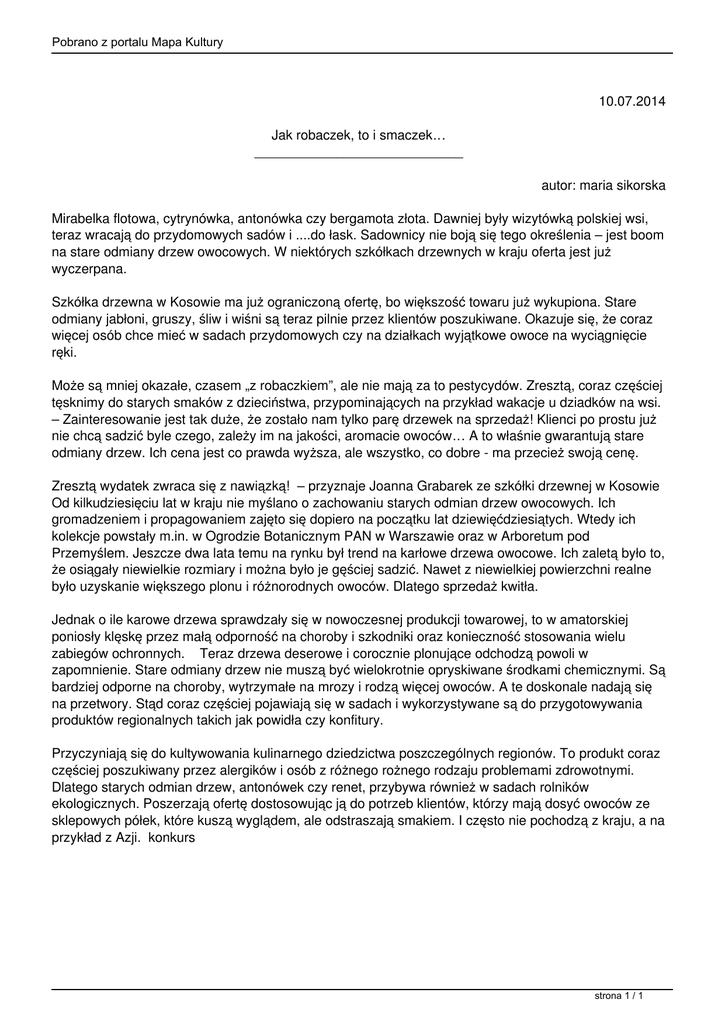 Pobrano z portalu Mapa Kultury 10.07.2014 Jak robaczek, to i smaczek… ____________________________ autor: maria sikorska Mirabelka flotowa, cytrynówka, antonówka czy bergamota złota. Dawniej były wizytówką polskiej wsi, teraz wracają do przydomowych sadów i ....do łask. Sadownicy nie boją się tego określenia – jest boom na stare odmiany drzew owocowych. W niektórych szkółkach drzewnych w kraju oferta jest już wyczerpana. Szkółka drzewna w Kosowie ma już ograniczoną ofertę, bo większość towaru już wykupiona. Stare odmiany jabłoni, gruszy, śliw i wiśni są teraz pilnie przez klientów poszukiwane. Okazuje się, że coraz więcej osób chce mieć w sadach przydomowych czy na działkach wyjątkowe owoce na wyciągnięcie ręki. Może są mniej okazałe, czasem „z robaczkiem”, ale nie mają za to pestycydów. Zresztą, coraz częściej tęsknimy do starych smaków z dzieciństwa, przypominających na przykład wakacje u dziadków na wsi. – Zainteresowanie jest tak duże, że zostało nam tylko parę drzewek na sprzedaż! Klienci po prostu już nie chcą sadzić byle czego, zależy im na jakości, aromacie owoców… A to właśnie gwarantują stare odmiany drzew. Ich cena jest co prawda wyższa, ale wszystko, co dobre - ma przecież swoją cenę. Zresztą wydatek zwraca się z nawiązką! – przyznaje Joanna Grabarek ze szkółki drzewnej w Kosowie Od kilkudziesięciu lat w kraju nie myślano o zachowaniu starych odmian drzew owocowych. Ich gromadzeniem i propagowaniem zajęto się dopiero na początku lat dziewięćdziesiątych. Wtedy ich kolekcje powstały m.in. w Ogrodzie Botanicznym PAN w Warszawie oraz w Arboretum pod Przemyślem. Jeszcze dwa lata temu na rynku był trend na karłowe drzewa owocowe. Ich zaletą było to, że osiągały niewielkie rozmiary i można było je gęściej sadzić. Nawet z niewielkiej powierzchni realne było uzyskanie większego plonu i różnorodnych owoców. Dlatego sprzedaż kwitła. Jednak o ile karowe drzewa sprawdzały się w nowoczesnej produkcji towarowej, to w amatorskiej poniosły klęskę przez małą odporność na choroby i szkodniki oraz konieczność stosowania wielu zabiegów ochronnych. Teraz drzewa deserowe i corocznie plonujące odchodzą powoli w zapomnienie. Stare odmiany drzew nie muszą być wielokrotnie opryskiwane środkami chemicznymi. Są bardziej odporne na choroby, wytrzymałe na mrozy i rodzą więcej owoców. A te doskonale nadają się na przetwory. Stąd coraz częściej pojawiają się w sadach i wykorzystywane są do przygotowywania produktów regionalnych takich jak powidła czy konfitury. Przyczyniają się do kultywowania kulinarnego dziedzictwa poszczególnych regionów. To produkt coraz częściej poszukiwany przez alergików i osób z różnego rożnego rodzaju problemami zdrowotnymi. Dlatego starych odmian drzew, antonówek czy renet, przybywa również w sadach rolników ekologicznych. Poszerzają ofertę dostosowując ją do potrzeb klientów, którzy mają dosyć owoców ze sklepowych półek, które kuszą wyglądem, ale odstraszają smakiem. I często nie pochodzą z kraju, a na przykład z Azji. konkurs strona 1 / 1