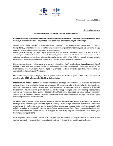 Warszawa, 24 września 2013 r. Informacja prasowa CARREFOUR KIDS: ZABAWA NAUKA, TECHNOLOGIA Carrefour Polska – właściciel i zarządca sieci centrów handlowych - stworzył specjalny projekt pod nazwą „CARREFOUR KIDS”. Jego celem jest promocja edukacji i nowych technologii. Współczesny „świat dziecka” to w dużej mierze „e-świat”. Coraz więcej dzieci korzysta na co dzień z komputerów, smartfonów oraz tabletów wyposażonych w programy edukacyjne. Dzięki temu mogą rozwijać swoje zdolności intelektualne oraz manualne. Nadal jednak dostęp to tego typu rozwiązań ma w Polsce niewiele dzieci. Carrefour Polska dostrzegając potencjał w nowoczesnych technologiach w zakresie edukacji oraz mając na uwadze sytuacje dzieci w mniejszych ośrodkach stworzył program „ Carrefour Kids” w ramach którego będzie realizować inicjatywy wspierające naukę oraz szeroko pojętą edukację społeczną. Pierwszym projektem realizowanym w ramach „Carrefour Kids” jest budowa Interaktywnych Stref Zabaw. Powstaną one na terenie dwóch wybranych centrów handlowych „Zielonego Wzgórza” w Białymstoku oraz w „Galerii Kalisz”. Będą to pierwsze i jedyne projekty tego typu realizowane w centrach handlowych poza Warszawą. Uroczyste inauguracje nastąpią w dniu 3 października 2013 roku o godz.: 10:00 w Kaliszu oraz 10 października 2013 roku o godz.: 10:00 w Białymstoku. Interaktywna Strefa Zabaw to multinowoczesna podłoga interaktywna z licznymi aplikacjami edukacyjnymi oraz stolik dotykowy, rozpoznający 32 punkty dotyku w jednej chwili. Uruchomienie aplikacji następuje w czasie rzeczywistym, pod wpływem ruchu przechodzących po niej osób. Dzięki kolorowym i nowoczesnym grom dzieci będą miały okazję rozwijać swoją wyobraźnię, koordynację wzrokowo-ruchową, a także pamięć bezpośrednią. Dodatkowo dowiedzą się wielu ciekawych rzeczy związanych ze światem zwierząt, poznają najważniejsze zasady współczesnej ekologii oraz zmierzą się w wielu sportowych konkurencjach. W skład Interaktywnej Strefy Zabaw wchodzi również innowacyjny stolik dotykowy, za pomocą którego dzieci przenoszą się w nowy wymiar zabawy i nauki. Dzięki ciekawym aplikacjom z efektami dźwiękowymi i poleceniami czytanymi przez lektora uczestnicy zabawy będą mogli poćwiczyć swój refleks, rozwijać kreatywność, ćwiczyć pamięć oraz naukę pisania liter. Tego typu zadania cieszą się dużym powodzeniem wśród dzieci, ze względu na ich duży stopień intuicyjności oraz niezwykle barwną oprawę graficzną. Interaktywna Strefa Zabaw, to nie tylko rozrywka przeznaczona dla najmłodszych, to także nowy wymiar edukacji i rozwiązanie wyznaczające trendy na rynku centrów handlowych w Polsce. Do tej pory na terenie centrów handlowych Carrefour miało miejsce szereg wydarzeń promujących naukę. Ogromną popularnością cieszyła się Letnia Akademia Bystrzaków, w ramach której odbywały się zajęcia z fizyki, chemii, a także ćwiczenia stymulujące pamięć i koncentrację. Dzieci pokochały również wystawy interaktywne, takie jak „Podwodna przygoda” czy „Dzieciaki na Księżycu” Dodatkowe informacje: Dorota Jolanta Wojciechowska, Biuro Prasowe Carrefour e-mail: [email protected] Maria Cieślikowska, Dyrektor Komunikacji Zewnętrznej i PR, Rzecznik Prasowy e-mail: [email protected]