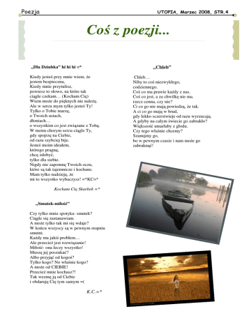 Poezja UTOPIA, Marzec 2008, STR.4 Coś z poezji... ,,Dla Dziubka” hi hi hi =* „Chleb” Kiedy jesteś przy mnie wiem, że jestem bezpieczna, Kiedy mnie przytulisz, powiesz to słowo, na które tak ciągle czekam… (Kocham Cię) Wiem może do pięknych nie należę. Ale w sercu mym tylko jesteś Ty! Tylko o Tobie marzę, o Twoich ustach, dłoniach… o wszystkim co jest związane z Tobą. W moim chorym sercu ciągle Ty, gdy spojrzę na Ciebie, od razu szybciej bije. Jesteś moim ideałem, którego pragnę, chcę zdobyć, tylko dla siebie. Nigdy nie zapomnę Twoich oczu, które są tak tajemnicze i kochane. Mam tylko nadzieję, że mi to wszystko wybaczysz! =*KC=* Kocham Cię Skarbek =* „Smutek-miłość” Czy tylko mnie spotyka- smutek? Ciągle się zastanawiam. A może tylko tak mi się wdaje? W końcu wszyscy są w pewnym stopniu smutni. Każdy ma jakiś problem… Ale przecież jest rozwiązanie! Miłość- ona leczy wszystko! Muszę jej poszukać? Albo przyjąć od kogoś? Tylko kogo? No właśnie kogo? A może od CIEBIE! Przecież mnie kochasz?! Tak wezmę ją od Ciebie i obdaruję Cię tym samym =( K.C.=* Chleb… Niby to coś niezwykłego, codziennego. Coś co ma prawie każdy z nas. Coś co jest, a za chwilkę nie ma. rzecz cenna, czy nie? Ci co go nie mają powiedzą, że tak. A ci co go mają w brud, gdy lekko sczerstwieje od razu wyrzucają. A gdyby na całym świecie go zabrakło? Większość umarłaby z głodu. Czy tego właśnie chcemy? Szanujmy go, bo w pewnym czasie i nam może go zabraknąć!