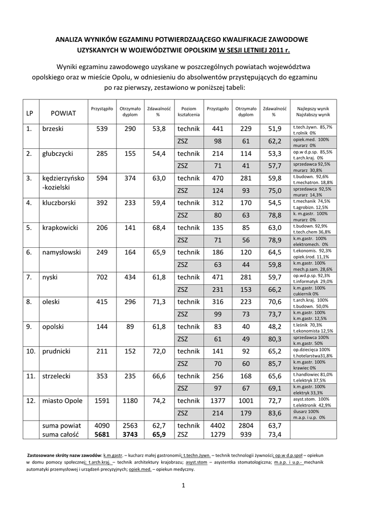 ANALIZA WYNIKÓW EGZAMINU POTWIERDZAJĄCEGO KWALIFIKACJE ZAWODOWE UZYSKANYCH W WOJEWÓDZTWIE OPOLSKIM W SESJI LETNIEJ 2011 r. Wyniki egzaminu zawodowego uzyskane w poszczególnych powiatach województwa opolskiego oraz w mieście Opolu, w odniesieniu do absolwentów przystępujących do egzaminu po raz pierwszy, zestawiono w poniższej tabeli: LP 1. 2. 3. 4. 5. 6. 7. 8. 9. POWIAT brzeski głubczycki Przystąpiło Otrzymało dyplom Zdawalność % Poziom kształcenia Przystąpiło Otrzymało dyplom Zdawalność % Najlepszy wynik Najsłabszy wynik 539 290 53,8 technik 441 229 51,9 ZSZ 98 61 62,2 technik 214 114 53,3 ZSZ 71 41 57,7 technik 470 281 59,8 ZSZ 124 93 75,0 technik 312 170 54,5 ZSZ 80 63 78,8 technik 135 85 63,0 ZSZ 71 56 78,9 technik 186 120 64,5 ZSZ 63 44 59,8 technik 471 281 59,7 ZSZ 231 153 66,2 technik 316 223 70,6 ZSZ 99 73 73,7 technik 83 40 48,2 ZSZ 61 49 80,3 technik 141 92 65,2 ZSZ 70 60 85,7 technik 256 168 65,6 ZSZ 97 67 69,1 technik 1377 1001 72,7 ZSZ 214 179 83,6 t.tech.żywn. 85,7% t.rolnik 0% opiek.med. 100% murarz 0% op.w d.p.sp. 85,5% t.arch.kraj. 0% sprzedawca 92,5% murarz 30,8% t.budown. 92,6% t.mechatron. 18,8% sprzedawca 92,5% murarz 14,3% t.mechanik 74,5% t.agrobizn. 12,5% k. m.gastr. 100% murarz 0% t.budown. 92,9% t.tech.chem 36,8% k.m.gastr. 100% elektromech. 0% t.ekonomis. 92,3% opiek.środ. 11,1% k.m.gastr. 100% mech.p.sam. 28,6% op.wd.p.sp. 92,3% t.informatyk 29,0% k.m.gastr. 100% cukiernik 0% t.arch.kraj. 100% t.budown. 50,0% k.m.gastr. 100% k.m.gastr. 12,5% t.leśnik 70,3% t.ekonomista 12,5% sprzedawca 100% k.m.gastr. 50% op.dziecięca 100% t.hotelarstwa31,8% k.m.gastr. 100% krawiec 0% t.handlowiec 81,0% t.elektryk 37,5% k.m.gastr. 100% elektryk 33,3% asyst.stom. 100% t.elektronik 42,9% ślusarz 100% m.a.p. i u.p. 0% technik ZSZ 4402 1279 2804 939 63,7 73,4 285 kędzierzyńsko -kozielski 594 kluczborski 392 krapkowicki namysłowski nyski oleski opolski 10. prudnicki 11. strzelecki 12. miasto Opole suma powiat suma całość 206 249 702 415 144 211 353 1591 4090 5681 155 374 233 141 164 434 296 89 152 235 1180 2563 3743 54,4 63,0 59,4 68,4 65,9 61,8 71,3 61,8 72,0 66,6 74,2 62,7 65,9 Zastosowane skróty nazw zawodów: k.m.gastr. – kucharz małej gastronomii; t.techn.żywn. – technik technologii żywności; op.w d.p.społ – opiekun w domu pomocy społecznej; t.arch.kraj. – technik architektury krajobrazu; asyst.stom – asystentka stomatologiczna; m.a.p. i u.p.- mechanik automatyki przemysłowej i urządzeń precyzyjnych; opiek.med. – opiekun medyczny. 1 W sesji letniej 2011 r. do egzaminu potwierdzającego kwalifikacje zawodowe, przystąpiło po raz pierwszy łącznie 5681 absolwentów szkół zawodowych różnego szczebla, z tego dyplom otrzymało 3743, co stanowi 65,9% ogółu zdających. Tegoroczni absolwenci zdawali egzamin w 30 zawodach tzw. robotniczych uzyskując zdawalność na poziomie 73,4% i w 46 zawodach na poziomie technikum i szkoły policealnej – tu średnia zdawalność wyniosła 63,7%. Najlepszy wynik osiągnięty został w zawodach: zsz – monter mechatronik, pracownik pomocniczy obsługi hotelowej, opiekun medyczny technikum i szkoły policealne – higienistka stomatologiczna, technik pojazdów samochodowych Najsłabszy wynik uzyskano w zawodach: zsz – mechanik automatyki przemysłowej i urządzeń precyzyjnych, ogrodnik technikum – terapeuta zajęciowy, opiekunka środowiskowa Najwięcej zdających zanotowano w zawodach: na poziomie zasadniczej szkoły zawodowej sprzedawca: 452 absolwentów – zdawalność 87,6% kucharz małej gastronomii: 224 absolwentów – zdawalność 69,2% ślusarz: 156 absolwentów – zdawalność 66,7% mechanik pojazdów samochodowych: 99 absolwentów – zdawalność 50,5% na poziomie technikum i szkoły policealnej technik informatyk: 491 absolwentów – zdawalność 60,9% technik ekonomista: 464 absolwentów – zdawalność 71,8% technik mechanik: 328 absolwentów – zdawalność 64,0% technik budownictwa: 297 absolwentów – zdawalność 69,7% Najwięcej osób przystąpiło do egzaminu zawodowego w mieście Opolu – 1591 tj. 28,0% ogółu zdających, oraz w powiatach: nyskim – 702 tj. 12,4% kędzierzyńsko-kozielskim – 594 tj. 10,4% brzeskim – 539 tj. 9,5% 2 Najmniejszą liczbę osób przystępujących do egzaminu zanotowano w powiatach: opolskim – 144 tj. 2,5% krapkowickim – 206 tj. 3,6% prudnickim – 211 tj. 3,7% ogółu zdających. Najwyższą zdawalność osiągnięto w mieście Opolu – 74,2% oraz w powiatach: prudnickim – 72,0% i oleskim 71,3%. Najsłabiej wypadły powiaty: brzeski – gdzie 53,8% absolwentów zdało egzamin, głubczycki – gdzie 54,4% absolwentów zdało egzamin, kluczborski – gdzie 59,4% absolwentów zdało egzamin zawodowy. Jeśli wziąć pod uwagę zdawalność egzaminu potwierdzającego kwalifikacje zawodowe z podziałem na poziom kształcenia, to wyniki wskazują, iż na poziomie techników i szkół policealnych najlepszą zdawalność osiągnęło miasto Opole 72,7%, oraz powiaty oleski 70,6% i strzelecki 65,6% zaś na poziomie zasadniczej szkoły zawodowej powiaty: prudnicki 85,7%, miasto Opole 83,6% i powiat opolski 80,3%, Najsłabszą zdawalność uzyskano: na poziomie technikum i szkoły policealnej – w powiecie opolskim 48,2% na poziomie zasadniczej szkoły zawodowej – w powiecie namysłowskim 59,8%. W sesji letniej 2011 r. egzamin potwierdzający kwalifikacje zawodowe odbył się w 93 szkołach i placówkach publicznych, niepublicznych i zespołach szkół specjalnych województwa opolskiego. W załączniku do opracowania, w tabeli 1 i 2, podano, w procentach, zdawalność egzaminu w poszczególnych zawodach w odniesieniu do powiatów. Z zestawienia widać, że we wszystkich powiatach kształci się w zawodzie kucharz małej gastronomii i sprzedawca oraz w zawodzie technik ekonomista. Tylko w jednym powiecie prowadzono kształcenie w zawodach: krawiec, mechanik automatyki przemysłowej i urządzeń precyzyjnych, blacharz s
