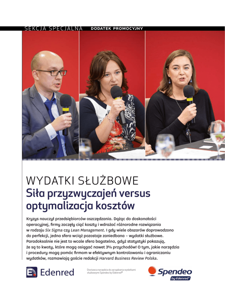 S e kc j a s p e c j a l n a dodatek promocyjny Wydatki służbowe Siła przyzwyczajeń versus optymalizacja kosztów Kryzys nauczył przedsiębiorców oszczędzania. Dążąc do doskonałości operacyjnej, firmy zaczęły ciąć koszty i wdrażać różnorodne rozwiązania w rodzaju Six Sigma czy Lean Management. I gdy wiele obszarów doprowadzono do perfekcji, jedna sfera wciąż pozostaje zaniedbana – wydatki służbowe. Paradoksalnie nie jest to wcale sfera bagatelna, gdyż statystyki pokazują, że są to kwoty, które mogą osiągać nawet 3% przychodów! O tym, jakie narzędzia i procedury mogą pomóc firmom w efektywnym kontrolowaniu i ograniczaniu wydatków, rozmawiają goście redakcji Harvard Business Review Polska. Dostawca narzędzia do zarządzania wydatkami służbowymi Spendeo by Edenred® Dodatek promocyjny Zdjęcie: marek jaśkiewicz W debacie uczestniczyli: Agnieszka Dolka-Bryndal, dyrektor linii biznesowej Edenred Polska, Maciej Grela, doradca podatkowy w Kancelarii Gide Loyrette Nouel, Aneta Jarczyńska, product marketing manager w firmie Sage, Tomasz Łuczak, business leader, Commercial Product, CEE w MasterCard, oraz Piotr Rówiński, dyrektor w PwC. Debatę moderował Paweł Kubisiak, zastępca redaktora naczelnego Harvard Business Review Polska. W ydatki służbowe i sposoby ich rozliczeń to w większości firm nadal skomplikowany, czasochłonny oraz rodzący niepotrzebne koszty proces. Jak zauważył moderator debaty, Paweł Kubisiak, to sfera wciąż „niezagospodarowana”, dająca szansę usprawnień w kilku obszarach. W pełni potwierdziła to Agnieszka Dolka-Bryndal, powołując się na wyniki zleconego przez Edenred badania. Pokazują one, iż w wielu rodzimych organizacjach elementy zarządzania wydatkami służbowymi, takimi jak sposoby płatności, negocjacje z dostawcami czy wsparcie systemu informatycznego, są nierzadko anachroniczne, a przynajmniej w istotny sposób odbiegają od współcześnie stosowanych światowych standardów. Badanie przeprowadzone przez Nielsen Polska • Wydatki służbowe… dowodzi, iż zdecydowana większość ankietowanych firm – 80% – wciąż stosuje zaliczki na wyjazdy służbowe; albo w formie gotówki wypłacanej z kasy, albo poprzez przelew na osobiste konto pracownika. Aż 75% badanych firm przyznaje, że ich pracownicy angażują prywatne środki, aby realizować służbowe zadania, oczekując później na ich zwrot. Połowa organizacji deklaruje, że obowiązują w nich spisane polityka i regulaminy dotyczące wydatków służbowych i sposobów ich rozliczania, natomiast druga połowa przyznaje, że u nich dzieje się to wciąż na niesformalizowanych zasadach. Charakterystyczne jest to, dodała dyrektor Edenred Polska, że „około 80% firm dokonuje rozliczeń wydatków za pomocą papierowych formularzy. Nawet jeżeli Excel jest traktowany jako narzędzie informatyczne, to nadal elektroniczny S 2 ▶ Wydatki służbowe… • Dodatek promocyjny formularz jest drukowany i przekazywany do akceptacji i rozliczenia”. To procesy, które na pewno można usprawnić – przekonywała Agnieszka Dolka-Bryndal. Myślowe schematy i przyzwyczajenia Skąd biorą się bariery utrudniające usprawnienia w obszarze wydatków służbowych? Odpowiedzi na to pytanie szukała, odwołując się do własnych doświadczeń, Aneta Jarczyńska z firmy Sage. Gdy uruchamiała serwis MiędzyFirmami.pl, służący do przesyłania elektronicznych dokumentów, była przekonana, iż po starcie systemu „małe i średnie przedsiębiorstwa zaczną masowo korzystać z faktur elektronicznych. Tak się nie stało, mimo że firma Sage oferowała serwis, dzięki któremu można taką fakturę wysłać kontrahentowi, który nie ponosząc dodatkowych kosztów, może ją poprzez portal odebrać”. Aby dociec, dlaczego firmy nie korzystają z faktur elektronicznych, przeprowadzono badanie. Okazało się, iż firmy najczęściej odpowiadały, że „nikt nas o to nie prosi”. A w drugiej kolejności wskazywały na przyzwyczajenie do papieru. „Mimo że mamy XXI wiek i większość rzeczy robimy elektronicznie, to pani księgowa musi mieć fakturę papierową; i nawet jeżeli otrzyma zgodną z prawem elektroniczną, to i tak sobie ją wydrukuje. To po prostu ludzka mentalność i przyzwyczajenie są głównymi barierami utrudniającymi zmiany. A zmiany mentalności są, jak wiadomo, Głównymi barierami, które utrudniają wprowadzenie faktur elektronicznych, są ludzka mentalność i przyzwyczajenie. A zmiany mentalności są, jak wiadomo, najtrudniejsze. najtrudniejsze” – konkludowała Aneta Jarczyńska. Przypadek firmy, w której mimo wdrożenia systemu zautomatyzowanego fakturowania papier nadal „jest święty”, barwnie i anegdotycznie opisał Maciej Grela. Jak stwierdził: „Rozliczanie delegacji ręcznie, na papierze i wydawanie zaliczek oznacza nie tylko konieczność utrzymywania kasy, by rozliczać podróże służbowe, ale nierzadko zatrudnienia całych działów w księgowości, jeżeli firma obsługuje dużą liczbę podróży służbowych. Podobnie jest z raportowaniem i nadzorowaniem tych wydatków przez sferę zarządczą”. Stereotypowe, wynikające z ludzkich przyzwyczajeń podejście do sfery wydatków służbowych w firmach jest widoczne także w innych obszarach – mówiła Agnieszka Dolka-Bryndal, precyzując – w naszym kraju oprócz kultu papieru pokutuje jeszcze obawa przed kartami. „W Polsce biznesowe karty płatnicze są wciąż postrzegane jako produkt prestiżowy, elitarny i dlatego dysponują nimi głównie członkowie zarządu albo wyższa kadra menedżerska. Staramy się więc uświadamiać naszym klientom, że to jest narzędzie płatnicze i może być użyte przez każdego pracownika Dodatek promocyjny uprawnionego do ponoszenia wydatków służbowych. Karta jest integralną częścią systemu zarządzania wydatkami firmowymi, który daje pracodawcy dużą swobodę przy zachowaniu wszystkich wym