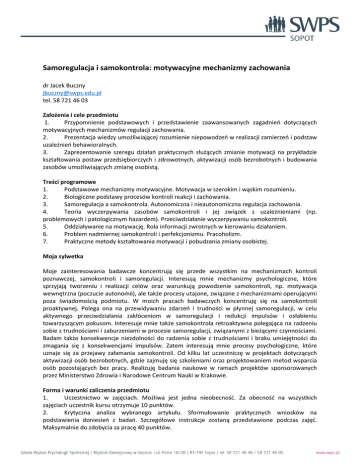 Samoregulacja i samokontrola: motywacyjne mechanizmy zachowania dr Jacek Buczny [email protected] tel. 58 721 46 03 Założenia i cele przedmiotu 1. Przypomnienie podstawowych i przedstawienie zaawansowanych zagadnień dotyczących motywacyjnych mechanizmów regulacji zachowania. 2. Prezentacja wiedzy umożliwiającej rozumienie niepowodzeń w realizacji zamierzeń i podstaw uzależnień behawioralnych. 3. Zaprezentowanie szeregu działań praktycznych służących zmianie motywacji na przykładzie kształtowania postaw przedsiębiorczych i zdrowotnych, aktywizacji osób bezrobotnych i budowania zasobów umożliwiających zmianę osobistą. Treści programowe 1. Podstawowe mechanizmy motywacyjne. Motywacja w szerokim i wąskim rozumieniu. 2. Biologiczne podstawy procesów kontroli reakcji i zachowania. 3. Samoregulacja a samokontrola. Autonomiczna i nieautonomiczna regulacja zachowania. 4. Teoria wyczerpywania zasobów samokontroli i jej związek z uzależnieniami (np. problemowych i patologicznym hazardem). Przeciwdziałanie wyczerpywaniu samokontroli. 5. Oddziaływanie na motywację. Rola informacji zwrotnych w kierowaniu działaniem. 6. Problem nadmiernej samokontroli i perfekcjonizmu. Pracoholizm. 7. Praktyczne metody kształtowania motywacji i pobudzania zmiany osobistej. Moja sylwetka Moje zainteresowania badawcze koncentrują się przede wszystkim na mechanizmach kontroli poznawczej, samokontroli i samoregulacji. Interesują mnie mechanizmy psychologiczne, które sprzyjają tworzeniu i realizacji celów oraz warunkują powodzenie samokontroli, np. motywacja wewnętrzna (poczucie autonomii), ale także procesy utajone, związane z mechanizmami operującymi poza świadomością podmiotu. W moich pracach badawczych koncentruję się na samokontroli proaktywnej. Polega ona na przewidywaniu zdarzeń i trudności w płynnej samoregulacji, w celu aktywnego przeciwdziałania zakłóceniom w samoregulacji i redukcji impulsów i osłabieniu towarzyszącym pokusom. Interesuje mnie także samokontrola retroaktywna polegająca na radzeniu sobie z trudnościami i zaburzeniami w procesie samoregulacji, związanymi z bieżącymi czynnościami. Badam także konsekwencje niezdolności do radzenia sobie z trudnościami i braku umiejętności do zmagania się z konsekwencjami impulsów. Zatem interesują mnie procesy psychologiczne, które uznaje się za przejawy załamania samokontroli. Od kilku lat uczestniczę w projektach dotyczących aktywizacji osób bezrobotnych, gdzie zajmuję się szkoleniami oraz projektowaniem metod wsparcia osób pozostających bez pracy. Realizuję badania naukowe w ramach projektów sponsorowanych przez Ministerstwo Zdrowia i Narodowe Centrum Nauki w Krakowie. Forma i warunki zaliczenia przedmiotu 1. Uczestnictwo w zajęciach. Możliwa jest jedna nieobecność. Za obecność na wszystkich zajęciach uczestnik kursu otrzymuje 10 punktów. 2. Krytyczna analiza wybranego artykułu. Sformułowanie praktycznych wniosków na podstawienia doniesień z badań. Szczegółowe instrukcje zostaną przedstawione podczas zajęć. Maksymalnie do zdobycia za pracę 40 punktów. Progi dla ocen końcowych (1) 0 – 19 punktów: niedostateczny; (2) 20 – 24: dostateczny; (3) 25 – 28: dostateczny plus; (4) 29 – 33: dobry; (5) 33 – 36: dobry plus; (6) 37 i więcej: bardzo dobry. Literatura podstawowa 1. Baumeister, R. F., Heatherton, T. F. i Tice, D. M. (2000). Utrata kontroli. Jak i dlaczego tracimy zdolność do samokontroli. Warszwa: Państwowa Agencja Rozwiązywania Problemów Alkoholowych. 2. Buczny, J. i Łukaszewski, W. (2008). Regulacja działania wytrwałego. Czasopismo Psychologiczne, 14, 131–143. 3. Kadzikowska-Wrzosek, R. (2013). Siła woli. Autonomia, samoregulacja i kontrola działania. Sopot: Smak Słowa. 4. Wojdyło, K. i Buczny, J. (2011). Samoregulacja i samokontrola powinnościowe: Analiza psychometryczna Skali Rozbieżności Ja (SkRAP). Psychologia Społeczna, 6, 375–390. Literatura uzupełniająca 1. Aronson, E. i Wieczorkowska, G. (2001). Kontrola naszych myśli i uczuć. Warszawa: Jacek Santorski & Co Wydawnictwo. 2. Inzlicht, M. i Schmeichel, B. J. (2012). What is ego depletion? Toward a mechanistic revision of the resource model of self-control. Perspectives on Psychological Science, 7, 450–463. 3. Job, V., Walton, G. M., Bernecker, K i Dweck, C. S. (2013). Beliefs about willpower determine the impact of glucose on self-control. Proceedings of the National Academy of Sciences. doi:10.1073/pnas.1313475110 4. Łukaszewski, W. (2002). Zwrotne informacje o wyniku czynnoąci. W: I. Kurcz i D. Kądzielawa (red.), Psychologia czynności. Nowe perspektywy (s. 84-99). Warszawa: Wydawnictwo Naukowe Scholar. 5. Muraven, M. (2008). Autonomous self-control is less depleting. Journal of Research in Personality, 42, 763–770. 6. Muraven, M. (2010). Building self-control strength: Practicing self-control leads to improved self-control performance. Journal of Experimental Social Psychology, 46, 465–468. 7. Niedźwieńska, A. (2008) (red.). Samoregulacja w poznaniu i działaniu. Kraków: Wydawnictwo Uniwersytetu Jagiellońskiego. 8. Tice, D., Baumeister, R., Shmueli, D., Muraven, M. (2007). Restoring the self: Positive affect helps improve self-regulation following ego depletion. Journal of Experimental Social Psychology, 43, 379–384. 9. Wojdylo, K., Baumann, N., Buczny, J., Owens, G., Kuhl, J. (2013). Work craving: A conceptualization and measurement. Basic and Applied Social Psychology, 35, 547–568. Wykorzystywane metody dydaktyczne 1. 2. 3. 4. Prezentacje multimedialne. Dyskusja w grupie. Techniki studiowania: analiza literatury i przygotowanie analizy krytycznej. Planowanie i tworzenie tekstów.