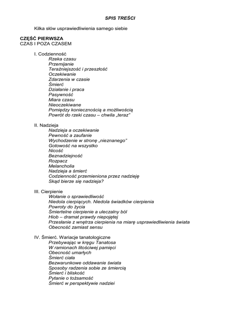 SPIS TREŚCI Kilka słów usprawiedliwienia samego siebie CZĘŚĆ PIERWSZA CZAS I POZA CZASEM I. Codzienność Rzeka czasu Przemijanie Teraźniejszość i przeszłość Oczekiwanie Zdarzenia w czasie Śmierć Działanie i praca Pasywność Miara czasu Nieoczekiwane Pomiędzy koniecznością a możliwością Powrót do rzeki czasu – chwila „teraz” II. Nadzieja Nadzieja a oczekiwanie Pewność a zaufanie Wychodzenie w stronę „nieznanego” Gotowość na wszystko Nicość Beznadziejność Rozpacz Melancholia Nadzieja a śmierć Codzienność przemieniona przez nadzieję Skąd bierze się nadzieja? III. Cierpienie Wołanie o sprawiedliwość Niedola cierpiących. Niedola świadków cierpienia Powroty do życia Śmiertelne cierpienie a uleczalny ból Hiob – dramat prawdy niepojętej Przesłanie z wnętrza cierpienia na miarę usprawiedliwienia świata Obecność zamiast sensu IV. Śmierć. Wariacje tanatologiczne Przebywając w kręgu Tanatosa W ramionach litościwej pamięci Obecność umarłych Śmierć ciała Bezwarunkowe oddawanie świata Sposoby radzenia sobie ze śmiercią Śmierć i bliskość Pytanie o tożsamość Śmierć w perspektywie nadziei CZĘŚĆ DRUGA OBECNOŚĆ. PRÓBA MYŚLENIA Pierwsze spojrzenie Przebudzenie we wnętrzu gramatyki Imię Moja obecność i sens posiadania siebie Uobecnienie – przywołanie „jestem” jako podstawa tożsamości Słowo – miejsce – ślad Obecnością jesteśmy CZĘŚĆ TRZECIA SPOŁECZNY WYMIAR OBECNOŚCI I. Świat relacji z innymi Podmiot w przestrzeni „między” Nietykalność Odpowiedzialność Wewnętrzność II. Dom. Bliskość i bezpośredniość Przestrzeń obcowania Mojość Gościnność Matka jako archetyp otwartego świata Poświęcenie własnego ja Bliskość i bezpośredniość Dom w perspektywie upływającego czasu Upadek domu Bezdomność i samotność O pewnej interpretacji ewangelicznej przypowieści III. Obecność dziecka Bezpośredniość Narodziny dziecka Wychowanie i nauczanie Obecność, która się wydarza IV. Pragnienie i miłość O miłości, która nie jest aktem intencjonalnym Miłość jako wydarzenie obecności Kochanie, przyjaźń, miłość Pragnienie miłości CZĘŚĆ CZWARTA KRAJOBRAZY NIEOBECNOŚCI I. Nieobecność II. Nienawiść Zaufanie i zdrada Gniew Wojna jako sposób wyjścia Taktyka i estetyka Nienawiść siebie Nienawiść zbiorowa III. Wojna Namysł wstępny. Wojna w sensie politycznym i wojna metafizyczna Czas pokoju, czas wojny Zabójstwo i samobójstwo Prowizoryczna próba rozumienia Przetrwanie, które nie jest stawką Cień globalnego terroru Wojna jako nieobecność IV. Kilka uwag w sprawie doświadczenia zła Metafizyczny sens przetrwania Pytania o zło absolutne Zło w strukturze ludzkiej śmiertelności Nieludzki rodowód zła Zło w krajobrazie nieobecności Myślenie w uścisku tragicznego doświadczenia