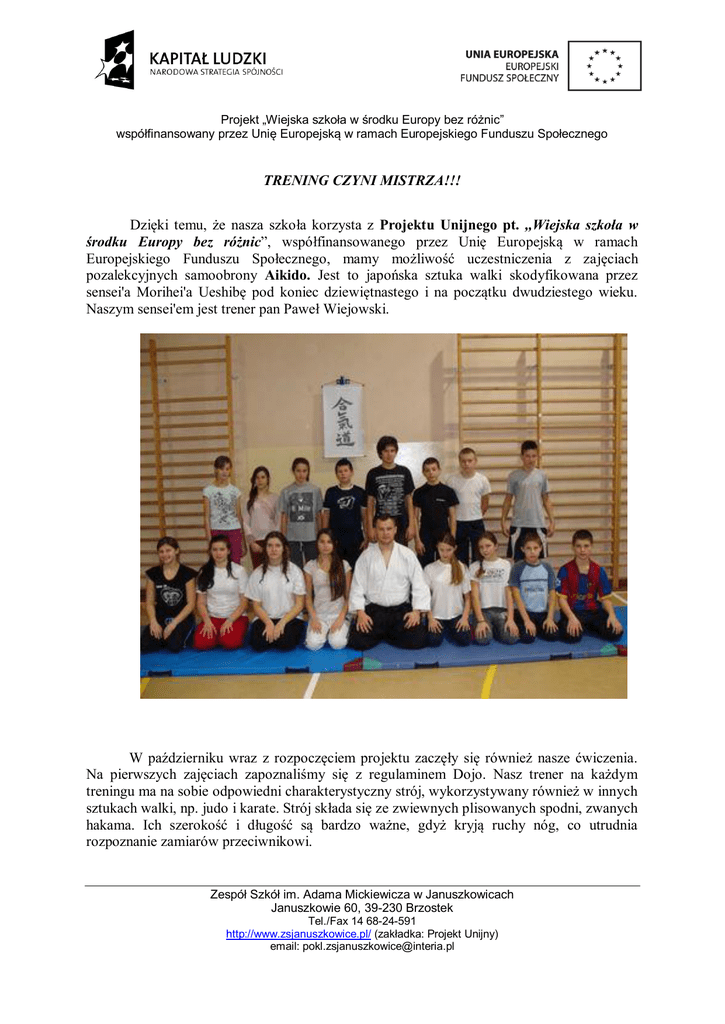 Projekt „Wiejska szkoła w środku Europy bez różnic” współfinansowany przez Unię Europejską w ramach Europejskiego Funduszu Społecznego TRENING CZYNI MISTRZA!!! Dzięki temu, że nasza szkoła korzysta z Projektu Unijnego pt. ,,Wiejska szkoła w środku Europy bez różnic”, współfinansowanego przez Unię Europejską w ramach Europejskiego Funduszu Społecznego, mamy możliwość uczestniczenia z zajęciach pozalekcyjnych samoobrony Aikido. Jest to japońska sztuka walki skodyfikowana przez sensei'a Morihei'a Ueshibę pod koniec dziewiętnastego i na początku dwudziestego wieku. Naszym sensei'em jest trener pan Paweł Wiejowski. W październiku wraz z rozpoczęciem projektu zaczęły się również nasze ćwiczenia. Na pierwszych zajęciach zapoznaliśmy się z regulaminem Dojo. Nasz trener na każdym treningu ma na sobie odpowiedni charakterystyczny strój, wykorzystywany również w innych sztukach walki, np. judo i karate. Strój składa się ze zwiewnych plisowanych spodni, zwanych hakama. Ich szerokość i długość są bardzo ważne, gdyż kryją ruchy nóg, co utrudnia rozpoznanie zamiarów przeciwnikowi. Zespół Szkół im. Adama Mickiewicza w Januszkowicach Januszkowie 60, 39-230 Brzostek Tel./Fax 14 68-24-591 http://www.zsjanuszkowice.pl/ (zakładka: Projekt Unijny) email: [email protected] Projekt „Wiejska szkoła w środku Europy bez różnic” współfinansowany przez Unię Europejską w ramach Europejskiego Funduszu Społecznego Podczas kilku spotkań, w których uczestniczyliśmy z wielką ochotą i ciekawością, dowiedzieliśmy się m.in., że Aikido nie służy do ataku i walki, ale głównie do samoobrony. Aikido uczy też opanowania, dystansu do samego siebie i wyzwala od gniewu. Nasze treningi polegają przede wszystkim na dokładnym kopiowaniu techniki, jaką pokazuje nam trener. Do tej pory nauczyliśmy się podstawowych ruchów, choć nadal sprawiają nam one trudności. Są oczywiście wyjątki. Dla osób, które nigdy nie były na takim treningu, może wydać się to dziwne, a nawet śmieszne, że na dzień dzisiejszy największe trudności sprawia nam "przewracanie się". Jest to jedna z podstaw, do których należy również odpowiednie poruszanie się. Musimy również umieć kilka słówek po japońsku, gdyż są one niezbędne do porozumiewania się podczas treningu. Ale, jak to mówią, trening czyni mistrza, więc mamy nadzieję, że wkrótce wszyscy doskonale opanujemy zasady samoobrony Aikido i uzyskamy tytuły mistrzów! Jesteśmy bardzo wdzięczni pomysłodawcy Projektu – Panu Stefanowi Kokoczce oraz naszemu trenerowi – Panu Pawłowi Wiejowskiemu, że możemy brać udział w tak pożytecznych i ciekawych zajęciach. Dominika Karmelita Zespół Szkół im. Adama Mickiewicza w Januszkowicach Januszkowie 60, 39-230 Brzostek Tel./Fax 14 68-24-591 http://www.zsjanuszkowice.pl/ (zakładka: Projekt Unijny) email: [email protected]