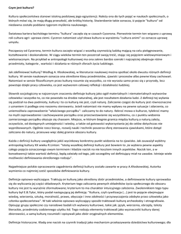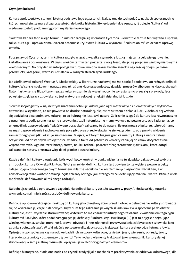 Czym jest kultura? Kultura społeczeństwa stanowi istotną podstawę jego egzystencji. Należy ona do tych pojęć w naukach społecznych, o których mówi się, że mają długą przeszłość, ale krótką historię. Stwierdzenie takie oznacza, iż pojęcie "kultura" od niedawna zostało poddane rygorom myślenia naukowego. Światowa kariera łacińskiego terminu "kultura" zaczęła się w czasach Cycerona. Pierwotnie termin ten wiązano z uprawą roli cultura agri- uprawa ziemi. Cyceron natomiast użył słowa kultura w wyrażeniu "cultura animi" co oznacza uprawę umysłu. Począwszy od Cycerona, termin kultura zaczęto wiązać z wszelką czynnością ludzką mającą na celu pielęgnowanie, kształtowanie i doskonalenie. W ciągu wieków termin ten poszerzał swoją treść, stając się pojęciem wielowymiarowym i wieloznacznym. Na przykład w antropologii kulturowej ma ona zakres bardzo szeroki i najczęściej obejmuje różne przedmioty, kategorie , wartości i działania w różnych sferach życia ludzkiego. Jak zdefiniować kulturę? Według A. Kłoskowskiej, w literaturze naukowej można spotkać około dwustu różnych definicji kultury. W sensie naukowym oznacza ona określone klasy przedmiotów, zjawisk i procesów albo pewne klasy zachowań. Natomiast w sensie filozoficznym przez kulturę rozumie się wszystko, co nie wyrasta samo przez się z przyrody, lecz powstaje dzięki pracy człowieka, co jest wytworem celowej refleksji i działalności ludzkiej. Słownik socjologiczny w najszerszym znaczeniu definiuje kulturę jako ogół materialnych i niematerialnych wytworów człowieka i wszystko to, co nie powstało na drodze naturalnej, ale jest rezultatem działania ludzi. Z definicji tej wyłania się podział na dwa podmioty, kulturę i to co kulturą nie jest, czyli naturę. Zaliczenie czegoś do kultury jest równoznaczne z uznaniem iż podlega ono naszemu sterowaniu. Jeżeli natomiast nie mamy wpływu na pewne sytuacje i zdarzenia, co uniemożliwia zaprowadzenie "właściwego porządku"- zaliczamy to do natury. Ilekroć mowa o kulturze, tylekroć mamy na myśli zaprowadzenie i zachowywanie porządku oraz przeciwstawianie się wszystkiemu, co z punktu widzenia zamierzonego porządku okazuje się chaosem. Miejsce, w którym biegnie granica między kulturą a naturą zależy, oczywiście, od dostępnych umiejętności i wiedzy, a także od gotowości wykorzystania jej do celów dotychczas nie wypróbowanych. Ogólnie rzecz biorąc, rozwój nauki i techniki poszerza sferę sterowania zjawiskami, które dotąd zaliczano do natury, przesuwa więc dalej granice obszaru kultury. Każda z definicji kultury uwzględnia jakiś wycinkowy konkretny punkt widzenia na to zjawisko. Jak zauważył wybitny antropolog kultury XX wieku R.Linton: "Istotą wszelkiej definicji kultury jest bowiem to ,że wybiera pewne aspekty całego pojęcia oznaczonego owym terminem i kładzie nacisk na nie kosztem innych aspektów. Nacisk ten, a w konsekwencji także wartość definicji, będą zależały od tego, jaki szczególny cel definiujący miał na uwadze. Istnieje wiele możliwości definiowania określonego rodzaju". Najpełniejsze polskie opracowanie zagadnienia definicji kultury zostało zawarte w pracy A.Kłoskowskiej. Autorka wymienia co najmniej sześć sposobów definiowania kultury. Definicje opisowo-wyliczające. Traktują on kulturę jako określony zbiór przedmiotów, a definiowanie kultury sprowadza się do wyliczania jej części składowych. Kryterium tego zaliczania pewnych składników życia społecznego do obszaru kultury nie jest tu wyraźnie sformułowane; kryterium to ma charakter intuicyjnego założenia. Zwolennikiem tego typu kultury był E.B.Tylor, który podał następującą jej definicję: "Kultura, czyli cywilizacja (...) jest to pojęcie obejmujące wiedzę, wierzenia, sztukę, moralność, prawo, obyczaje i inne zdolności i przyzwyczajenia zdobyte przez człowieka jako członka społeczeństwa". W taki właśnie opisowo-wyliczający sposób traktowali kulturę archeolodzy i etnografowie. Opisując grupy społeczne czy narodowe badali ich wytwory kulturowe, takie jak: język, wierzenia, obrzędy, teksty literackie, przedmioty codziennego użytku itd. Tego rodzaju elementy traktowali jako wyznaczniki kultury danej zbiorowości, a samą kulturę rozumieli i opisywali jako zbiór oryginalnych elementów. Definicje historyczne. Kładą one nacisk na czynnik tradycji jako mechanizm przekazywania dziedzictwa kulturowego; dla określenia kultury używają takich określeń jak: dziedzictwo, tradycja, dorobek. Kulturę definiuje się tutaj jako charakterystyczny dla człowieka rodzaj przekazu minionego doświadczenia przyszłym pokoleniom. Minione doświadczenia człowieka wyraża się w "świecie przedmiotowym", a przekazywane jest kolejnym pokoleniom w drodze wychowania i nauczania. Definicje normatywne akcentują podporządkowanie się zachowań ludzkich normom, wartościom i modelom. Wzory, modele i zasady wartościowania są traktowane jako elementy konstytutywne kultury, a podporządkowanie się tymże normom jako właściwość zachowań kulturowych. Kultura jest tu pojmowana jako zespół norm obowiązujących członków danej społeczności i warunkujących jej trwanie. Definicje psychologiczne skupiają uwagę na psychicznych mechanizmach kształtowania się kultury; analizują mechanizmy uczenia się, formowania nawyków kulturowych, internalizacji norm obowiązujących w danej zbiorowości i wartości przez tę zbiorowość uznawanych za oraz wpływ kultury na kształtowanie osobowości jednostek. Szczególny nacisk jest położony w tych definicjach na uczenie się i naśladownictwo jako procesy przyswajania kultury. Definicje strukturalne interesują się przede wszystkim strukturą danej kultury, tzn. zasadniczymi elementami tej kultury oraz ich wewnętrznymi powiązaniami. Zazwyczaj wymienia się cztery kategorie elementów kultury: mateialnotechniczne, sp