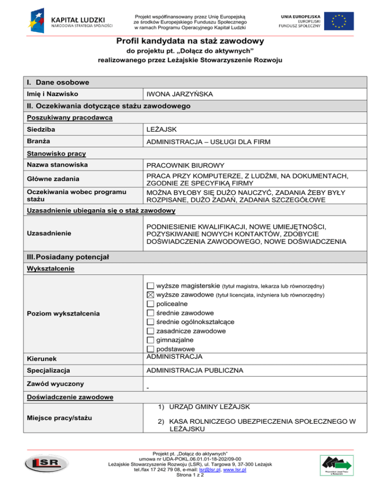 Projekt współfinansowany przez Unię Europejską ze środków Europejskiego Funduszu Społecznego w ramach Programu Operacyjnego Kapitał Ludzki Profil kandydata na staż zawodowy do projektu pt. „Dołącz do aktywnych” realizowanego przez Leżajskie Stowarzyszenie Rozwoju I. Dane osobowe Imię i Nazwisko IWONA JARZYŃSKA II. Oczekiwania dotyczące stażu zawodowego Poszukiwany pracodawca Siedziba LEŻAJSK Branża ADMINISTRACJA – USŁUGI DLA FIRM Stanowisko pracy Nazwa stanowiska PRACOWNIK BIUROWY Główne zadania PRACA PRZY KOMPUTERZE, Z LUDŹMI, NA DOKUMENTACH, ZGODNIE ZE SPECYFIKĄ FIRMY MOŻNA BYŁOBY SIĘ DUŻO NAUCZYĆ, ZADANIA ŻEBY BYŁY ROZPISANE, DUŻO ZADAŃ, ZADANIA SZCZEGÓŁOWE Oczekiwania wobec programu stażu Uzasadnienie ubiegania się o staż zawodowy PODNIESIENIE KWALIFIKACJI, NOWE UMIEJĘTNOŚCI, POZYSKIWANIE NOWYCH KONTAKTÓW, ZDOBYCIE DOŚWIADCZENIA ZAWODOWEGO, NOWE DOŚWIADCZENIA Uzasadnienie III. Posiadany potencjał Wykształcenie Kierunek wyższe magisterskie (tytuł magistra, lekarza lub równorzędny) wyższe zawodowe (tytuł licencjata, inżyniera lub równorzędny) policealne średnie zawodowe średnie ogólnokształcące zasadnicze zawodowe gimnazjalne podstawowe ADMINISTRACJA Specjalizacja ADMINISTRACJA PUBLICZNA Poziom wykształcenia Zawód wyuczony - Doświadczenie zawodowe 1) URZĄD GMINY LEŻAJSK Miejsce pracy/stażu 2) KASA ROLNICZEGO UBEZPIECZENIA SPOŁECZNEGO W LEŻAJSKU Projekt pt. „Dołącz do aktywnych” umowa nr UDA-POKL.06.01.01-18-202/09-00 Leżajskie Stowarzyszenie Rozwoju (LSR), ul. Targowa 9, 37-300 Leżajsk tel./fax 17 242 79 08, e-mail: [email protected], www.lsr.pl Strona 1 z 2 Projekt współfinansowany przez Unię Europejską ze środków Europejskiego Funduszu Społecznego w ramach Programu Operacyjnego Kapitał Ludzki 1) REJESTRACJA WNIOSKÓW, PRZYGOTOWYWANIE UMÓW O REFUNDACJĘ, SPRAWDZANIE DOKUMENTACJI PROJEKTÓW NA BUDOWĘ KANALIZACJI SANITARNEJ DLA POSZCZEGÓLNYCH MIEJSCOWOŚCI, OBSŁUGA INTERESANTÓW, POMOC W WYPEŁNIANIU WNIOSKÓW O REFUNDACJĘ ZA PRZYŁĄCZE KANALIZACJI SANITARNEJ, POMOC ROLNIKOM W WYPEŁNIANIU WNIOSKÓW O DOPŁATY BEZPOŚRENIE Opis zadań wykonywanych 2) ZAKŁADANIE AKT DLA UBEZPIECZONYCH ROLNIKÓW ORAZ WYPISYWANIE ZAŚWIADCZEŃ, ZAPOZNANIE SIĘ Z OBOWIĄZKAMI PRACOWNIKA ADMINISTRACYJNEGO, OBSŁUGA ADMINISTRACYJNA SEKRETARIATU W PT KRUS, BIEŻĄCE ZAŁATWIANIE SPRAW INTERESANTÓW ORAZ PRZYJMOWANIE DOKUMENTÓW Szkolenia i certyfikaty Szkolenia: - Certyfikaty: - Języki obce Poziom znajomości języków j. angielski słabo 1 2 3 4 5 biegle j. niemiecki słabo 1 2 3 4 5 biegle j. francuski słabo 1 2 3 4 5 biegle inny jaki? ……………………………… słabo 1 2 3 4 5 biegle Prawo jazdy A Kategoria B C D T BE CE Znajomość programów komputerowych Nazwa programu – poziom znajomości (słabo, dobrze, bardzo dobrze) MICROSOFT WINDOWS – BARDZO DOBRZE MICROSOFT WORD – BARDZO DOBRZE MICROSOFT EXCEL – DOBRZE Dodatkowe informacje Zainteresowania (np. hobby), aktywność (np. społeczna), przynależność do organizacji itp. KSIĄŻKA, MUZYKA Projekt pt. „Dołącz do aktywnych” umowa nr UDA-POKL.06.01.01-18-202/09-00 Leżajskie Stowarzyszenie Rozwoju (LSR), ul. Targowa 9, 37-300 Leżajsk tel./fax 17 242 79 08, e-mail: [email protected], www.lsr.pl Strona 2 z 2 DE brak