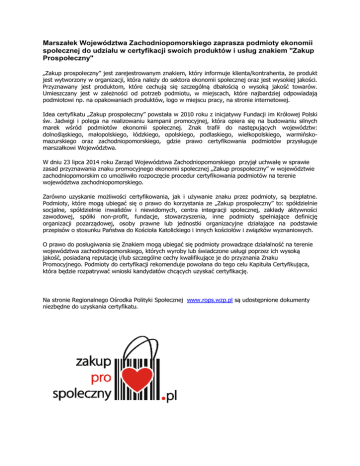 Marszałek Województwa Zachodniopomorskiego zaprasza podmioty ekonomii społecznej do udziału w certyfikacji swoich produktów i usług znakiem "Zakup Prospołeczny" „Zakup prospołeczny” jest zarejestrowanym znakiem, który informuje klienta/kontrahenta, że produkt jest wytworzony w organizacji, która należy do sektora ekonomii społecznej oraz jest wysokiej jakości. Przyznawany jest produktom, które cechują się szczególną dbałością o wysoką jakość towarów. Umieszczany jest w zależności od potrzeb podmiotu, w miejscach, które najbardziej odpowiadają podmiotowi np. na opakowaniach produktów, logo w miejscu pracy, na stronie internetowej. Idea certyfikatu „Zakup prospołeczny” powstała w 2010 roku z inicjatywy Fundacji im Królowej Polski św. Jadwigi i polega na realizowaniu kampanii promocyjnej, która opiera się na budowaniu silnych marek wśród podmiotów ekonomii społecznej. Znak trafił do następujących województw: dolnośląskiego, małopolskiego, łódzkiego, opolskiego, podlaskiego, wielkopolskiego, warmińskomazurskiego oraz zachodniopomorskiego, gdzie prawo certyfikowania podmiotów przysługuje marszałkowi Województwa. W dniu 23 lipca 2014 roku Zarząd Województwa Zachodniopomorskiego przyjął uchwałę w sprawie zasad przyznawania znaku promocyjnego ekonomii społecznej „Zakup prospołeczny” w województwie zachodniopomorskim co umożliwiło rozpoczęcie procedur certyfikowania podmiotów na terenie województwa zachodniopomorskiego. Zarówno uzyskanie możliwości certyfikowania, jak i używanie znaku przez podmioty, są bezpłatne. Podmioty, które mogą ubiegać się o prawo do korzystania ze „Zakup prospołeczny” to: spółdzielnie socjalne, spółdzielnie inwalidów i niewidomych, centra integracji społecznej, zakłady aktywności zawodowej, spółki non-profit, fundacje, stowarzyszenia, inne podmioty spełniające definicję organizacji pozarządowej, osoby prawne lub jednostki organizacyjne działające na podstawie przepisów o stosunku Państwa do Kościoła Katolickiego i innych kościołów i związków wyznaniowych. O prawo do posługiwania się Znakiem mogą ubiegać się podmioty prowadzące działalność na terenie województwa zachodniopomorskiego, których wyroby lub świadczone usługi poprzez ich wysoką jakość, posiadaną reputację i/lub szczególne cechy kwalifikujące je do przyznania Znaku Promocyjnego. Podmioty do certyfikacji rekomenduje powołana do tego celu Kapituła Certyfikująca, która będzie rozpatrywać wnioski kandydatów chcących uzyskać certyfikację. Na stronie Regionalnego Ośrodka Polityki Społecznej www.rops.wzp.pl są udostępnione dokumenty niezbędne do uzyskania certyfikatu. .
