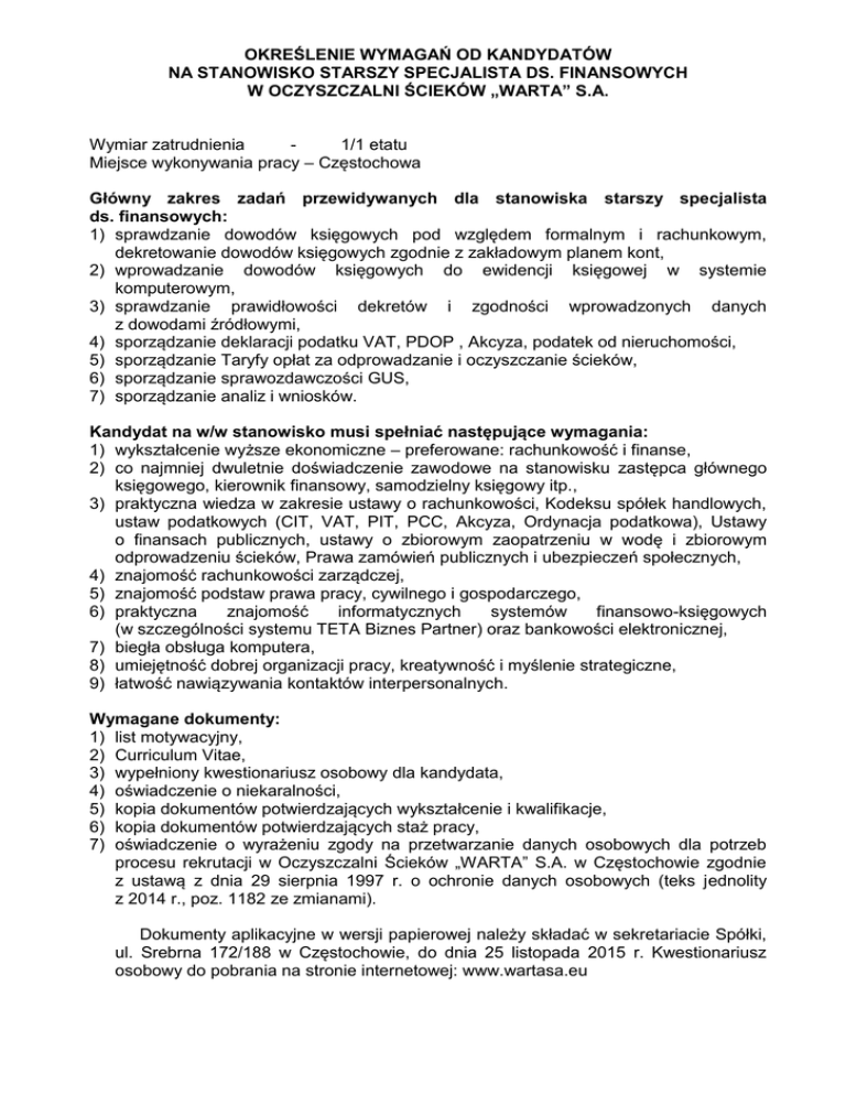 OKREŚLENIE WYMAGAŃ OD KANDYDATÓW NA STANOWISKO STARSZY SPECJALISTA DS. FINANSOWYCH W OCZYSZCZALNI ŚCIEKÓW „WARTA” S.A. Wymiar zatrudnienia 1/1 etatu Miejsce wykonywania pracy – Częstochowa Główny zakres zadań przewidywanych dla stanowiska starszy specjalista ds. finansowych: 1) sprawdzanie dowodów księgowych pod względem formalnym i rachunkowym, dekretowanie dowodów księgowych zgodnie z zakładowym planem kont, 2) wprowadzanie dowodów księgowych do ewidencji księgowej w systemie komputerowym, 3) sprawdzanie prawidłowości dekretów i zgodności wprowadzonych danych z dowodami źródłowymi, 4) sporządzanie deklaracji podatku VAT, PDOP , Akcyza, podatek od nieruchomości, 5) sporządzanie Taryfy opłat za odprowadzanie i oczyszczanie ścieków, 6) sporządzanie sprawozdawczości GUS, 7) sporządzanie analiz i wniosków. Kandydat na w/w stanowisko musi spełniać następujące wymagania: 1) wykształcenie wyższe ekonomiczne – preferowane: rachunkowość i finanse, 2) co najmniej dwuletnie doświadczenie zawodowe na stanowisku zastępca głównego księgowego, kierownik finansowy, samodzielny księgowy itp., 3) praktyczna wiedza w zakresie ustawy o rachunkowości, Kodeksu spółek handlowych, ustaw podatkowych (CIT, VAT, PIT, PCC, Akcyza, Ordynacja podatkowa), Ustawy o finansach publicznych, ustawy o zbiorowym zaopatrzeniu w wodę i zbiorowym odprowadzeniu ścieków, Prawa zamówień publicznych i ubezpieczeń społecznych, 4) znajomość rachunkowości zarządczej, 5) znajomość podstaw prawa pracy, cywilnego i gospodarczego, 6) praktyczna znajomość informatycznych systemów finansowo-księgowych (w szczególności systemu TETA Biznes Partner) oraz bankowości elektronicznej, 7) biegła obsługa komputera, 8) umiejętność dobrej organizacji pracy, kreatywność i myślenie strategiczne, 9) łatwość nawiązywania kontaktów interpersonalnych. Wymagane dokumenty: 1) list motywacyjny, 2) Curriculum Vitae, 3) wypełniony kwestionariusz osobowy dla kandydata, 4) oświadczenie o niekaralności, 5) kopia dokumentów potwierdzających wykształcenie i kwalifikacje, 6) kopia dokumentów potwierdzających staż pracy, 7) oświadczenie o wyrażeniu zgody na przetwarzanie danych osobowych dla potrzeb procesu rekrutacji w Oczyszczalni Ścieków „WARTA” S.A. w Częstochowie zgodnie z ustawą z dnia 29 sierpnia 1997 r. o ochronie danych osobowych (teks jednolity z 2014 r., poz. 1182 ze zmianami). Dokumenty aplikacyjne w wersji papierowej należy składać w sekretariacie Spółki, ul. Srebrna 172/188 w Częstochowie, do dnia 25 listopada 2015 r. Kwestionariusz osobowy do pobrania na stronie internetowej: www.wartasa.eu