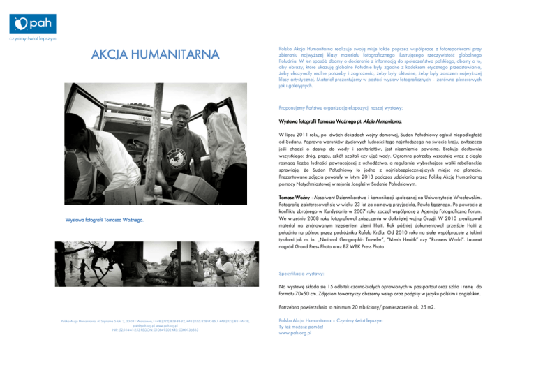 AKCJA HUMANITARNA Polska Akcja Humanitarna realizuje swoją misje także poprzez współprace z fotoreporterami przy zbieraniu najwyższej klasy materiału fotograficznego ilustrującego rzeczywistość globalnego Południa. W ten sposób dbamy o docieranie z informacją do społeczeństwa polskiego, dbamy o to, aby obrazy, które ukazują globalne Południe były zgodne z kodeksem etycznego przedstawiania, żeby ukazywały realne potrzeby i zagrożenia, żeby były aktualne, żeby były zarazem najwyższej klasy artystycznej. Materiał prezentujemy w postaci wystaw fotograficznych – zarówno plenerowych jak i galeryjnych. Proponujemy Państwu organizację ekspozycji naszej wystawy: Wystawa fotografii Tomasza Woźnego pt. Akcja Humanitarna. W lipcu 2011 roku, po dwóch dekadach wojny domowej, Sudan Południowy ogłosił niepodległość od Sudanu. Poprawa warunków życiowych ludności tego najmłodszego na świecie kraju, zwłaszcza jeśli chodzi o dostęp do wody i sanitariatów, jest niezmiernie powolna. Brakuje dosłownie wszystkiego: dróg, prądu, szkół, szpitali czy ujęć wody. Ogromne potrzeby wzrastają wraz z ciągle rosnącą liczbą ludności powracającej z uchodźctwa, a regularnie wybuchające walki rebelianckie sprawiają, że Sudan Południowy to jedno z najniebezpieczniejszych miejsc na planecie. Prezentowane zdjęcia powstały w lutym 2013 podczas udzielania przez Polską Akcję Humanitarną pomocy Natychmiastowej w rejonie Jonglei w Sudanie Południowym. Wystawa fotografii Tomasza Woźnego. Tomasz Woźny –Absolwent Dziennikarstwa i komunikacji społecznej na Uniwersytecie Wrocławskim. Fotografią zainteresował się w wieku 23 lat za namową przyjaciela, Pawła Łącznego. Po powrocie z konfliktu zbrojnego w Kurdystanie w 2007 roku zaczął współpracę z Agencją Fotograficzną Forum. We wrześniu 2008 roku fotografował zniszczenia w dotkniętej wojną Gruzji. W 2010 zrealizował materiał na zrujnowanym trzęsieniem ziemi Haiti. Rok później dokumentował przejście Haiti z południa na północ przez podróżnika Rafała Króla. Od 2010 roku na stałe współpracuje z takimi tytułami jak m. in. „National Geographic Traveler”, “Men's Health” czy “Runners World”. Laureat nagród Grand Press Photo oraz BZ WBK Press Photo Specyfikacja wystawy: Na wystawę składa się 15 odbitek czarno-białych oprawionych w passpartout oraz szkło i ramę do formatu 70x50 cm. Zdjęciom towarzyszy obszerny wstęp oraz podpisy w języku polskim i angielskim. Potrzebna powierzchnia to minimum 20 mb ściany/ pomieszczenie ok. 25 m2. Polska Akcja Humanitarna, ul. Szpitalna 5 lok. 3, 00-031 Warszawa, t +48 (022) 828-88-82, +48 (022) 828-90-86, f +48 (022) 831-99-38, [email protected], www.pah.org.pl NIP: 525-14-41-253 REGON: 010849302 KRS: 0000136833 Polska Akcja Humanitarna – Czynimy świat lepszym Ty też możesz pomóc! www.pah.org.pl