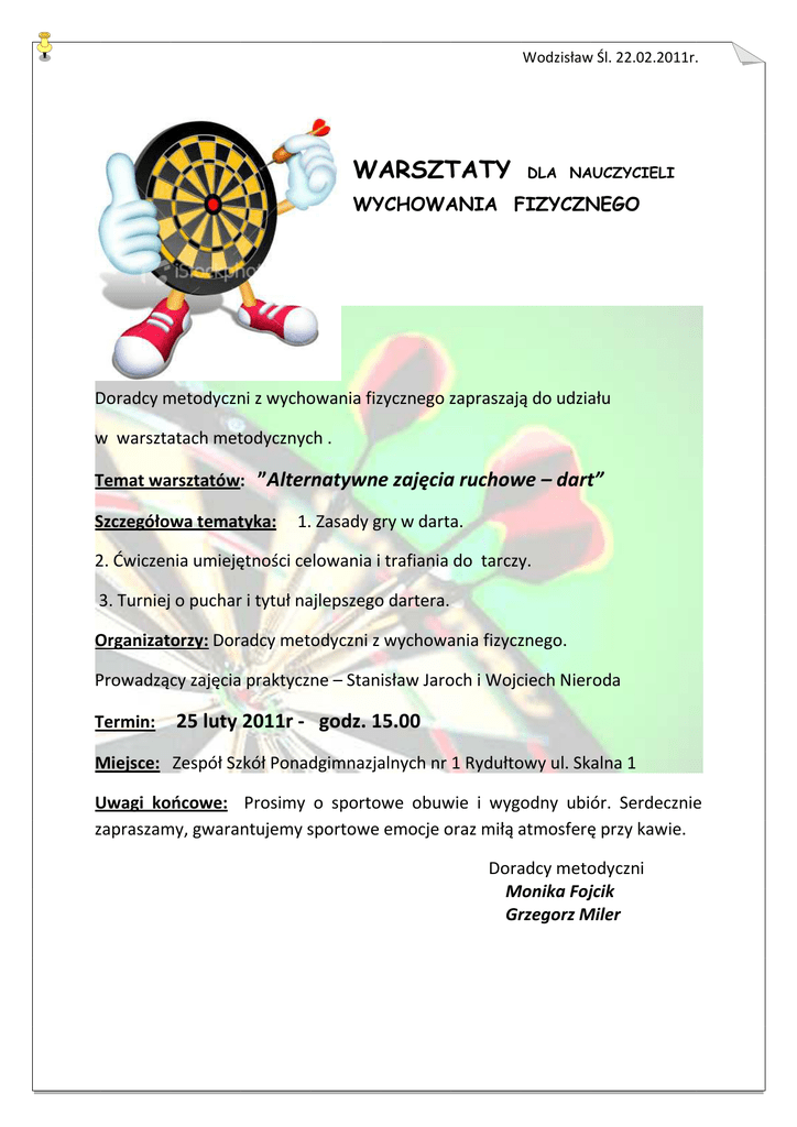 Wodzisław Śl. 22.02.2011r. WARSZTATY DLA NAUCZYCIELI WYCHOWANIA FIZYCZNEGO Doradcy metodyczni z wychowania fizycznego zapraszają do udziału w warsztatach metodycznych . Temat warsztatów: ”Alternatywne zajęcia ruchowe – dart” Szczegółowa tematyka: 1. Zasady gry w darta. 2. Ćwiczenia umiejętności celowania i trafiania do tarczy. 3. Turniej o puchar i tytuł najlepszego dartera. Organizatorzy: Doradcy metodyczni z wychowania fizycznego. Prowadzący zajęcia praktyczne – Stanisław Jaroch i Wojciech Nieroda Termin: 25 luty 2011r - godz. 15.00 Miejsce: Zespół Szkół Ponadgimnazjalnych nr 1 Rydułtowy ul. Skalna 1 Uwagi końcowe: Prosimy o sportowe obuwie i wygodny ubiór. Serdecznie zapraszamy, gwarantujemy sportowe emocje oraz miłą atmosferę przy kawie. Doradcy metodyczni Monika Fojcik Grzegorz Miler