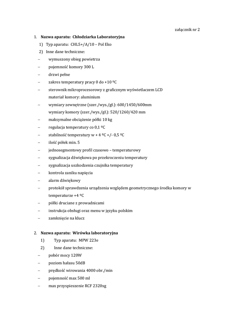 załącznik nr 2 1. Nazwa aparatu: Chłodziarka Laboratoryjna 1) Typ aparatu: CHL5+/A/10 – Pol Eko 2) Inne dane techniczne: − wymuszony obieg powietrza − pojemność komory 300 L − drzwi pełne − zakres temperatury pracy 0 do +10 ºC − sterownik mikroprocesorowy z graficznym wyświetlaczem LCD materiał komory: aluminium − wymiary zewnętrzne (szer./wys./gł.): 600/1450/600mm wymiary komory (szer./wys./gł.): 520/1260/420 mm − maksymalne obciążenie półki 10 kg − regulacja temperatury co 0,1 ºC − stabilność temperatury w + 4 ºC +/- 0,5 ºC − ilość półek min. 5 − jednosegmentowy profil czasowo – temperaturowy − sygnalizacja dźwiękowa po przekroczeniu temperatury − sygnalizacja uszkodzenia czujnika temperatury − kontrola zaniku napięcia − alarm dźwiękowy − protokół sprawdzenia urządzenia względem geometrycznego środka komory w temperaturze +4 ºC − półki druciane z prowadnicami − instrukcja obsługi oraz menu w języku polskim − zamknięcie na klucz 2. Nazwa aparatu: Wirówka laboratoryjna 1) Typ aparatu: MPW 223e 2) Inne dane techniczne: − pobór mocy 120W − poziom hałasu 50dB − prędkość wirowania 4000 obr./min − pojemność max 500 ml − max przyspieszenie RCF 2320xg − zakres czasowy 1÷99 min. − głębokość 435 mm − szerokość 355 mm − wysokość 270 mm − waga 13 kg − sygnalizacja niewyważenia − wirówka wentylowana − wyposażenie dodatkowe w postaci wirnika kątowego (11333): kąt 30˚ − pojemność wirnika 10x50ml probówki Falcon i max obr./min 4000 3. Nazwa aparatu: Szafa termostatyczna 1) Typ aparatu: ST1 BASIC – Adverti 2) Inne dane techniczne: − obieg powietrza: wymuszony − pojemność komory: 68 l − drzwi: pełne − zakres temperatury pracy: +3 do +40 C − sterownik mikroprocesorowy z graficznym wyświetlaczem LCD − materiał komory: aluminium − wymiary zewnętrzne szer/wys/gł): 570/600/670 mm − wymiary komory (szer/wys/gł): 470/430/300 mm − maksymalne obciążenie półki:10 kg − regulacja temperatury: co 0,1 C − stabilność temp. +/-0,2C − ilość półek min. 2 − układ chłodzący i grzewczy − sześciosegmentowy profil czasowo temperaturowy − możliwość podglądu zadanych i bieżących parametrów podczas pracy urządzenia − rejestracja min i max temperatury − sygnalizacja uszkodzenia czujnika − zamknięcie na klucz