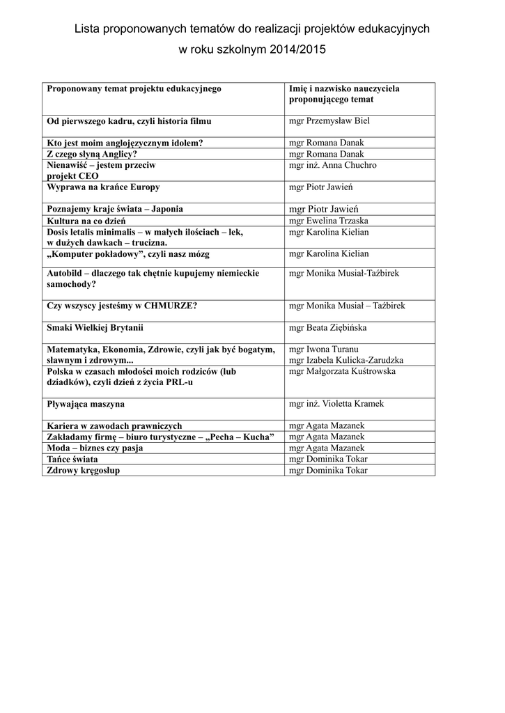Lista proponowanych tematów do realizacji projektów edukacyjnych w roku szkolnym 2014/2015 Proponowany temat projektu edukacyjnego Imię i nazwisko nauczyciela proponującego temat Od pierwszego kadru, czyli historia filmu mgr Przemysław Biel Kto jest moim anglojęzycznym idolem? Z czego słyną Anglicy? Nienawiść – jestem przeciw projekt CEO Wyprawa na krańce Europy mgr Romana Danak mgr Romana Danak mgr inż. Anna Chuchro Poznajemy kraje świata – Japonia Kultura na co dzień Dosis letalis minimalis – w małych ilościach – lek, w dużych dawkach – trucizna. „Komputer pokładowy”, czyli nasz mózg mgr Piotr Jawień Autobild – dlaczego tak chętnie kupujemy niemieckie samochody? mgr Monika Musiał-Taźbirek Czy wszyscy jesteśmy w CHMURZE? mgr Monika Musiał – Taźbirek Smaki Wielkiej Brytanii mgr Beata Ziębińska Matematyka, Ekonomia, Zdrowie, czyli jak być bogatym, sławnym i zdrowym... Polska w czasach młodości moich rodziców (lub dziadków), czyli dzień z życia PRL-u mgr Iwona Turanu mgr Izabela Kulicka-Zarudzka mgr Małgorzata Kuśtrowska Pływająca maszyna mgr inż. Violetta Kramek Kariera w zawodach prawniczych Zakładamy firmę – biuro turystyczne – „Pecha – Kucha” Moda – biznes czy pasja Tańce świata Zdrowy kręgosłup mgr Agata Mazanek mgr Agata Mazanek mgr Agata Mazanek mgr Dominika Tokar mgr Dominika Tokar mgr Piotr Jawień mgr Ewelina Trzaska mgr Karolina Kielian mgr Karolina Kielian