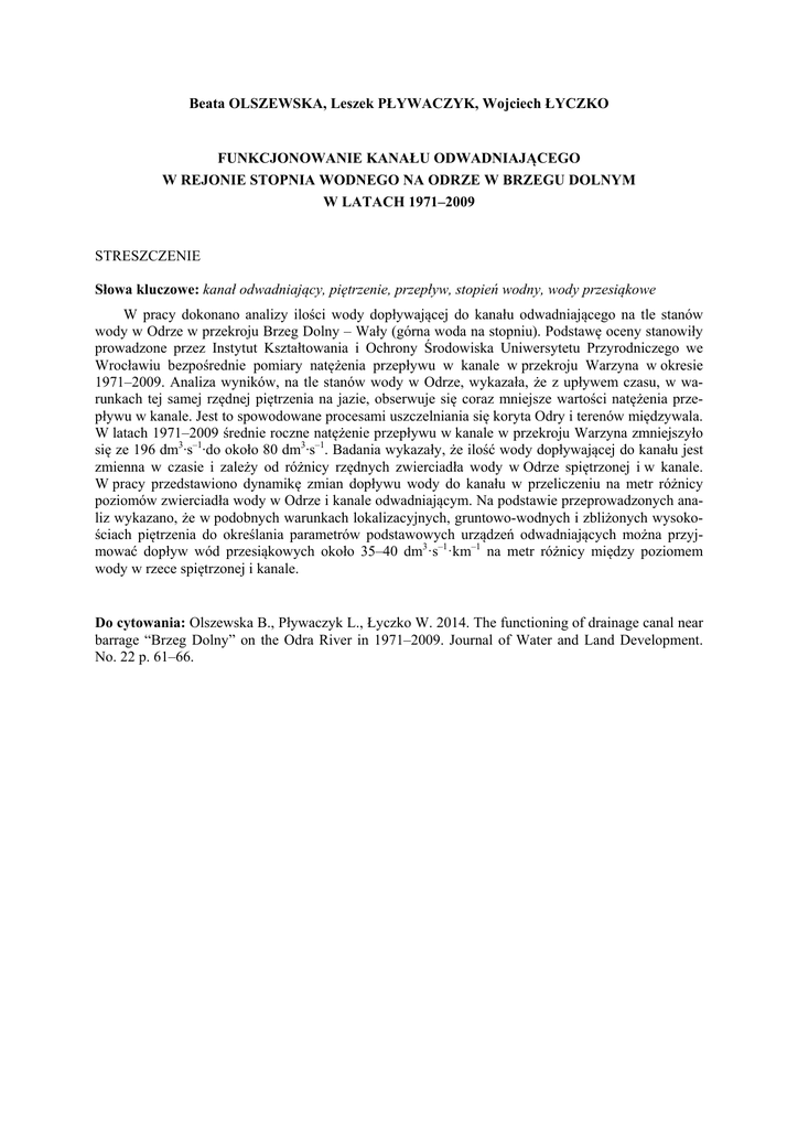 Beata OLSZEWSKA, Leszek PŁYWACZYK, Wojciech ŁYCZKO FUNKCJONOWANIE KANAŁU ODWADNIAJĄCEGO W REJONIE STOPNIA WODNEGO NA ODRZE W BRZEGU DOLNYM W LATACH 1971–2009 STRESZCZENIE Słowa kluczowe: kanał odwadniający, piętrzenie, przepływ, stopień wodny, wody przesiąkowe W pracy dokonano analizy ilości wody dopływającej do kanału odwadniającego na tle stanów wody w Odrze w przekroju Brzeg Dolny – Wały (górna woda na stopniu). Podstawę oceny stanowiły prowadzone przez Instytut Kształtowania i Ochrony Środowiska Uniwersytetu Przyrodniczego we Wrocławiu bezpośrednie pomiary natężenia przepływu w kanale w przekroju Warzyna w okresie 1971–2009. Analiza wyników, na tle stanów wody w Odrze, wykazała, że z upływem czasu, w warunkach tej samej rzędnej piętrzenia na jazie, obserwuje się coraz mniejsze wartości natężenia przepływu w kanale. Jest to spowodowane procesami uszczelniania się koryta Odry i terenów międzywala. W latach 1971–2009 średnie roczne natężenie przepływu w kanale w przekroju Warzyna zmniejszyło się ze 196 dm3·s–1·do około 80 dm3·s–1. Badania wykazały, że ilość wody dopływającej do kanału jest zmienna w czasie i zależy od różnicy rzędnych zwierciadła wody w Odrze spiętrzonej i w kanale. W pracy przedstawiono dynamikę zmian dopływu wody do kanału w przeliczeniu na metr różnicy poziomów zwierciadła wody w Odrze i kanale odwadniającym. Na podstawie przeprowadzonych analiz wykazano, że w podobnych warunkach lokalizacyjnych, gruntowo-wodnych i zbliżonych wysokościach piętrzenia do określania parametrów podstawowych urządzeń odwadniających można przyjmować dopływ wód przesiąkowych około 35–40 dm3·s–1·km–1 na metr różnicy między poziomem wody w rzece spiętrzonej i kanale. Do cytowania: Olszewska B., Pływaczyk L., Łyczko W. 2014. The functioning of drainage canal near barrage “Brzeg Dolny” on the Odra River in 1971–2009. Journal of Water and Land Development. No. 22 p. 61–66.