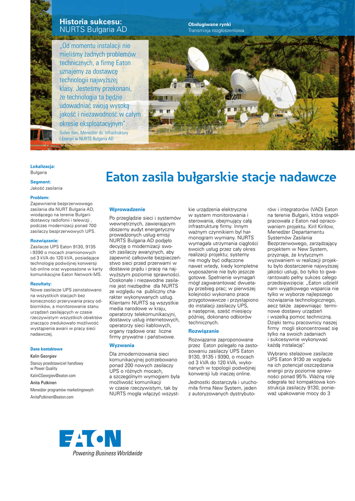 Historia sukcesu: NURTS Bułgaria AD Obsługiwane rynki Transmisja rozgłoszeniowa „Od momentu instalacji nie mieliśmy żadnych problemów technicznych, a firmę Eaton uznajemy za dostawcę technologii najwyższej klasy. Jesteśmy przekonani, że technologia ta będzie udowadniać swoją wysoką jakość i niezawodność w całym okresie eksploatacyjnym”. Svilen Iliev, Menedżer ds. Infrastruktury i Energii w NURTS Bulgaria AD Lokalizacja: Bułgaria Segment: Jakość zasilania Problem: Zapewnienie bezprzerwowego zasilania dla NURT Bułgaria AD, wiodącego na terenie Bułgarii dostawcy radiofonii i telewizji , podczas modernizacji ponad 700 zasilaczy bezprzerwowych UPS. Rozwiązanie: Zasilacze UPS Eaton 9130, 9135 i 9390 o mocach znamionowych od 3 kVA do 120 kVA, posiadające technologię podwójnej konwersji lub online oraz wyposażone w karty komunikacyjne Eaton Network-MS. Rezultaty: Nowe zasilacze UPS zainstalowano na wszystkich stacjach bez konieczności przerywania pracy odbiorników, a monitorowanie stanu urządzeń zasilających w czasie rzeczywistym wszystkich obiektów znacząco zredukowało możliwość wystąpienia awarii w pracy sieci nadawczej. Dane kontaktowe Kalin Georgiev Starszy przedstawiciel handlowy w Power Quality [email protected] Anita Putkinen Menedżer programów marketingowych [email protected] Eaton zasila bułgarskie stacje nadawcze Wprowadzenie Po przeglądzie sieci i systemów wewnętrznych, zawierającym obszerny audyt energetyczny prowadzonych usług emisji NURTS Bulgaria AD podjęło decyzję o modernizacji swoich zasilaczy awaryjnych, aby zapewnić całkowite bezpieczeństwo sieci przed przerwami w dostawie prądu i pracę na najwyższym poziomie sprawności. Doskonałe i niezawodne zasilanie jest niezbędne dla NURTS ze względu na publiczny charakter wykonywanych usług. Klientami NURTS są wszystkie media narodowe w kraju, operatorzy telekomunikacyjni, dostawcy usług internetowych, operatorzy sieci kablowych, organy rządowe oraz liczne firmy prywatne i państwowe. Wyzwania Dla zmodernizowania sieci komunikacyjnej potrzebowano ponad 200 nowych zasilaczy UPS o różnych mocach, a szczególnym wymogiem była możliwość komunikacji w czasie rzeczywistym, tak by NURTS mogła włączyć wszyst- kie urządzenia elektryczne w system monitorowania i sterowania, obejmujący całą infrastrukturę firmy. Innym ważnym czynnikiem był harmonogram wymiany. NURTS wymagała utrzymania ciągłości swoich usług przez cały okres realizacji projektu; systemy nie mogły być odłączone nawet wtedy, kiedy kompletne wyposażenie nie było jeszcze gotowe. Spełnienie wymagań mógł zagwarantować dwuetapy przebieg prac; w pierwszej kolejności wykonano prace przygotowawcze i przystąpiono do instalacji zasilaczy UPS, a następnie, sześć miesięcy później, dokonano odbiorów technicznych. Rozwiązanie Rozwiązanie zaproponowane przez Eaton polegało na zastosowaniu zasilaczy UPS Eaton 9130, 9135 i 9390, o mocach od 3 kVA do 120 kVA, wykonanych w topologii podwójnej konwersji lub inaczej online. Jednostki dostarczyła i uruchomiła firma New System, jeden z autoryzowanych dystrybuto- rów i integratorów (VAD) Eaton na terenie Bułgarii, która współpracowała z Eaton nad opracowaniem projektu. Kirił Kiriłow, Menedżer Departamentu Systemów Zasilania Bezprzerwowego, zarządzający projektem w New System, przyznaje, że krytycznym wyzwaniem w realizacji projektu było dostarczenie najwyższej jakości usługi, bo tylko to gwarantowało pełny sukces całego przedsięwzięcia: „Eaton udzielił nam wyjątkowego wsparcia nie tylko w wyborze najlepszego rozwiązania technologicznego, aecz także zapewniając terminowe dostawy urządzeń i wszelką pomoc techniczną. Dzięki temu pracownicy naszej firmy mogli skoncentrować się tylko na swoich zadaniach i sukcesywnie wykonywać każdą instalację”. Wybrano stelażowe zasilacze UPS Eaton 9130 ze względu na ich potencjał oszczędzania energii przy poziomie sprawności ponad 95%. Ważną rolę odegrała też kompaktowa konstrukcja zasilaczy 9130, ponieważ upakowanie mocy do 3 kVA zajmowało tylko wysokość 2U szafy montażowej. UPS wykorzystuje technologię ładowania nieciągłego ABM®, która znacząco wydłuża czas eksploatacji akumulatorów i ma podświetlany interfejs użytkownika LCD, ułatwiający monitorowanie Zasilacze UPS Eaton 9135 wybrano również ze względu na ich walory konfiguracyjne wieżowe i stelażowe, dające możliwość uniwersalnego montażu, użytecznego w razie modernizacji starszych systemów, jakie posiadał NURTS. Wszystkie zasilacze UPS 9130 i 9135 były dostarczone z opcjonalnymi zewnętrznymi modułami bateryjnymi (EBM), pozwalającymi na wydłużenie czasu podtrzymania i z opcjonalnymi zewnętrznymi by-pasami serwisowymi, gwarantującymi ciągłą pracę podczas konserwacji i modernizacji systemu UPS. NURTS zastosował także zasilacze UPS Eaton 9390 w konfiguracji równoległej celem zwiększenia niezawodności satelitarnego centrum sterowania w Plana Mountain, jednej z najważniejszych stacji w sieci NURTS. UPS cechuje się skalowalnym czasem podtrzymania i technologią pracy równoległej Hot Sync, zapewniającą najlepszą na świecie ochronę zasilania przy dużej gęstości mocy dla najbardziej krytycznych systemów, takich jak śledzenie satelitów czy zastosowania medyczne. UPS łączy wysoką sprawność z pracą w topologii podwójnej konwersji, która zapewnia absolutną niezawodność, a więc jest idealnym rozwiązaniem dla obiektu w Plana Mountain. dzięki czemu UPS mógł być podłączony do firmowej sieci IP w celu sterowania i nadzoru oraz zdalnie monitorowany i zarządzany. W stacjach nadawczo-odbiorczych zainstalowano także czujniki środowiskowe firmy Eaton do monitorowania temperatury otoczenia i wilgotności, zapewniające wczesne ostrzeganie o niekorzystnych zmianach warunkach środowiskowych, aby praca cennych urządzeń i ciągłość ich 