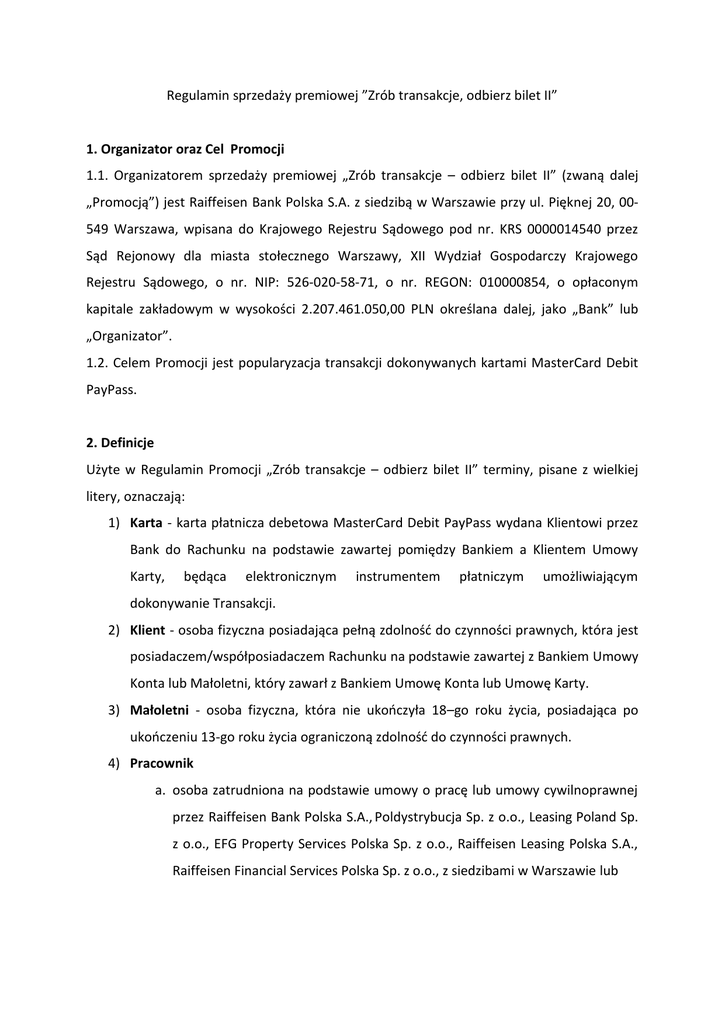 Regulamin sprzedaży premiowej ”Zrób transakcje, odbierz bilet II” 1. Organizator oraz Cel Promocji 1.1. Organizatorem sprzedaży premiowej „Zrób transakcje – odbierz bilet II” (zwaną dalej „Promocją”) jest Raiffeisen Bank Polska S.A. z siedzibą w Warszawie przy ul. Pięknej 20, 00549 Warszawa, wpisana do Krajowego Rejestru Sądowego pod nr. KRS 0000014540 przez Sąd Rejonowy dla miasta stołecznego Warszawy, XII Wydział Gospodarczy Krajowego Rejestru Sądowego, o nr. NIP: 526-020-58-71, o nr. REGON: 010000854, o opłaconym kapitale zakładowym w wysokości 2.207.461.050,00 PLN określana dalej, jako „Bank” lub „Organizator”. 1.2. Celem Promocji jest popularyzacja transakcji dokonywanych kartami MasterCard Debit PayPass. 2. Definicje Użyte w Regulamin Promocji „Zrób transakcje – odbierz bilet II” terminy, pisane z wielkiej litery, oznaczają: 1) Karta - karta płatnicza debetowa MasterCard Debit PayPass wydana Klientowi przez Bank do Rachunku na podstawie zawartej pomiędzy Bankiem a Klientem Umowy Karty, będąca elektronicznym instrumentem płatniczym umożliwiającym dokonywanie Transakcji. 2) Klient - osoba fizyczna posiadająca pełną zdolnośd do czynności prawnych, która jest posiadaczem/współposiadaczem Rachunku na podstawie zawartej z Bankiem Umowy Konta lub Małoletni, który zawarł z Bankiem Umowę Konta lub Umowę Karty. 3) Małoletni - osoba fizyczna, która nie ukooczyła 18–go roku życia, posiadająca po ukooczeniu 13-go roku życia ograniczoną zdolnośd do czynności prawnych. 4) Pracownik a. osoba zatrudniona na podstawie umowy o pracę lub umowy cywilnoprawnej przez Raiffeisen Bank Polska S.A., Poldystrybucja Sp. z o.o., Leasing Poland Sp. z o.o., EFG Property Services Polska Sp. z o.o., Raiffeisen Leasing Polska S.A., Raiffeisen Financial Services Polska Sp. z o.o., z siedzibami w Warszawie lub b. osoba świadcząca pracę na rzecz Banku, a zatrudniona na podstawie umowy o pracę lub umowy cywilnoprawnej przez Mellon Poland Sp. z o.o., Finance Care Sp. z o.o., lub c. osoba zatrudniona przez Partnera bądź będąca Partnerem lub d. osoba, która zawarła z Bankiem umowę współpracy z Klientem w ramach bankowości prywatnej Friedrich Wilhelm Raiffeisen. 5) Partner - przedsiębiorca prowadzący placówkę bankową na podstawie umowy agencyjnej zawartej z Bankiem. 6) Promocja – niniejsza Promocja „Zrób transakcje – odbierz bilet II” 7) Rachunek - indywidualny lub wspólny, Rachunek Mistrzowskie Konto Osobiste lub Rachunek Ale!Konto prowadzony przez Bank dla Klienta na podstawie zawartej pomiędzy Bankiem a Klientem Umowy Konta. 8) Rachunek Ale!Konto - Rachunek w PLN prowadzony przez Bank, o którym mowa w Tabeli Opłat i Prowizji rachunków bankowych prowadzonych dla Klientów indywidualnych w Raiffeisen Bank Polska S.A. 9) Rachunek Mistrzowskie Konto Osobiste – Rachunek w PLN prowadzony przez Bank, o którym mowa w Tabeli Opłat i Prowizji rachunków bankowych prowadzonych dla Klientów indywidualnych w Raiffeisen Bank Polska S.A. 10) Regulamin - niniejszy Regulamin Promocji. 11) Serwis Telefoniczny Polbank24 – instrument płatniczy, funkcjonalnośd umożliwiająca dostęp do Konta za pośrednictwem telefonu, udostępniana Klientowi przez Bank zgodnie z zasadami określanymi w Regulaminie. 12) Transakcja - bezgotówkowa zapłata za towary lub usługi dokonywana w placówce handlowej lub usługowej z wykorzystaniem Karty. 13) Uczestnik – Klient posiadający Kartę wydaną przez Bank do Rachunku spełniający warunki udziału w Promocji. 14) Umowa Karty – umowa pomiędzy Bankiem, a Klientem zawierana w formie pisemnej na czas oznaczony, na podstawie której Klientowi wydawana jest Karta wraz z wszystkimi załącznikami stanowiącymi jej integralną częśd, w tym Regulaminem Konta, Tabelą Oprocentowania rachunków bankowych prowadzonych dla Klientów indywidualnych w Raiffeisen Bank Polska S.A. i Tabelą Opłat i Prowizji rachunków bankowych prowadzonych dla Klientów indywidualnych w Raiffeisen Bank Polska S.A. 15) Umowa Konta – umowa zawarta pomiędzy Bankiem a Klientem w formie pisemnej dotycząca udostępniania Klientowi przez Bank usługi konto wraz z wszystkimi załącznikami stanowiącymi jej integralną częśd, w tym Regulaminem Konta, Tabelą Oprocentowania rachunków bankowych prowadzonych dla Klientów indywidualnych w Raiffeisen Bank Polska S.A. i Tabelą Opłat i Prowizji rachunków bankowych prowadzonych dla Klientów indywidualnych w Raiffeisen Bank Polska S.A. 3. Czas trwania Promocji 3.1. Czas trwania Promocji obejmuje okres od dnia 01 sierpnia 2013 r. do dnia 15 września 2013 r. włącznie. 3.2. Organizator może zmienid termin trwania Promocji poprzez jej wydłużenie. Informacja o wydłużeniu okresu trwania Promocji będzie dostępna w oddziałach Banku oraz na stronie www.raiffeisenpolbank.com. 4. Uczestnicy Promocji 4.1. Uczestnikiem Promocji może byd Klient: a) który w okresie Promocji zawarł lub ma zawartą Umowę Konta oraz Umowę Karty, które nie zostały wypowiedziane przez żadną ze stron; b) który jest posiadaczem Mistrzowskiego Konta Osobistego lub Rachunku ALE!Konto oraz jest posiadaczem Karty płatniczej debetowej MasterCard Debit PayPass; c) na którego Mistrzowskim Koncie Osobistym lub Rachunku Ale!Konto, w okresie od dnia 01.06.2013 r. do dnia 30.06.2013 r. zostały zaksięgowane Transakcje bezgotówkowe wykonane Kartą wydaną do tego rachunku na łączną kwotę nie wyższą niż 49,99 zł. d) który posiada numer telefonu komórkowego i w dniu rozpoczęcia konkursu numer telefonu komórkowego widnieje w systemie Banku, jako numer kontaktowy; e) który na podstawie art. 32 ust.1 pkt. 8 ustawy z dnia 29 sierpnia 1997 r. o ochronie danych osobowych (tekst jednolity Dz.U z 2002 r. Nr 101, poz.926 z późn. zm.) nie zgłosił sprzeciwu, co do przetwarzania dotyczących go danych osobowych w celach marketingowych; f) który wyraził zgodę na otrzymywanie informacj