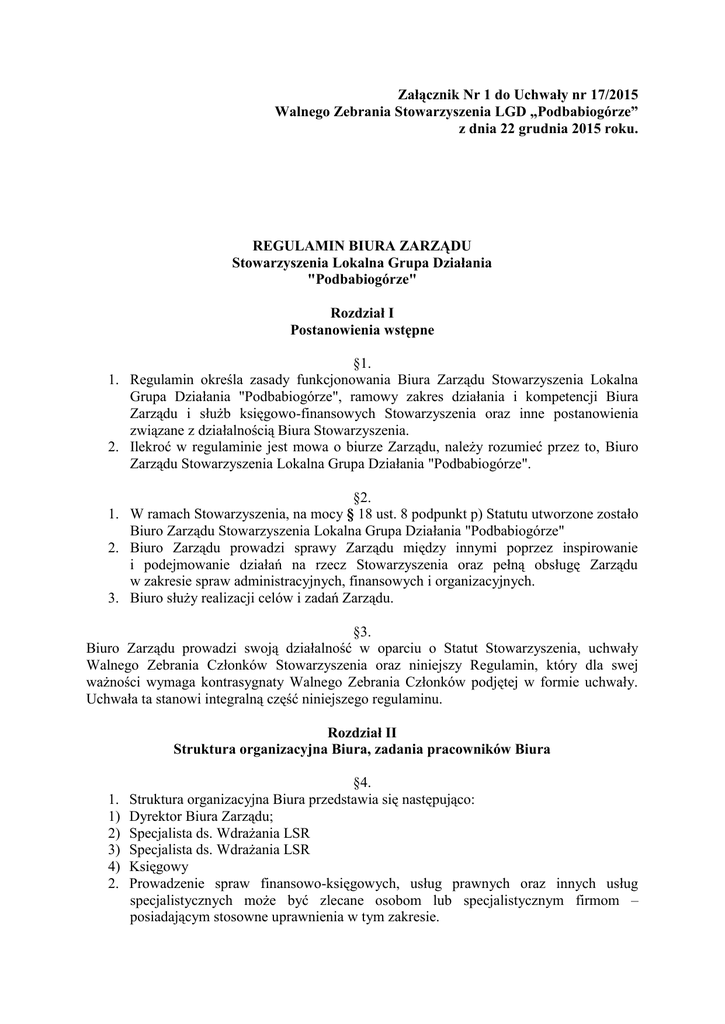 Załącznik Nr 1 do Uchwały nr 17/2015 Walnego Zebrania Stowarzyszenia LGD „Podbabiogórze” z dnia 22 grudnia 2015 roku. REGULAMIN BIURA ZARZĄDU Stowarzyszenia Lokalna Grupa Działania "Podbabiogórze" Rozdział I Postanowienia wstępne §1. 1. Regulamin określa zasady funkcjonowania Biura Zarządu Stowarzyszenia Lokalna Grupa Działania "Podbabiogórze", ramowy zakres działania i kompetencji Biura Zarządu i służb księgowo-finansowych Stowarzyszenia oraz inne postanowienia związane z działalnością Biura Stowarzyszenia. 2. Ilekroć w regulaminie jest mowa o biurze Zarządu, należy rozumieć przez to, Biuro Zarządu Stowarzyszenia Lokalna Grupa Działania "Podbabiogórze". §2. 1. W ramach Stowarzyszenia, na mocy § 18 ust. 8 podpunkt p) Statutu utworzone zostało Biuro Zarządu Stowarzyszenia Lokalna Grupa Działania "Podbabiogórze" 2. Biuro Zarządu prowadzi sprawy Zarządu między innymi poprzez inspirowanie i podejmowanie działań na rzecz Stowarzyszenia oraz pełną obsługę Zarządu w zakresie spraw administracyjnych, finansowych i organizacyjnych. 3. Biuro służy realizacji celów i zadań Zarządu. §3. Biuro Zarządu prowadzi swoją działalność w oparciu o Statut Stowarzyszenia, uchwały Walnego Zebrania Członków Stowarzyszenia oraz niniejszy Regulamin, który dla swej ważności wymaga kontrasygnaty Walnego Zebrania Członków podjętej w formie uchwały. Uchwała ta stanowi integralną część niniejszego regulaminu. Rozdział II Struktura organizacyjna Biura, zadania pracowników Biura 1. 1) 2) 3) 4) 2. §4. Struktura organizacyjna Biura przedstawia się następująco: Dyrektor Biura Zarządu; Specjalista ds. Wdrażania LSR Specjalista ds. Wdrażania LSR Księgowy Prowadzenie spraw finansowo-księgowych, usług prawnych oraz innych usług specjalistycznych może być zlecane osobom lub specjalistycznym firmom – posiadającym stosowne uprawnienia w tym zakresie. 1. Biurem Zarządu kieruje Dyrektor Biura Zarządu zatrudniony przez Zarząd Stowarzyszenia Lokalna Grupa Działania "Podbabiogórze", który może z upoważnienia Zarządu reprezentować Stowarzyszenie na zewnątrz w granicach umocowania. 2. Na wniosek Dyrektora Biura Zarządu, Zarząd zatrudnia pozostałych pracowników, określa ich kompetencje, obowiązki, odpowiedzialność oraz czas pracy i wynagrodzenie. 3. Zarząd udziela pełnomocnictwa Dyrektorowi Biura Zarządu do prowadzenia spraw bieżących Stowarzyszenia. §5. Dyrektor Biura Zarządu sprawuje pieczę nad majątkiem i sprawami Stowarzyszenia w ramach jego umocowania oraz spełnia swoje obowiązki ze starannością wymaganą w obrocie gospodarczo-finansowym przy ścisłym przestrzeganiu przepisów prawa oraz postanowień statutu, uchwał Walnego Zebrania Członków Stowarzyszenia i uchwał Zarządu. §6. Do obowiązków Dyrektora Biura Zarządu należy wykonywanie zaleceń pokontrolnych organu przeprowadzającego kontrole oraz udzielanie kontrolującemu i władzom Stowarzyszenia wyczerpujących wyjaśnień wraz z przedstawieniem wszelkich dokumentów i innych materiałów dotyczących przedmiotu kontroli. §7. Dyrektor Biura Zarządu jest odpowiedzialny za prawidłowe zarządzanie sprawami Stowarzyszenia - w ramach posiadanych uprawnień i nie zastrzeżonych do kompetencji innych organów Stowarzyszenia - oraz Biurem Zarządu i należytą realizacją następujących zadań: 1) wykonywanie uchwał Walnego Zebrania Członków, Zarządu Stowarzyszenia oraz Rady, 2) realizacja zadań określonych przez Zarząd, 3) prowadzenie bieżących spraw Stowarzyszenia, 4) gromadzenie i udostępnianie informacji z zakresu działalności Stowarzyszenia, 5) prowadzenie działalności wydawniczej, 6) wydawanie wewnętrznych materiałów informacyjnych i problemowych, 7) ogólne poradnictwo prawne, finansowe, organizacyjne i inne w oparciu o własny bank danych oraz zamawiane ekspertyzy i opinie specjalistyczne, 8) przygotowywanie materiałów na Walne Zebranie Członków, zebrania Zarządu Stowarzyszenia oraz Rady, 9) opracowywanie projektów zmian w statucie i regulaminach organizacyjnych, 10) obsługa Walnego Zebrania Członków, 11) sporządzanie protokołów z Walnego Zebrania Członków oraz zebrań Rady 12) prowadzenie dokumentacji Walnego Zebrania Członków, Zarządu oraz Rady, 13) sporządzanie odpisów uchwał Walnego Zebrania Członków i wydawanie ich uprawnionym organom, 14) prowadzenie dokumentacji członkowskiej, 15) obsługa Zarządu oraz Rady, 16) sporządzanie syntetycznych protokołów z zebrań Zarządu, 17) prowadzenie rejestru uchwał Walnego Zebrania Członków, Zarządu oraz Rady, 18) opracowywanie planów pracy, budżetu oraz sprawozdań merytorycznych i finansowych, 19) prowadzenie korespondencji, 20) udział w różnego rodzaju naradach, sympozjach, szkoleniach, uroczystościach związanych z działalnością Stowarzyszenia, 21) utrzymywanie stałego kontaktu z członkami wspierającymi i honorowymi Stowarzyszenia, 22) prowadzenie spraw kadrowych i dokumentacji Stowarzyszenia, 23) sprawowanie pieczy nad sprzętem biurowym oraz zlecanie przeprowadzenia jego konserwacji lub naprawy. §8. Dyrektor Biura Zarządu przy wykonywaniu swoich zadań działa w oparciu o udzielone pełnomocnictwo ogólne obejmujące umocowanie do zwykłego zarządu sprawami Biura w imieniu Stowarzyszenia. §9. Dyrektor Biura Zarządu jest upoważniony do: 1) reprezentowania Stowarzyszenia w granicach umocowania, 2) prowadzenia zwykłego zarządu sprawami Stowarzyszenia, 3) podpisywania bieżącej korespondencji, 4) dokonywania samodzielnych zakupów bieżących jednorazowo do wysokości 6000,00 EURO, po akceptacji Zarządu, 5) zawierania umów - zleceń i o dzieło, po akceptacji Zarządu, 6) kierowania pracą i nadzoru nad pracownikami Biura i zleceniobiorcami, 7) składania oświadczeń woli w sprawach majątkowych, jak: podpisywanie dokumentów o charakterze finansowo - rozliczeniowym (łącznie z księgowym Biura), 8) współdziałania z przedst