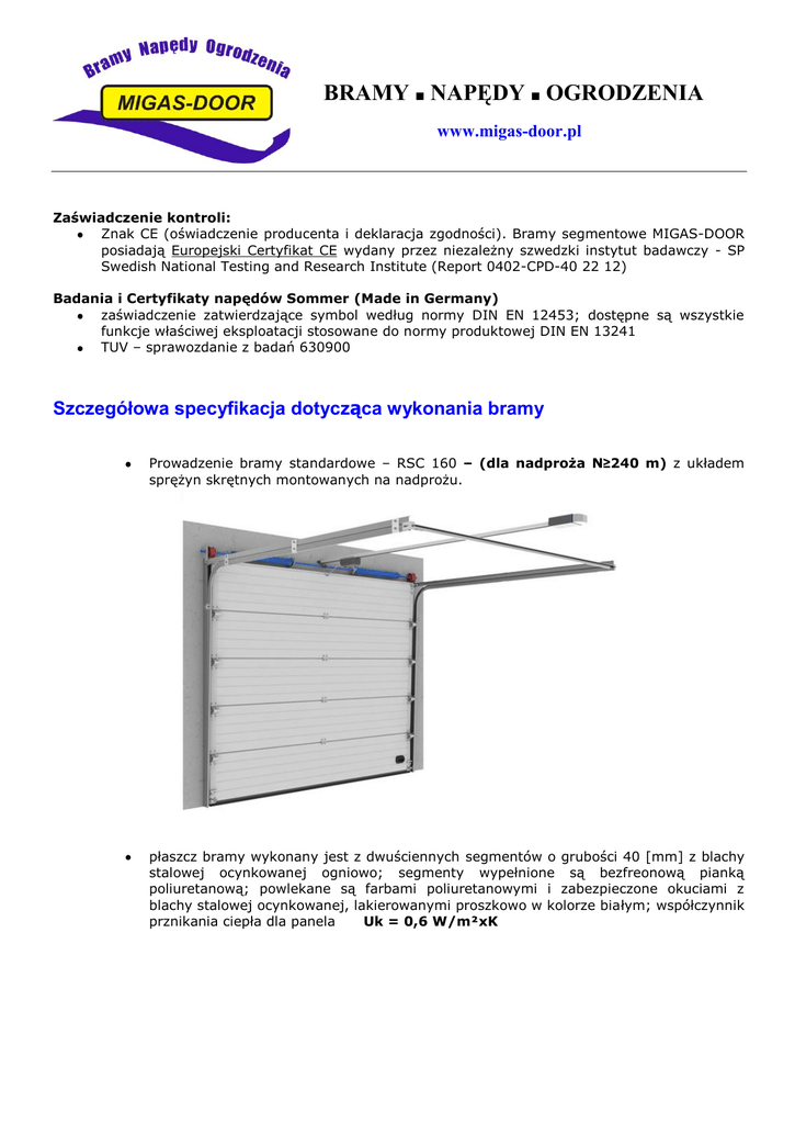 BRAMY ■ NAPĘDY ■ OGRODZENIA www.migas-door.pl Zaświadczenie kontroli: Znak CE (oświadczenie producenta i deklaracja zgodności). Bramy segmentowe MIGAS-DOOR posiadają Europejski Certyfikat CE wydany przez niezależny szwedzki instytut badawczy - SP Swedish National Testing and Research Institute (Report 0402-CPD-40 22 12) Badania i Certyfikaty napędów Sommer (Made in Germany) zaświadczenie zatwierdzające symbol według normy DIN EN 12453; dostępne są wszystkie funkcje właściwej eksploatacji stosowane do normy produktowej DIN EN 13241 TUV – sprawozdanie z badań 630900 Szczegółowa specyfikacja dotycząca wykonania bramy Prowadzenie bramy standardowe – RSC 160 – (dla nadproża N≥240 m) z układem sprężyn skrętnych montowanych na nadprożu. płaszcz bramy wykonany jest z dwuściennych segmentów o grubości 40 [mm] z blachy stalowej ocynkowanej ogniowo; segmenty wypełnione są bezfreonową pianką poliuretanową; powlekane są farbami poliuretanowymi i zabezpieczone okuciami z blachy stalowej ocynkowanej, lakierowanymi proszkowo w kolorze białym; współczynnik prznikania ciepła dla panela Uk = 0,6 W/m²xK Równoważenie ciężaru płaszcza bramy - dwie sprężyny skrętne zamontowane na stalowym wale wyposażonym w łożyska kulkowe. Zarówno wał jak i sprężyny są zabezpieczone antykorozyjnie poprzez ocynkowanie. Układ ten efektywnie wspomaga podnoszenie i opuszczanie płaszcza bramy. W standardzie sprężyny skrętne o wytrzymałości 30 000 cykli otwarć. konstrukcja nośna/ prowadnice - wykonane są z elementów stalowych, ocynkowanych. Prowadnice profilowane są na kształt uniemożliwiający wysunięcie poruszających się w nich rolek tocznych. Boczne prowadnice są wyposażone w uszczelki do których przylega płaszcz bramy, gdy jest ona w pozycji zamkniętej. uszczelnienia - brama wyposażona w specjalny system uszczelek - EPDM montowanych na całym obwodzie płaszcza bramy oraz w system uszczelnień międzysegmentowych. W dolnym segmencie zamontowana jest uszczelka przylegająca do podłoża, a w górnym uszczelka przylegająca do nadproża, gdy brama jest w pozycji zamkniętej. Rolki prowadzące są łożyskowane, wykonane z wysokoudarowego tworzywa, odpornego na ścieranie. zawiasy środkowe i boczne (pomiędzy segmentami) są stalowe, ocynkowane i mocowane specjalnymi wkrętami do segmentu. W zawiasach osadzono suwliwe rolki łożyskowawe, prowadzące płaszcz bramy w prowadnicach. Dodatkowy rząd zawiasów wzmacniających (zamontowanych na środku bramy) Uchwyt garażowy Zabezpieczenia ▪ Zabezpieczenie (finger protection) – specjalnie wyprofilowane segmenty które uniemożliwiają przytrzaśnięcie palców w miejscu ich łączenia. ▪ Zabezpieczenie przed pęknięciem sprężyny (ZPPS)– hamulce bezpieczeństwa uniemożliwiające opadnięcie płaszcza bramy w przypadku pęknięcia sprężyn skrętnych. Typ panela – przetłoczenia niskie Kolor płaszcza bramy RAL 8014 brązowy RAL 9016 biały RAL 9006 srebrny Sposób otwierania: Brama wyposażona w napęd elektryczny niemieckiej firmy Sommer, model APERTO Bluemagic sterowany drogą radiową za pomocą pilotów oraz włącznika klawiszowego usytuowanego na bocznej ścianie. W skład zestawu Sommer, APERTO Bluemagic wchodzi: - silnik - moduł szyny jezdnej - centrala sterująca z wbudowanym odbiornikiem radiowym - 2 piloty 2-kanałowe - włącznik guzikowy Układ sterowania radiowego z wyjątkowo bezpiecznym system kodowania - Somloq Rollingcode - odporny na próby skanowania kodu (długość kodu wynosi 66 bitów co daje 74 tryliony kombinacji). Poszukiwanie zaprogramowanego kodu na drodze skanowania trwałoby około 234 miliardy lat. - odporny na próby przechwytywania kodu – zabezpieczony przed podłuchem - przy każdym uruchomieniu kod ulega zmianie (System Rollingcode). Odtworzenie nagranego kodu jest zatem bezcelowe - zabezpieczony przed wykorzystaniem przez osoby nieupoważnione