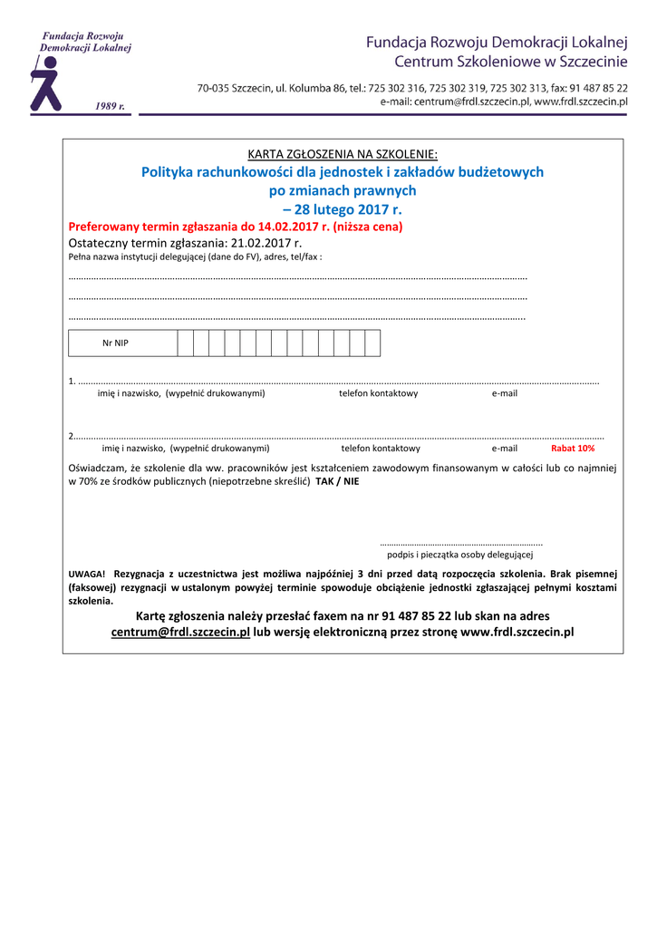 KARTA ZGŁOSZENIA NA SZKOLENIE: Polityka rachunkowości dla jednostek i zakładów budżetowych po zmianach prawnych – 28 lutego 2017 r. Preferowany termin zgłaszania do 14.02.2017 r. (niższa cena) Ostateczny termin zgłaszania: 21.02.2017 r. Pełna nazwa instytucji delegującej (dane do FV), adres, tel/fax : ………………………………………………………………………………………………………………………………………………………………. ………………………………………………………………………………………………………………………………………………………………. ……………………………………………………………………………………………………………………………………………………………... - Nr NIP - - 1. ................................................................................................................................................................................................................ imię i nazwisko, (wypełnić drukowanymi) telefon kontaktowy e-mail 2.................................................................................................................................................................................................................... imię i nazwisko, (wypełnić drukowanymi) telefon kontaktowy e-mail Rabat 10% Oświadczam, że szkolenie dla ww. pracowników jest kształceniem zawodowym finansowanym w całości lub co najmniej w 70% ze środków publicznych (niepotrzebne skreślić) TAK / NIE ……………………….………………………………….... podpis i pieczątka osoby delegującej UWAGA! Rezygnacja z uczestnictwa jest możliwa najpóźniej 3 dni przed datą rozpoczęcia szkolenia. Brak pisemnej (faksowej) rezygnacji w ustalonym powyżej terminie spowoduje obciążenie jednostki zgłaszającej pełnymi kosztami szkolenia. Kartę zgłoszenia należy przesłać faxem na nr 91 487 85 22 lub skan na adres [email protected] lub wersję elektroniczną przez stronę www.frdl.szczecin.pl
