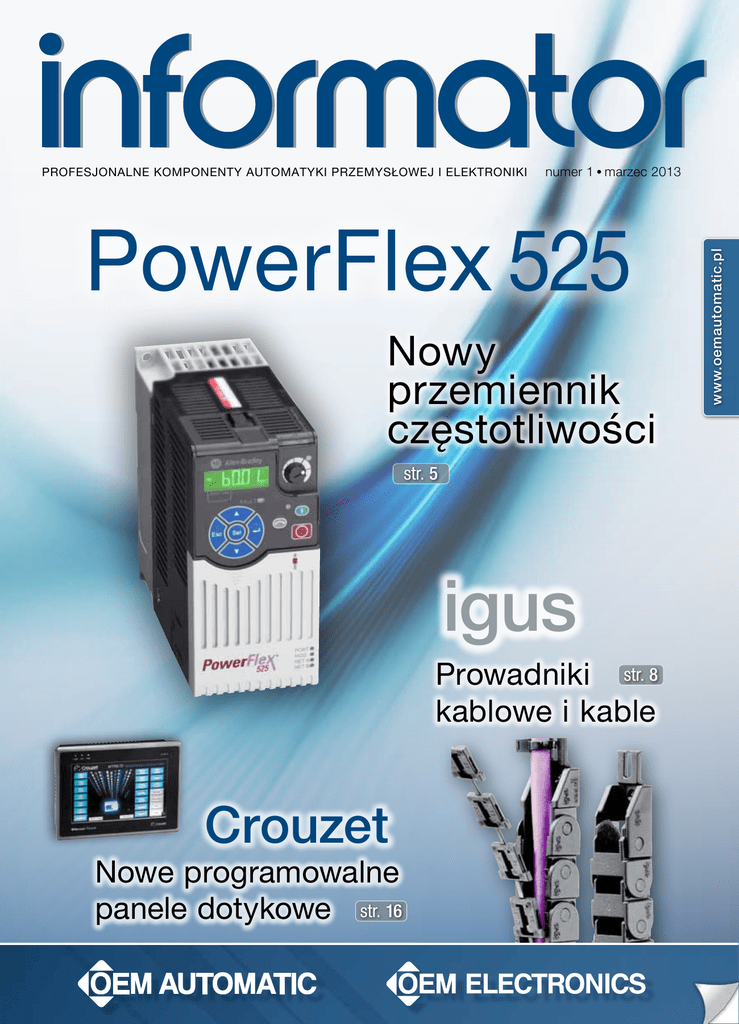numer 1 • marzec 2013 PowerFlex 525 Nowy przemiennik częstotliwości str. 5 igus Prowadniki str. 8 kablowe i kable Crouzet Nowe programowalne panele dotykowe str. 16 www.oemautomatic.pl PROFESJONALNE KOMPONENTY AUTOMATYKI PRZEMYSŁOWEJ I ELEKTRONIKI Słowo wstępu… Mariusz Matejczyk W numerze Managing Director, OEM Automatic Sp. z o.o. Wiosenna edycja Informatora zbiega się z kilkoma ważnymi wydarzeniami w naszej firmie. Po dwóch latach intensywnych działań poświęconych prezentacji i pozycjonowaniu produktów na stronie internetowej powróciliśmy do prac nad papierowymi wydaniami katalogów. Pierwszym efektem naszych starań jest publikacja katalogu „Komponenty Bezpieczeństwa Maszyn” dostępnego już dla Państwa. PowerFlex 525 ROCKWELL AUTOMATION, strona 5 Po wielu latach prac udało nam się stworzyć wydanie, które w swojej treści obejmuje zarówno zagadnienia dotyczące doboru elementów, jak również zawiera sporą dawkę wiedzy na temat bezpieczeństwa systemowego. Do końca roku planujemy jeszcze wydanie katalogów poświęconych komponentom do montażu panelowego oraz komponentom związanym z regulacją ciśnienia i przepływu. Katalogi można zamawiać poprzez naszą stronę internetową: www.oemautomatic.pl lub telefonicznie. Przekaźnik bezpieczeństwa GSR GLP ROCKWELL AUTOMATION, strona 6 Ponadto, miło mi Państwa poinformować o rozpoczęciu współpracy z firmą igus – liderem rynku prowadników kablowych. Korzystając z pozytywnych doświadczeń współpracy pomiędzy naszymi firmami w Skandynawii, postanowiliśmy wesprzeć dystrybucję tych produktów na terenie Polski. Analizując nowości produktowe, które pojawiły się w naszej ofercie, chciałbym zwrócić Państwa uwagę na nową generację przemienników częstotliwości PowerFlex. Jestem przekonany, że ich zalety techniczne oraz rozsądna cena znajdą uznanie użytkowników. Prowadniki kablowe i kable IGUS, strona 8 Zachęcam do zapoznania się z tą ofertą. Mariusz Matejczyk, Managing Director Switche ethernetowe RED LION, strona 9 numer 1 • marzec 2013 PowerFlex Nowy przemiennik częstotliwości str. 5 igus Prowadniki str. 8 kablowe i kable Crouzet Nowe programowalne panele dotykowe str. 16 2 O E M informator 2 0 1 2 - 3 www.oemautomatic.pl PROFESJONALNE KOMPONENTY AUTOMATYKI PRZEMYSŁOWEJ I ELEKTRONIKI Redakcja OEM Automatic wydawca OEM Automatic Sp. z o.o. manager Mariusz Matejczyk redakcja Aleksandra Klimek l nakład 3500 egz. siedziba ul. Postępu 2, 02-676 Warszawa tel. (+48 22) 863 27 22 l fax (+48 22) 863 27 24 internet www.oemautomatic.pl l [email protected] www. oemautomatic . pl Stacje lutownicze JBC, strona 16 y w o N ! g o l kat a Komponenty bezpieczeństwa maszyn Oddając do dyspozycji nowy katalog Komponentów Bezpieczeństwa, uwzględniliśmy Państwa sugestie. Przedstawiamy w nim kompleksową ofertę komponentów: zarówno tych niezbędnych do zapewnienia zgodności z wymaganiami zasadniczymi nowych maszyn, jak i z wymaganiami minimalnymi odnoszącymi się do maszyn modernizowanych. Mamy nadzieję, że nasz dział Bezpieczeństwa Maszyn okaże się pomocny w rozwiązywaniu Państwa problemów i realizowaniu najbardziej skomplikowanych zadań. Jeśli chcecie Państwo otrzymać nowy katalog bezpieczeństwa w wersji papierowej, prosimy o wypełnienie formularza na naszej stronie internetowej: www.oemautomatic.pl Nowa rodzina blokad Salus ze stali nierdzewnej do zastosowań w trudnych warunkach Szczegółowe informacje: Jarosław Kalista tel. +48 22 863 27 22 e-mail: [email protected] TLS-Z – nowa generacja wyłącznika TLS zapewniającego bezpieczeństwo na poziomie PLe Kurtyny Micro 400 w obudowie o stopniu ochrony IP69K, o średnicy tylko 29 mm GSR – nowa gama przekaźników bezpieczeństwa z konfigurowalna logiką Falowniki z funkcjami bezpieczeństwa SensaGuard – nowy bezdotykowy wyłącznik bezpieczeństwa O E M informator 2 0 1 3 - 1 www. oemautomatic . pl 3 Zmodernizowana rodzina przekaźników czasowych Chronos 2 Ciesząca się bardzo dużą popularnością rodzina przekaźników czasowych serii Chronos 2 doczekała się modernizacji. Zmiany zewnętrzne są zauważalne dzięki użyciu obudów wcześniej zastosowanych w przekaźnikach kontrolnych tego producenta. Większych modyfikacji dokonano wewnątrz – dzięki temu jeszcze bardziej wzrosła niezawodność przekaźników. Zapewne dobrą informacją dla aktualnych użytkowników Chronos 2 jest fakt, że zarówno wymiary, jak i rozmieszczenie zacisków na obudowie nie zostały zmienione. Nie ma zatem konieczności zmiany połączeń w istniejących projektach. Również oznaczenia typów pozostały takie same (np. MAR1, MUR3). Zmieniona jest tylko jedna cyfra w numerach katalogowych. Przykładowo, dotychczasowy numer katalogowy przekaźnika MUR1 to 88826105, a jego następcy, również MUR1, ale nowej generacji – 88827105. Fakty Opcja • Wielonapięciowe • Podłączenie czujników • Wielofunkcyjne lub jednofunkcyjne 3-przewodowych • Wyjścia przekaźnikowe lub SSR • Podłączenie zewnętrznego • Zakres nastaw od 0,1 s do 100 h zasilania do wejścia sterującego • Zaciski śrubowe lub sprężynowe • Sygnalizacja LED Szczegółowe informacje: Andrzej Kalata tel. +48 22 863 27 22 e-mail: [email protected] Zasilacze o mocy do 2400 W Firma Lutze wprowadziła do oferty zasilacze o mocy do 2400 W zasilane z sieci trójfazowej o napięciu 400–500 V. Do dyspozycji mamy dwa modele zasilaczy z napięciem wyjściowym 24 V DC oraz 48 V DC. Konstrukcja techniczna zasilaczy pozwala na połączenie do czterech urządzeń pracujących równolegle redundantnie. Monitorowanie pracy zasilacza jest możliwe dzięki: wyjściu przekaźnikowemu NO oraz analogowym sygnałom 0–10 V lub 4–20 mA, które są bezpośrednim odwzorowaniem wartości napięcia na wyjściu zasilacza. Zasilacze wyposażone są w klawisze funkcyjne, które dają możliwość dodatkowej regulacji. Wybrane funkcje prezentowane są na wy