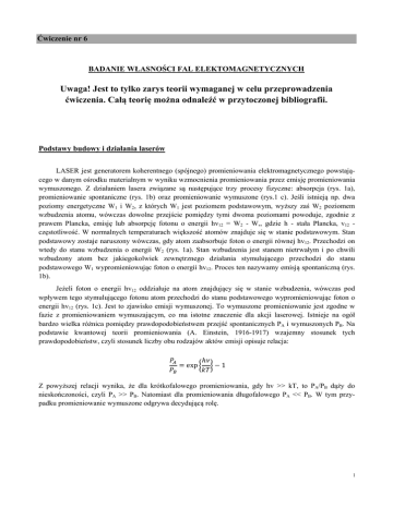 Ćwiczenie nr 6 BADANIE WŁASNOŚCI FAL ELEKTOMAGNETYCZNYCH Uwaga! Jest to tylko zarys teorii wymaganej w celu przeprowadzenia ćwiczenia. Całą teorię można odnaleźć w przytoczonej bibliografii. Podstawy budowy i działania laserów LASER jest generatorem koherentnego (spójnego) promieniowania elektromagnetycznego powstającego w danym ośrodku materialnym w wyniku wzmocnienia promieniowania przez emisję promieniowania wymuszonego. Z działaniem lasera związane są następujące trzy procesy fizyczne: absorpcja (rys. 1a), promieniowanie spontaniczne (rys. 1b) oraz promieniowanie wymuszone (rys.1 c). Jeśli istnieją np. dwa poziomy energetyczne W1 i W2, z których W1 jest poziomem podstawowym, wyższy zaś W2 poziomem wzbudzenia atomu, wówczas dowolne przejście pomiędzy tymi dwoma poziomami powoduje, zgodnie z prawem Plancka, emisję lub absorpcję fotonu o energii hv12 = W2 - W,, gdzie h - stała Plancka, v12 częstotliwość. W normalnych temperaturach większość atomów znajduje się w stanie podstawowym. Stan podstawowy zostaje naruszony wówczas, gdy atom zaabsorbuje foton o energii równej hv12. Przechodzi on wtedy do stanu wzbudzenia o energii W2 (rys. 1a). Stan wzbudzenia jest stanem nietrwałym i po chwili wzbudzony atom bez jakiegokolwiek zewnętrznego działania stymulującego przechodzi do stanu podstawowego W1 wypromieniowując foton o energii hv12. Proces ten nazywamy emisją spontaniczną (rys. 1b). Jeżeli foton o energii hv12 oddziałuje na atom znajdujący się w stanie wzbudzenia, wówczas pod wpływem tego stymulującego fotonu atom przechodzi do stanu podstawowego wypromieniowując foton o energii hv12 (rys. 1c). Jest to zjawisko emisji wymuszonej. To wymuszone promieniowanie jest zgodne w fazie z promieniowaniem wymuszającym, co ma istotne znaczenie dla akcji laserowej. Istnieje na ogół bardzo wielka różnica pomiędzy prawdopodobieństwem przejść spontanicznych PA i wymuszonych PB. Na podstawie kwantowej teorii promieniowania (A. Einstein, 1916-1917) wzajemny stosunek tych prawdopodobieństw, czyli stosunek liczby obu rodzajów aktów emisji opisuje relacja: = exp ℎ −1 Z powyższej relacji wynika, że dla krótkofalowego promieniowania, gdy hv >> kT, to PA/PB dąży do nieskończoności, czyli PA >> PB. Natomiast dla promieniowania długofalowego PA << PB. W tym przypadku promieniowanie wymuszone odgrywa decydującą rolę. 1 Rys. 1. Przejście atomu ze stanu początkowego (I) do stanu końcowego (II). Czarny punkt symbolizuje stan energetyczny w jakim znajduje się atom. Dalsze objaśnienia w tekście. Gdy w danym ośrodku więcej atomów znajduje się w stanie wzbudzonym (tzw. rozkład antyboltzmanowski), mówimy o inwersji obsadzeń (osiąga się ją poprzez wzbudzanie atomów zwane pompowaniem optycznym). Jeśli w ośrodku, w którym istnieje inwersja obsadzeń pojawi się wymuszający foton o energii hv12, wówczas występuje emisja wymuszona. W tej sytuacji dany ośrodek wypromieniowuje znacznie większa ilość fotonów niż ich absorbuje. Zjawisko to nazywa się wzmocnieniem kwantowym i stanowi podstawę działania lasera. Powyższy opis jest skrótowy; niżej podana zostanie precyzyjniejszy opis mechanizmu powstawania akcji laserowej. Najważniejszym warunkiem pojawienia się akcji laserowej jest istnienie, oprócz poziomu podstawowego, przynajmniej dwóch poziomów wzbudzonych wyższych, z których jeden jest poziomem „metatrwałym" tzn. dłużej żyjącym (ok. 10-4 s), natomiast drugi powinien być poziomem krótkożyjącym (ok. 10-7 s). Wówczas światło lampy błyskowej wzbudza atomy chromu (jak ma to miejsce w przypadku np. lasera rubinowego) lub atomy cynku (w laserze półprzewodnikowym GaAs) do wysokiego i stosunkowo szerokiego pasma poziomów AE3 (rys. 2). Są to poziomy krótkożyjące, więc jony „spadają" niezwłocznie do niższego, metatrwałego (długożyjące- go) poziomu E2. Na tym poziomie gromadzą się, aż jakiś przypadkowy (spontaniczny) foton (z pędem równoległym do osi podłużnej warstwy aktywnej) nie wymusi emisji całej lawiny fotonów. Rys. 2. Schemat poziomów energetycznych atomu i mechanizm powstawania akcji laserowej. Używany w naszej pracowni laser półprzewodnikowy stanowi dioda półprzewodnikowa z arsenku galu (GaAs), sporządzona z półprzewodnika typu n, do którego wprowadzono drogą dyfuzji domieszkowe atomy cynku lub kadmu (akceptory), uzyskując w ten sposób warstwę n-p. Na warstwę n-p napylone są z obu stron cienkie warstwy srebra, stanowiące elektrody. Całość jest osadzona na pozłacanej ptytce 2 molibdenowej: zapewnia ona dobre odprowadzenie energii cieplnej. Najmniejsze powierzchnie diody (sam laser ma wymiary 0.1 na 0.3 na 1.0 mm), po wyszlifowaniu, stanowią swoistą wnękę rezonansową, w której powstaje fala stojąca o następujących częstotliwościach rezonansowych: vn = nc/2d, gdzie n - liczba naturalna, c - prędkość światła, d = 1.0 mm. W przypadku wykorzystywanego w tym ćwiczeniu lasera długość fali emitowanego promieniowania laserowego wynosi 650 nm. Najważniejszymi charakterystykami lasera półprzewodnikowego są: a) zależność gęstości powierzchniowej mocy promieniowania lasera od gęstości prądu przepływającego przez diodę (rys. 3). gęstość prądu Rys. 3. zależność gęstości powierzchniowej mocy promieniowania od gęstości prądu płynącego przez diodę. Prezentowany wykres odpowiada ustalonej temperaturze (w tym przypadku 4.2 K da lasera GaAs). W punkcie wykresu, w którym tangens nachylenia stycznej do wykresu osiąga wartość maksymalną progowa wartość prądu da lasera GaAs osiąga wartość 103 A/cm2 i intensywność promieniowania rośnie najszybciej wraz ze wzrostem gęstości prądu. Taki wzrost informuje o istnieniu akcji laserowej. Wraz ze wzrostem temperatury krzywe charakterystyki przesuwają się w prawo ale ich kształt pozostaje podobny do przedstawionego na rys. 3. Dla przykładowej temperatury 77K progow