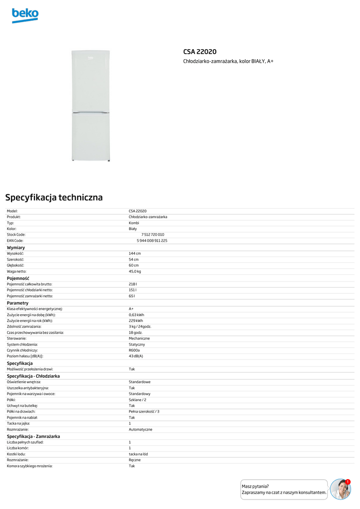 CSA 22020 Chłodziarko-zamrażarka, kolor BIAŁY, A+ Specyfikacja techniczna Model: CSA 22020 Produkt: Chłodziarko-zamrażarka Typ: Kombi Kolor: Biały Stock Code: 7 512 720 010 EAN Code: 5 944 008 911 225 Wymiary Wysokość: 144 cm Szerokość: 54 cm Głębokość: 60 cm Waga netto: 45,0 kg Pojemność Pojemność całkowita brutto: 218 l Pojemność chłodziarki netto: 151 l Pojemność zamrażarki netto: 65 l Parametry Klasa efektywności energetycznej: A+ Zużycie energii na dobę (kWh): 0,63 kWh Zużycie energii na rok (kWh): 229 kWh Zdolność zamrażania: 3 kg / 24godz. Czas przechowywania bez zasilania: 18 godz. Sterowanie: Mechaniczne System chłodzenia: Statyczny Czynnik chłodniczy: R600a Poziom hałasu [dB(A)]: 43 dB(A) Specyfikacja Możliwość przełożenia drzwi: Tak Specyfikacja - Chłodziarka Oświetlenie wnętrza: Standardowe Uszczelka antybakteryjna: Tak Pojemnik na warzywa i owoce: Standardowy Półki: Szklane / 2 Uchwyt na butelkę: Tak Półki na drzwiach: Pełna szerokość / 3 Pojemnik na nabiał: Tak Tacka na jajka: 1 Rozmrażanie: Automatyczne Specyfikacja - Zamrażarka Liczba pełnych szuflad: 1 Liczba komór: 1 Kostki lodu: tacka na lód Rozmrażanie: Ręczne Komora szybkiego mrożenia: Tak Masz pytania? Zapraszamy na czat z naszym konsultantem. 1 Technologie Klasa energetyczna A+ Produkty Beko posiadające klasę energetyczną A+ nie tylko przyczyniają się do podreperowania rodzinnego budżetu, ale również dbają o środowisko naturalne. Modele z klasą A+ zużywają jeszcze mniej energii niż identyczne modele w klasie A. Przezroczyste Szuflady Zamrażalnika Przednia część szuflady zamrażalnika zrobiona jest z przeźroczystego materiału tak, że doskonale widać, jakie produkty znajdują się w środku szuflady bez konieczności wysuwania jej. Icebank - Komora lodowa Wbudowana w zamrażalnik komora lodowa zapewnia dogodne miejsce do przechowywania kostek lodu oraz do mrożenia małych owoców. Pojemnik na nabiał Pojemnik umieszczony na górze drzwi chłodziarki, dzięki przeźroczystym ściankom zapewnia idealne miejsce do przechowywania produktów mlecznych, chroniąc je przed wyschnięciem. Uchwyt na butelki Uchwyt na butelki zawieszony obok szklanych półek jest idealnym rozwiązaniem na wykorzystanie przestrzeni pomiędzy dwiema pólkami. Uszczelka antybakteryjna - chłodzenie Uszczelki w drzwiach zwykle trudno utrzymać w czystości, co czyni z nich doskonałe środowisko dla rozwoju bakterii. Dzięki dodatkowi substancji antybakteryjnych, uszczelki nie tylko same pozostają wolne od drobnoustrojów, ale tworzą antybakteryjną barierę chroniącą wnętrze chłodziarki przed niepożądanymi mikroorganizmami.